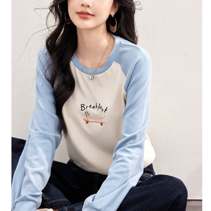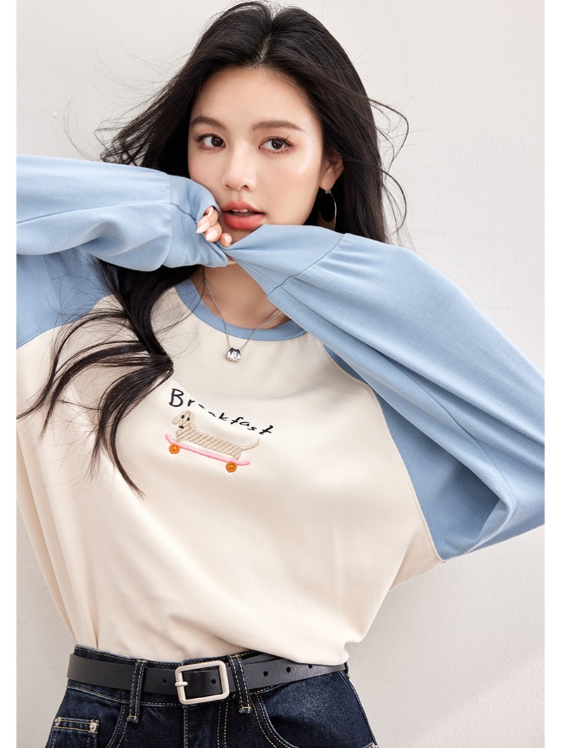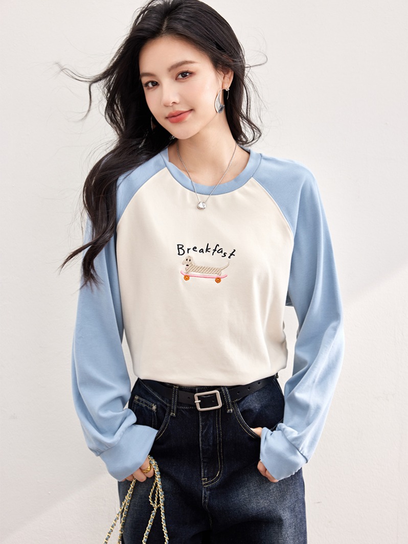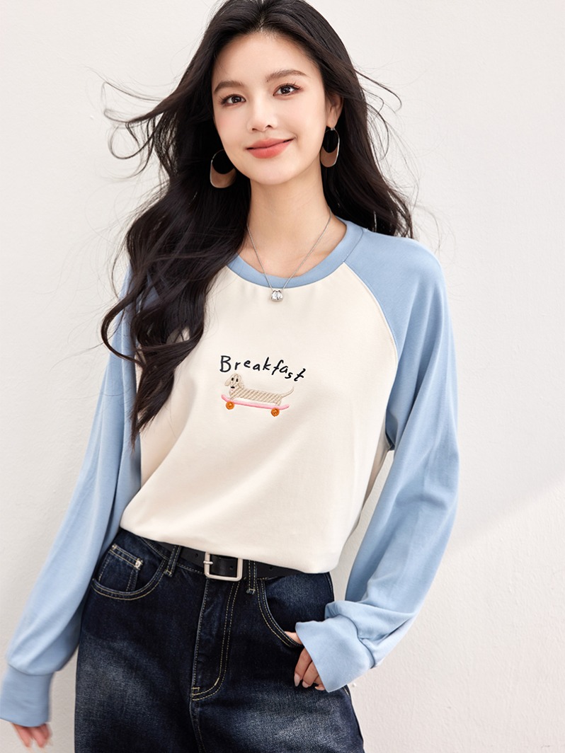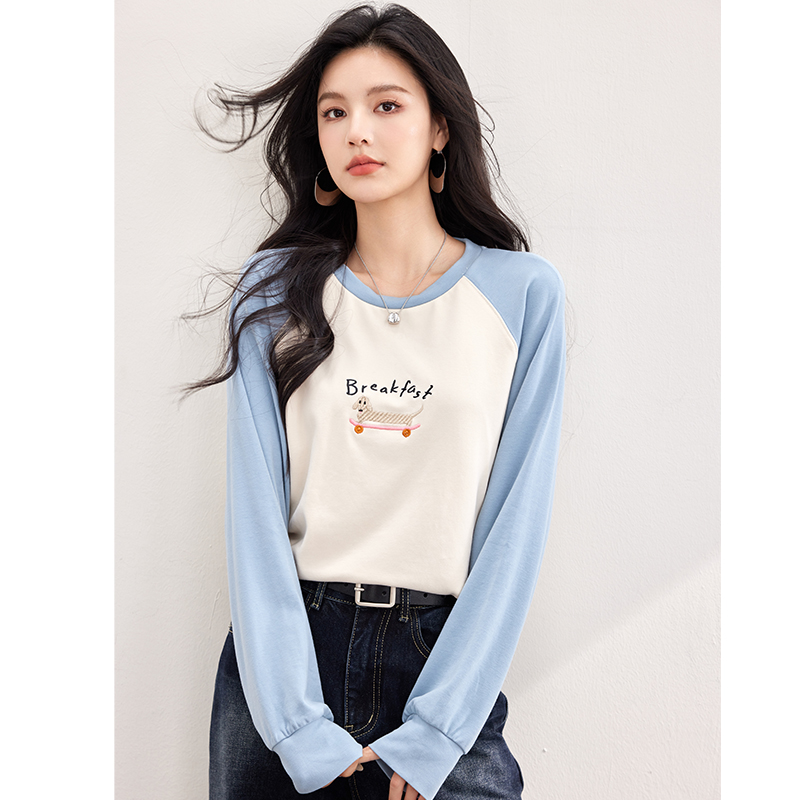 FA55045# 春款刺绣插肩袖拼色T恤圆领显瘦上衣 服裝批發女裝批發服飾貨源