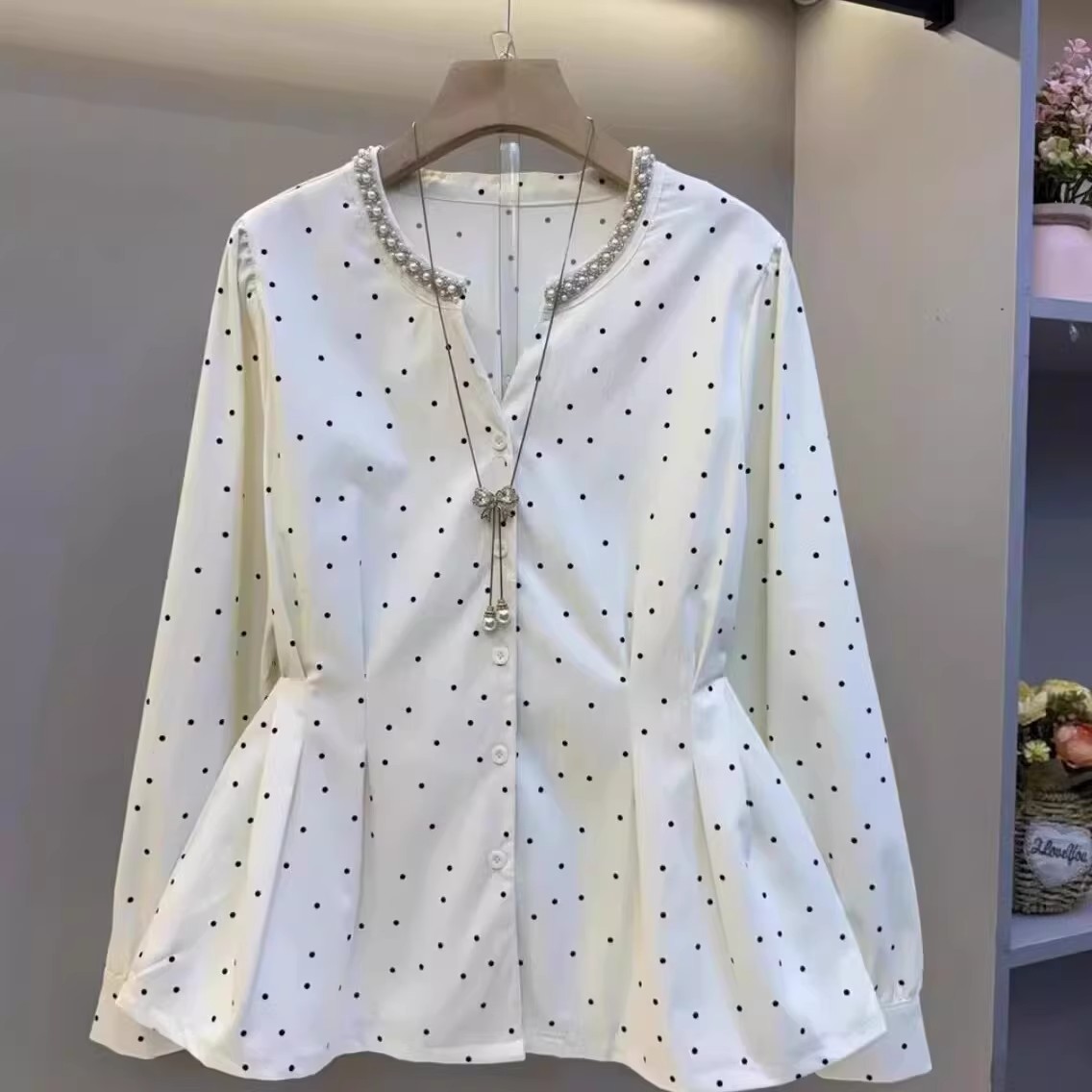 FA55069# 大码春秋款韩系波点长袖衬衫女胖MM重工艺领口钉珠设计感显瘦上衣 服裝批發女裝批發服飾貨源