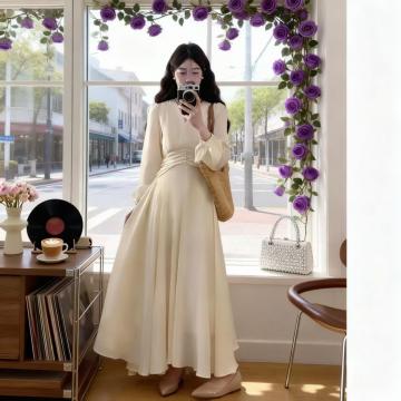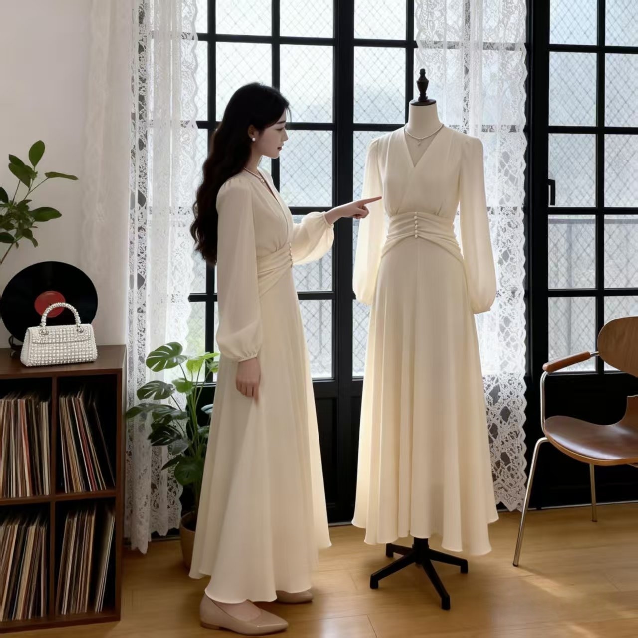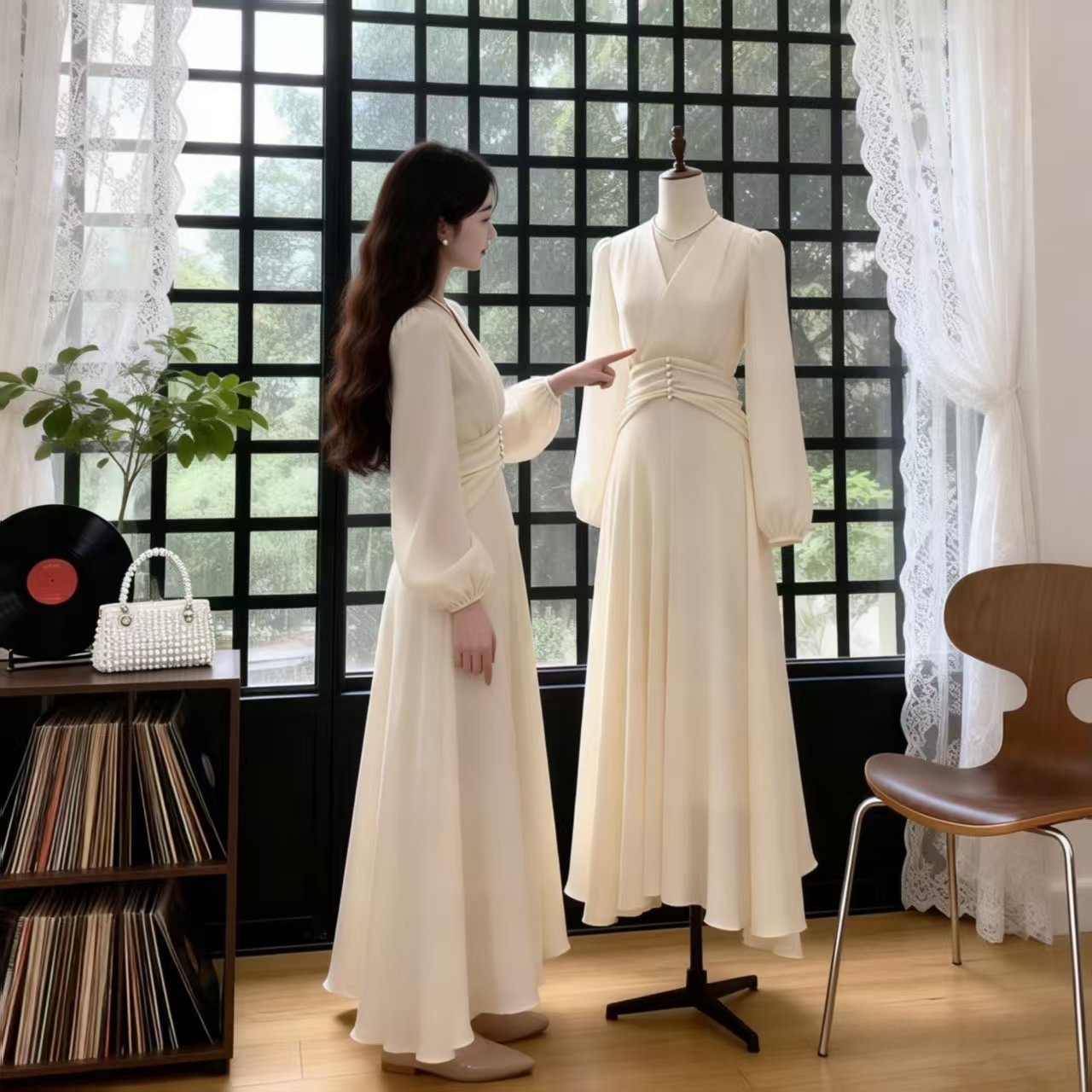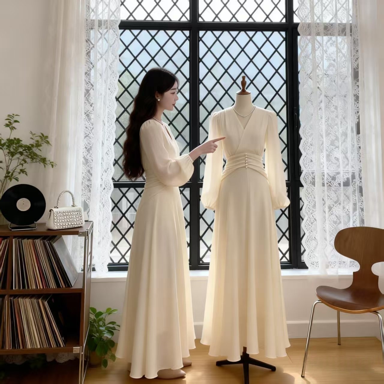 FA55134# 修身显瘦长袖秋冬装法式优雅V领雪纺长裙新款收腰大摆连衣裙 服裝批發女裝批發服飾貨源