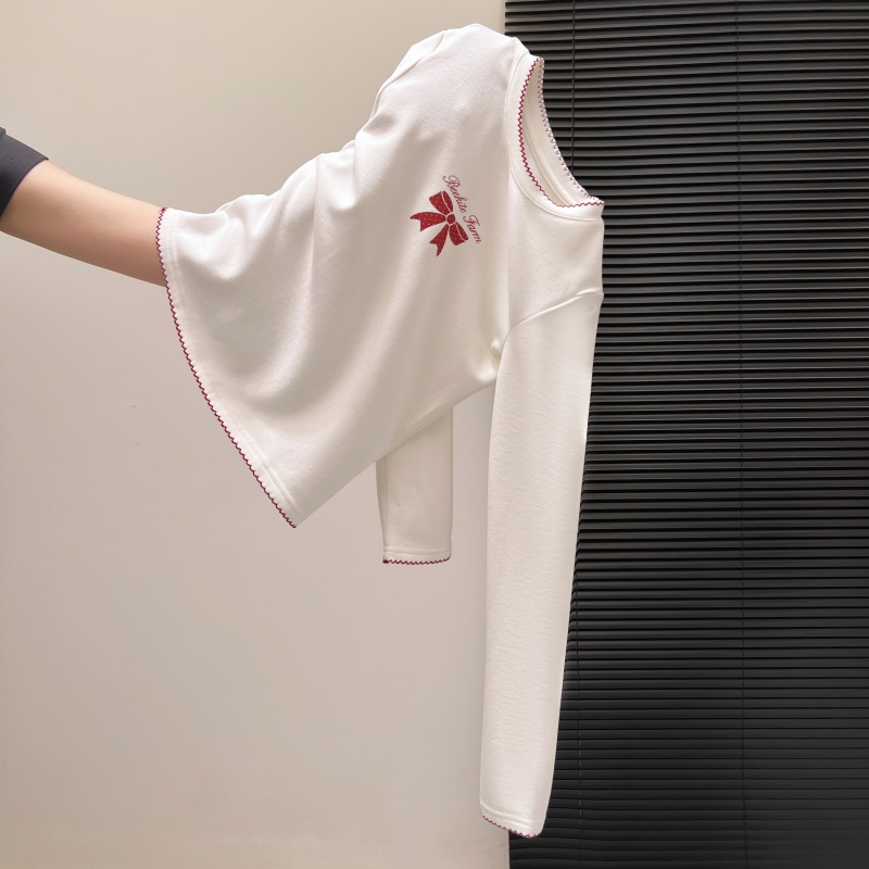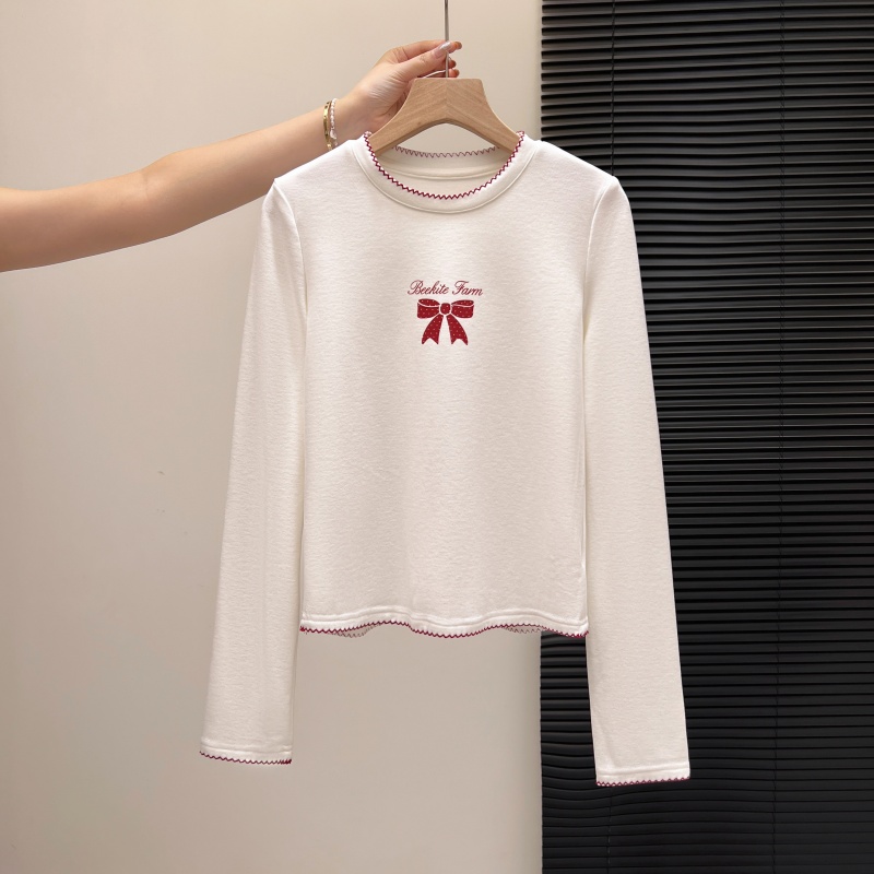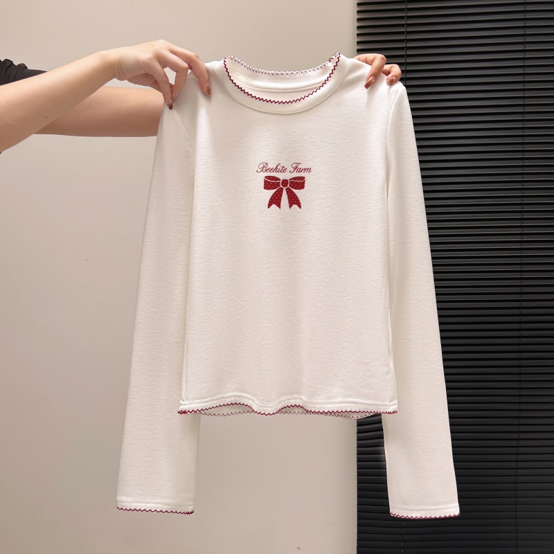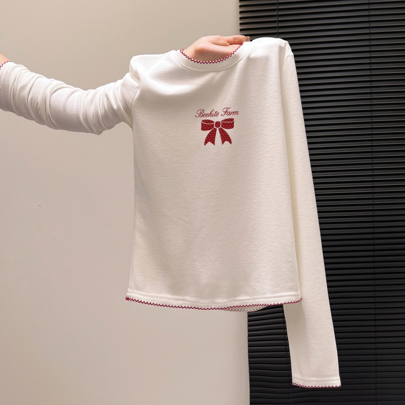 FA55160# 白色秋冬款圆领蝴蝶结印花打底衫内搭加绒长袖T恤修身上衣女 服裝批發女裝批發服飾貨源