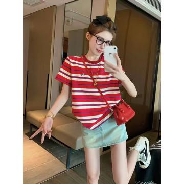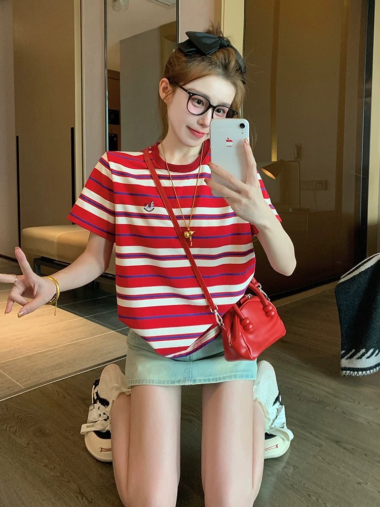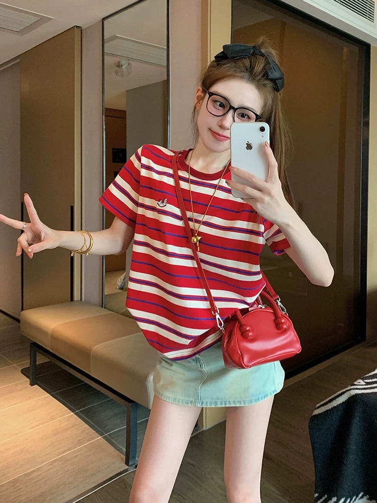 FA55189# 红色条纹短袖t恤女新款夏季美式复古宽松正肩刺绣小马上衣ins 服裝批發女裝批發服飾貨源