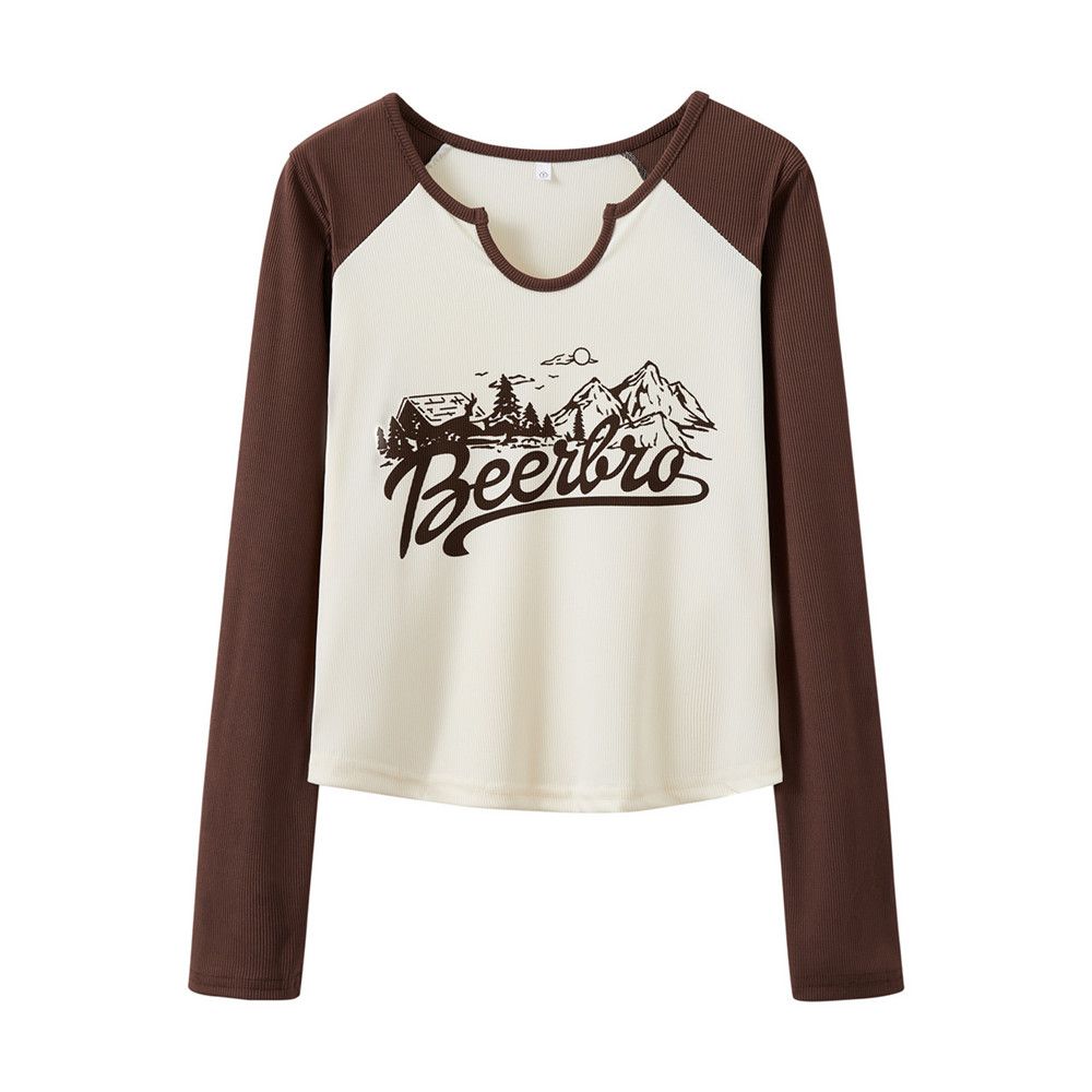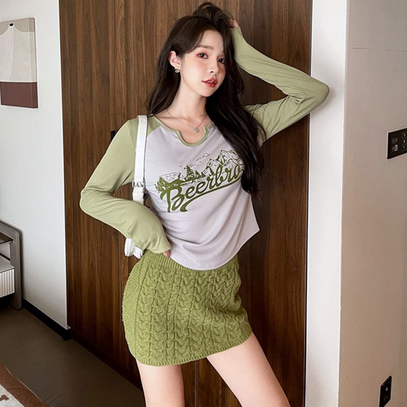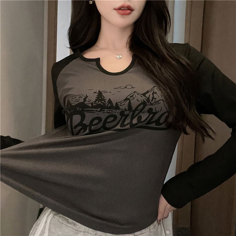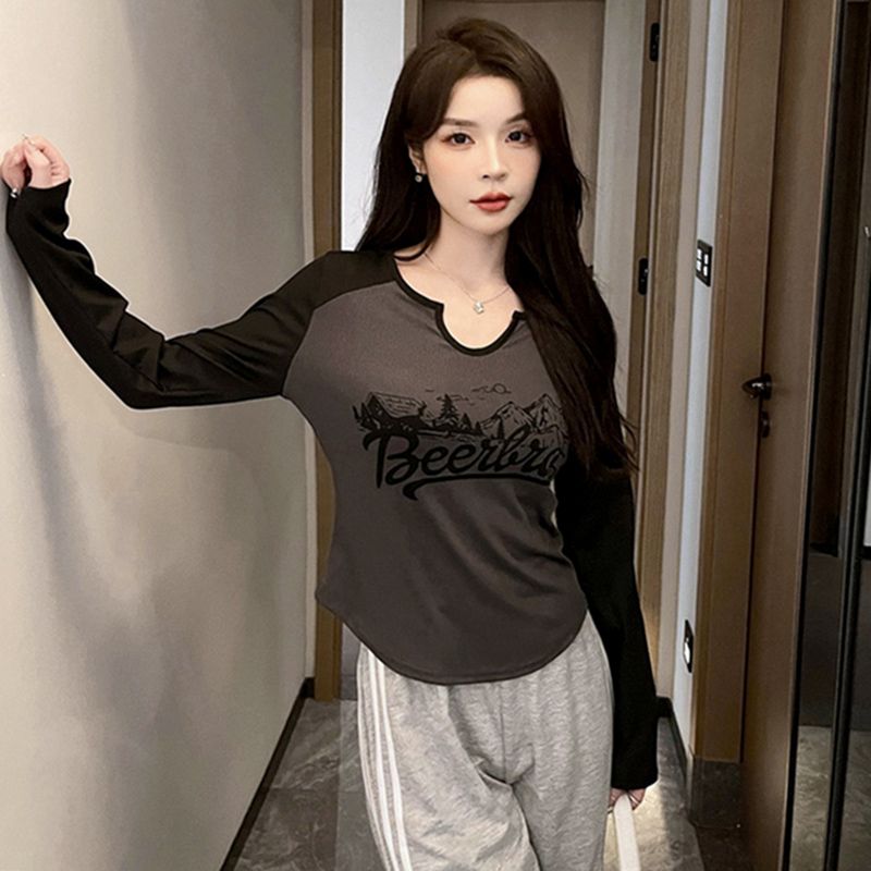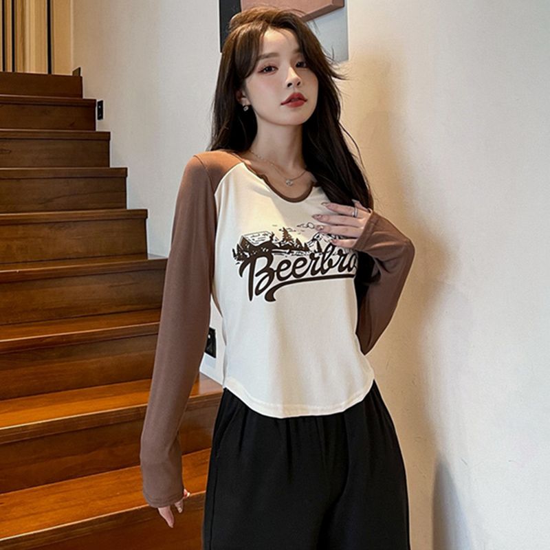 FA55202# 撞色正肩长袖T恤女打底衫秋冬季爆款字母印花内搭短款上衣 服裝批發女裝批發服飾貨源