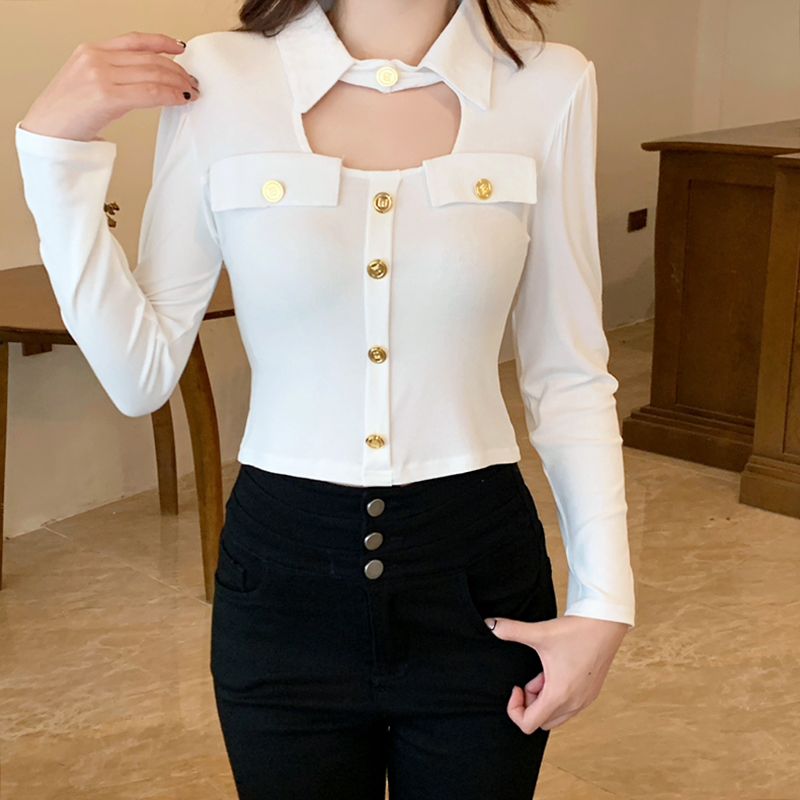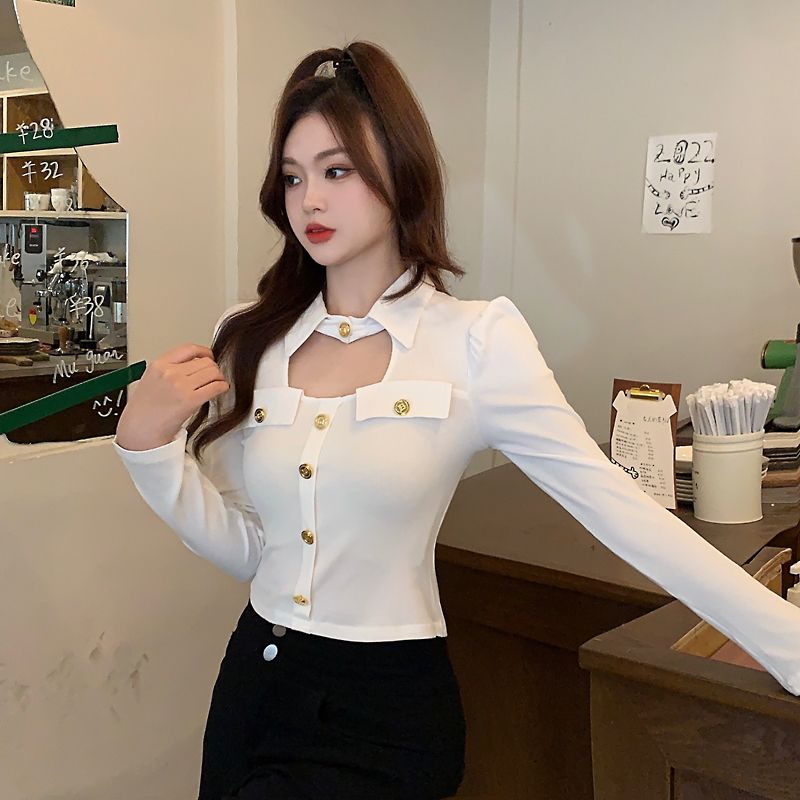 FA55203# 设计感小众小心机金属扣POLO领修身长袖T恤女秋冬新款上衣 服裝批發女裝批發服飾貨源