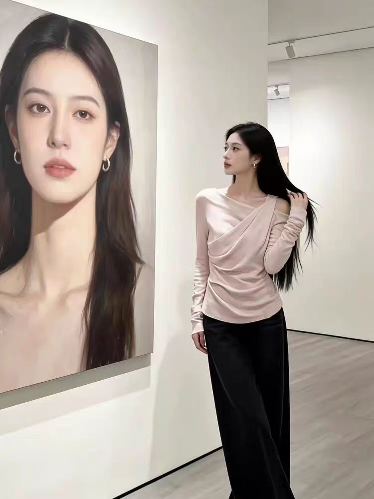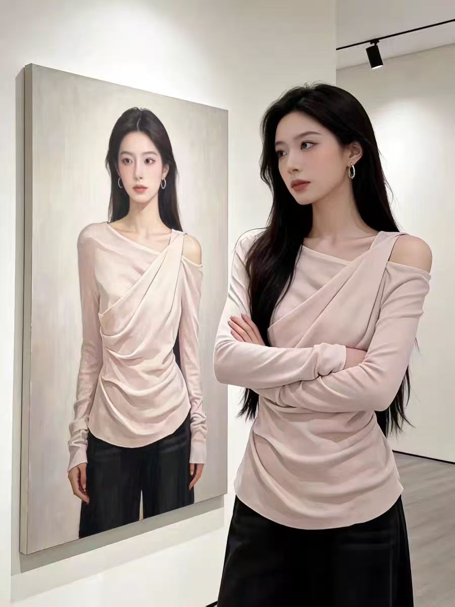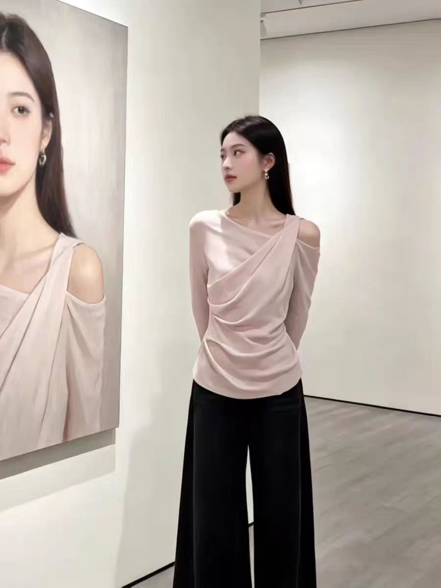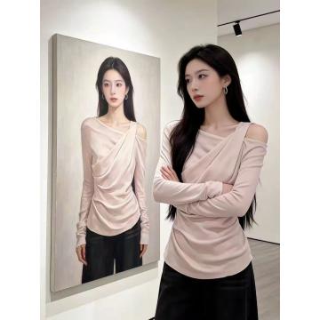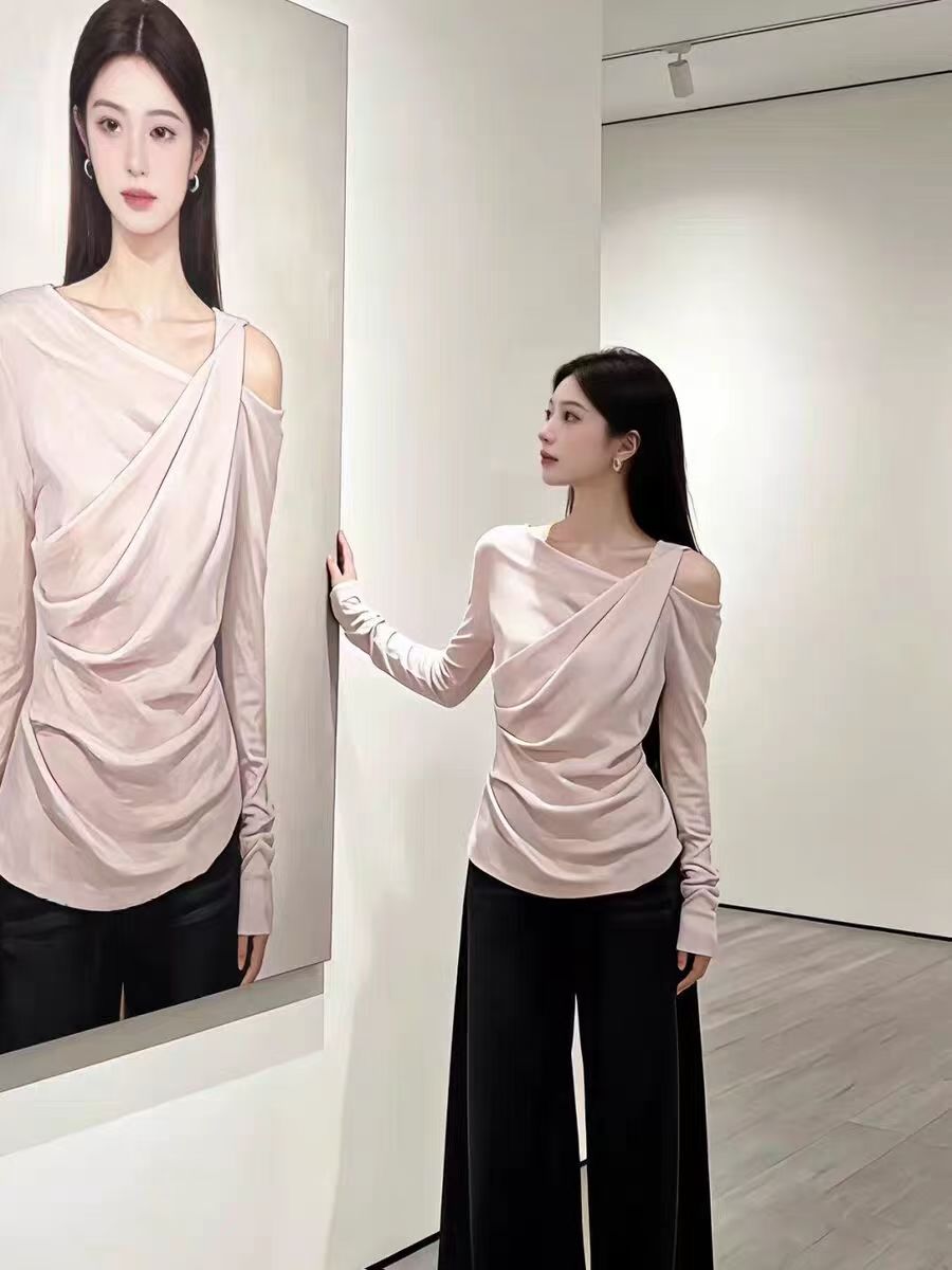 FA55226# 韩系纯欲风长袖T恤女修身显瘦高级感露肩上衣 服裝批發女裝批發服飾貨源
