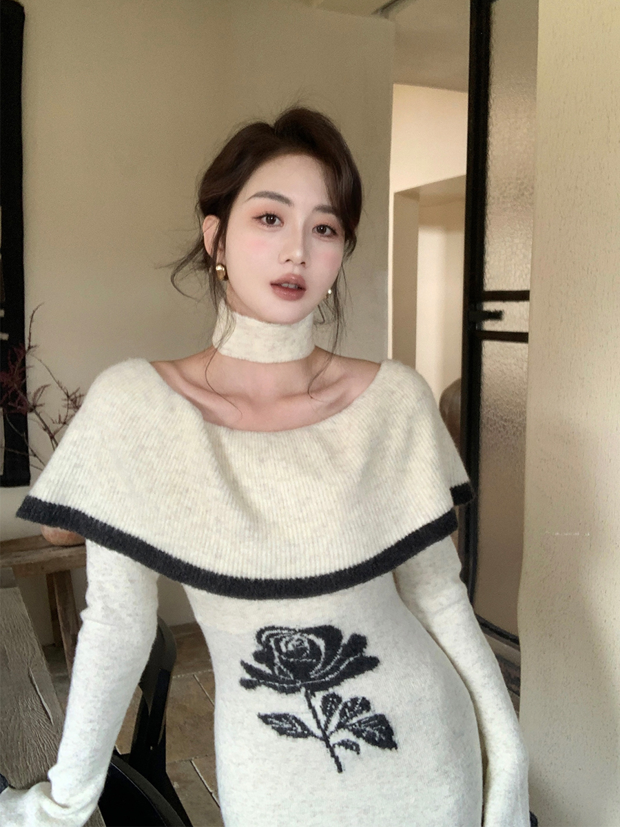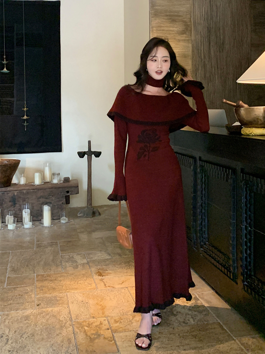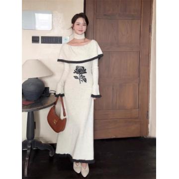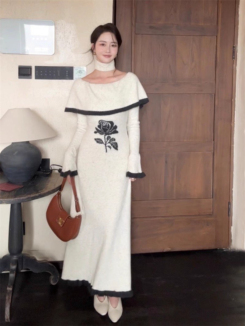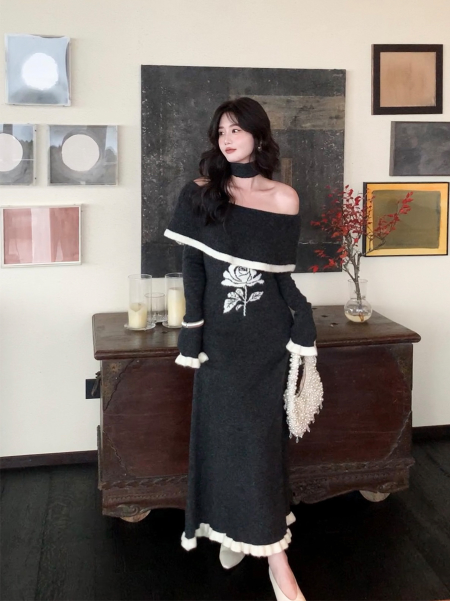 FA55239# 韩国一字领斜肩针织毛衣连衣裙春季喇叭袖轻熟优雅风法式长裙 服裝批發女裝批發服飾貨源
