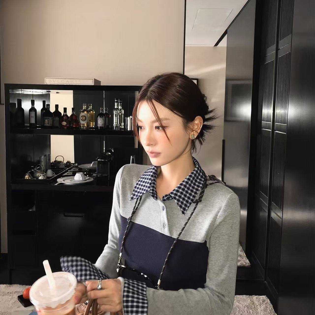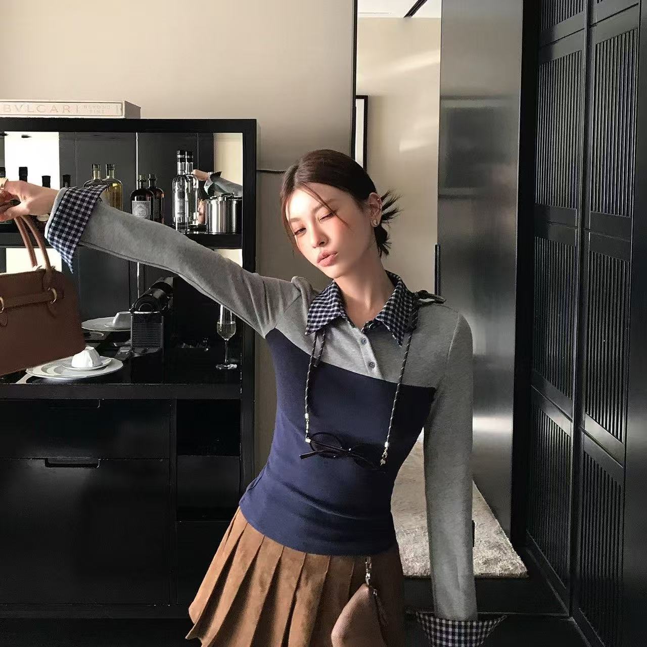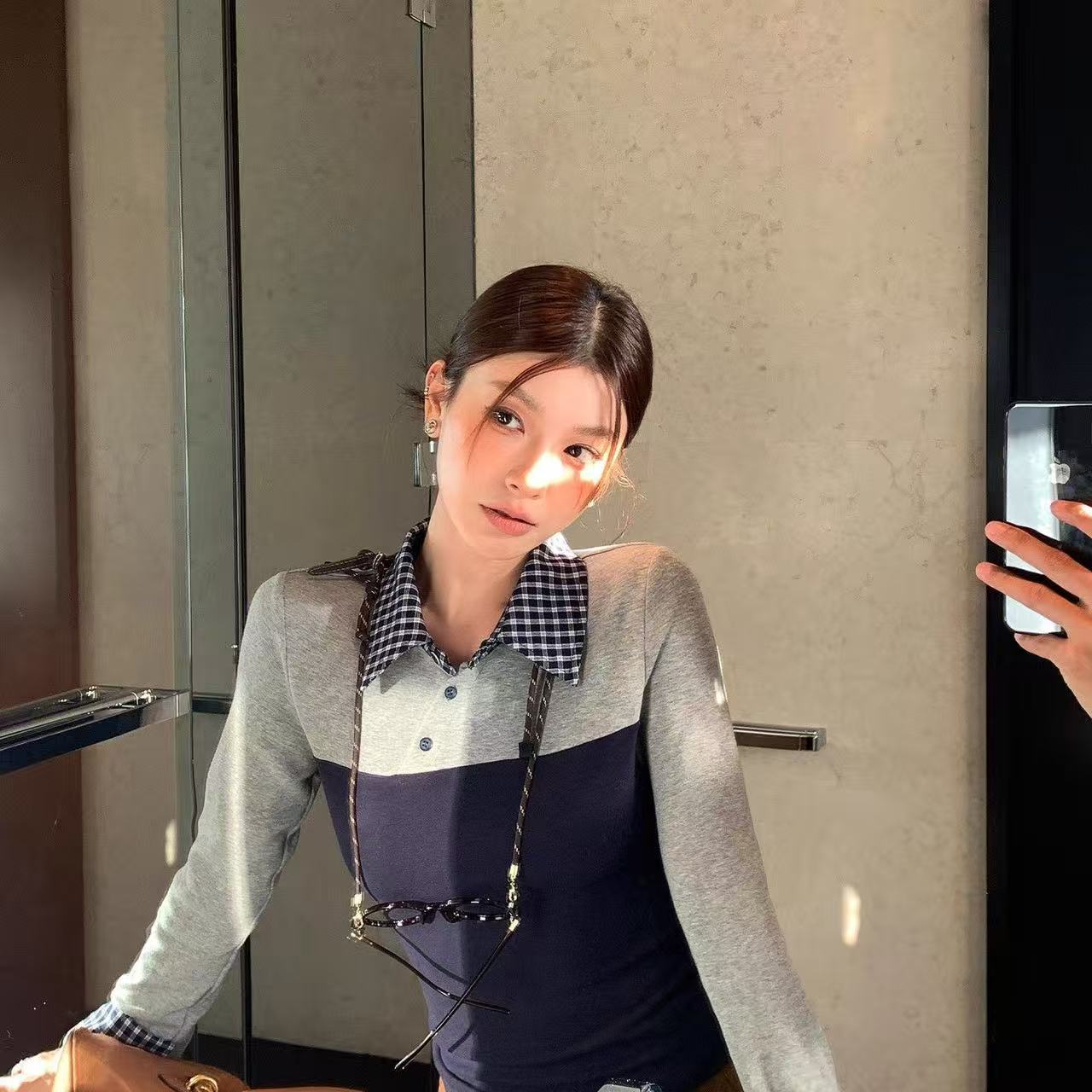 FA55284# 学院艺术生miu里miu气拼接撞色修身格子长袖T恤 服裝批發女裝批發服飾貨源