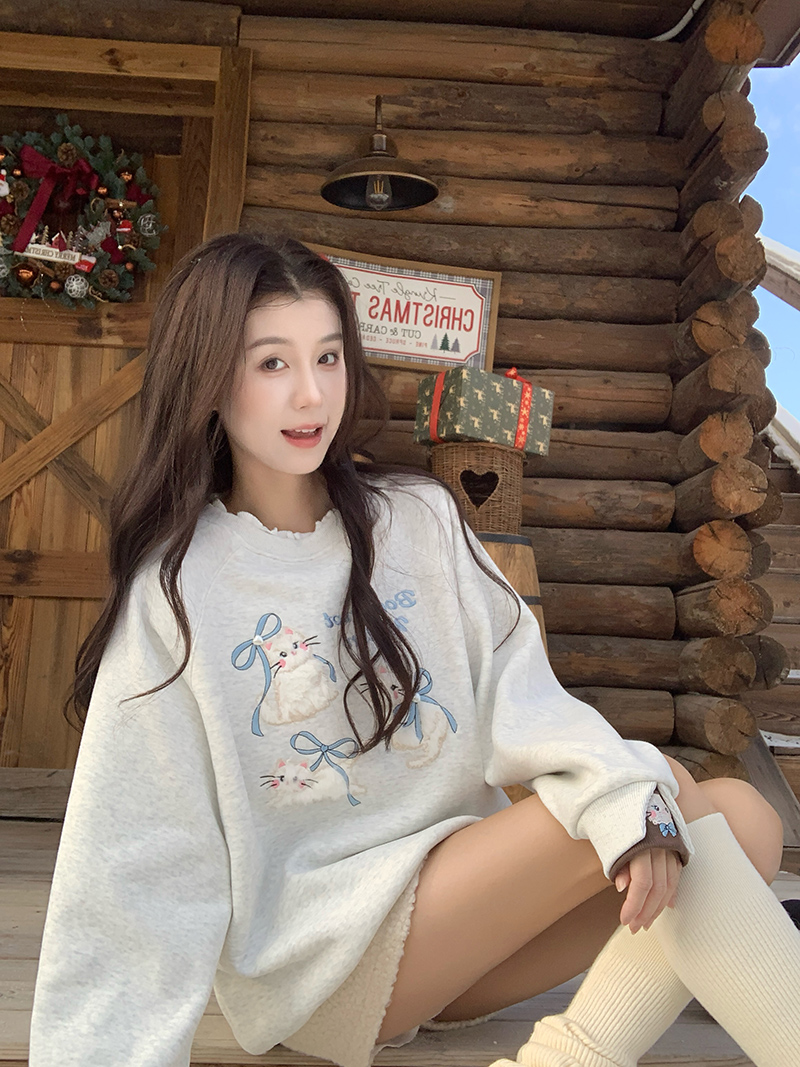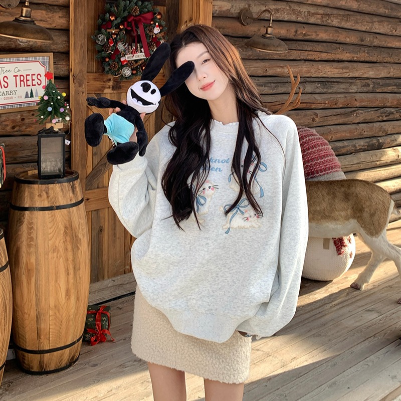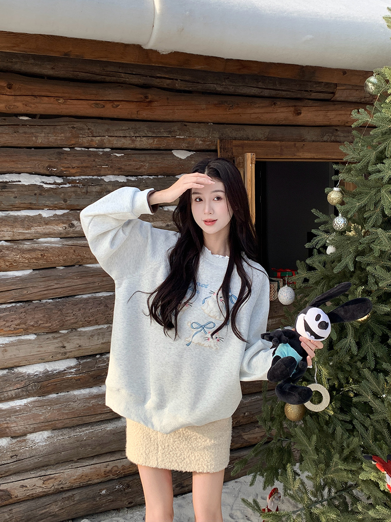 加绒卫衣秋冬潮新款宽松假两件刺绣花蝴蝶结圆领保暖上衣 服裝批發女裝批發服飾貨源