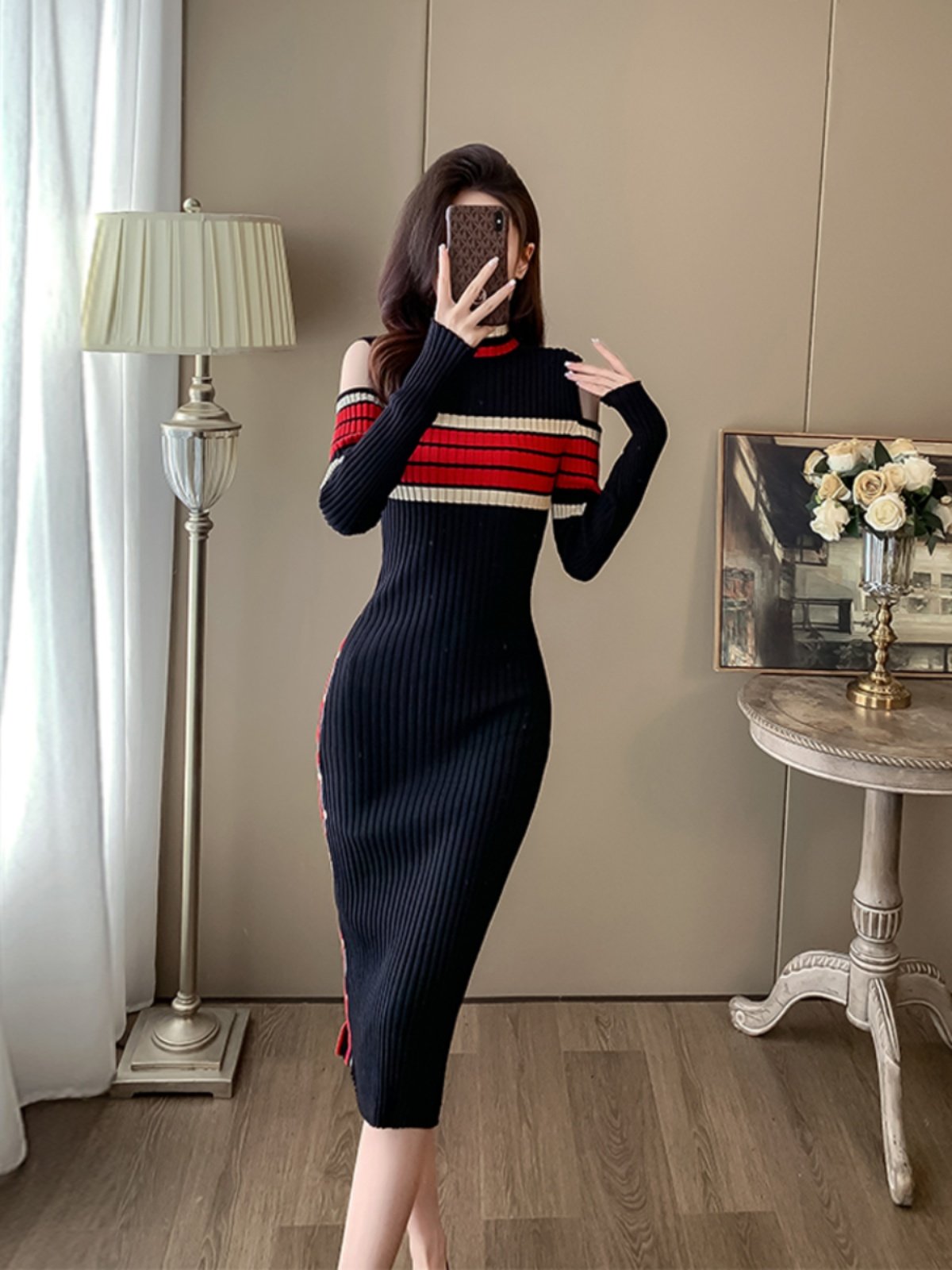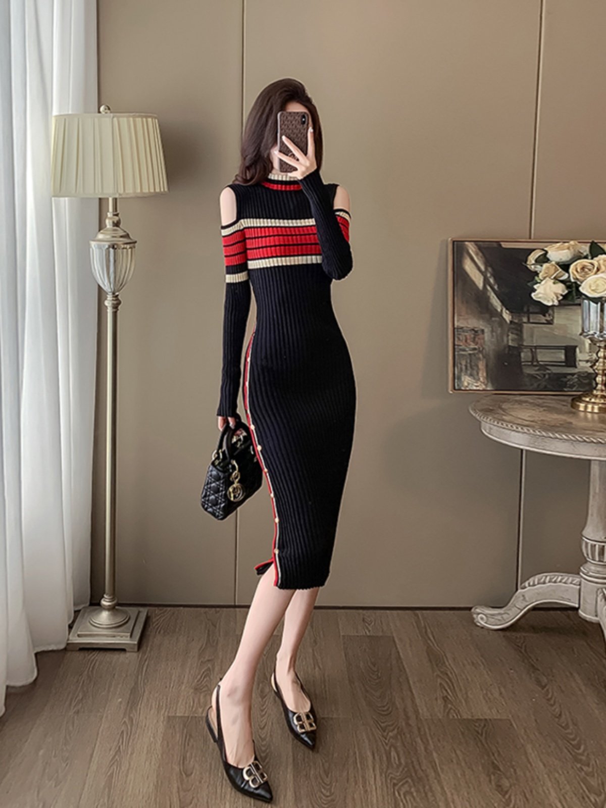 FA55550# 韩国露肩条纹开叉针织毛衣连衣裙女春夜店风小心机纯欲OL法式长裙 服裝批發女裝批發服飾貨源