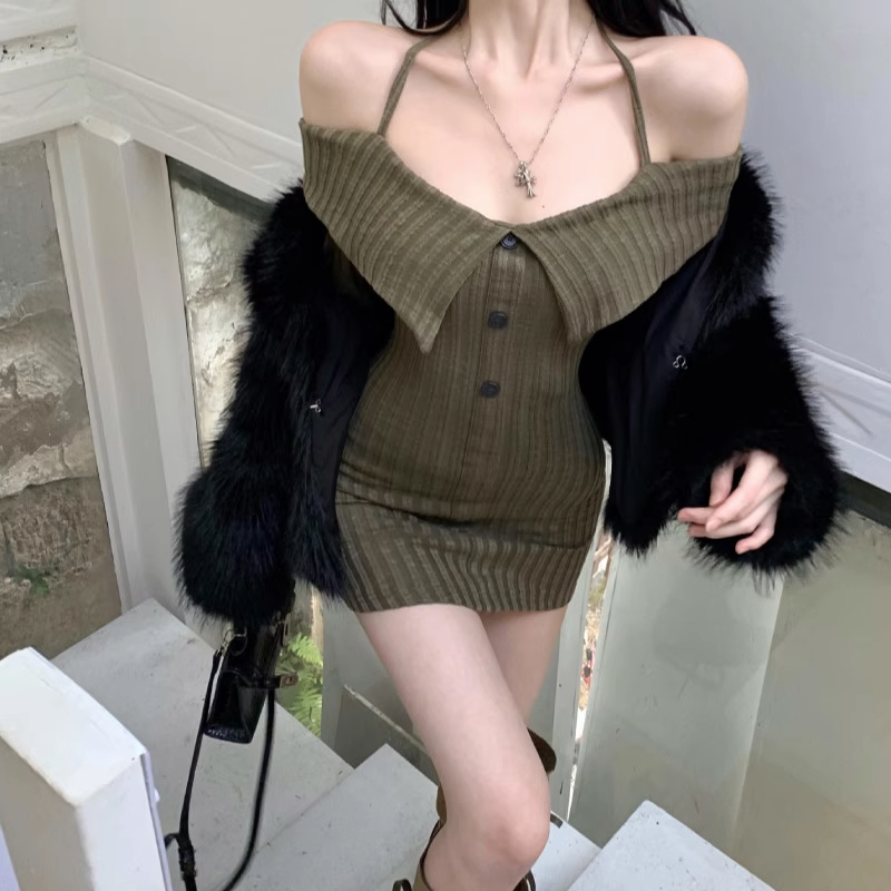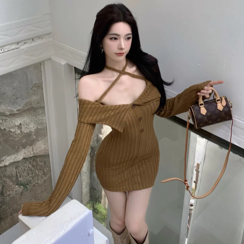 FA55556# 纯欲性感翻边一字领露背挂脖长袖连衣裙女秋季收腰显瘦针织包臀裙 服裝批發女裝批發服飾貨源