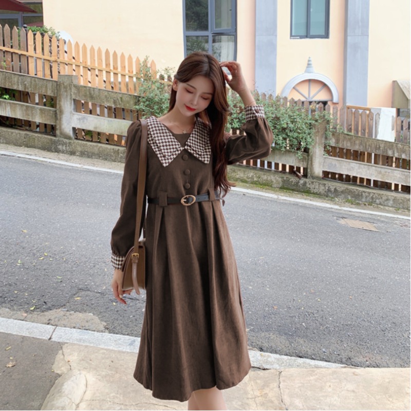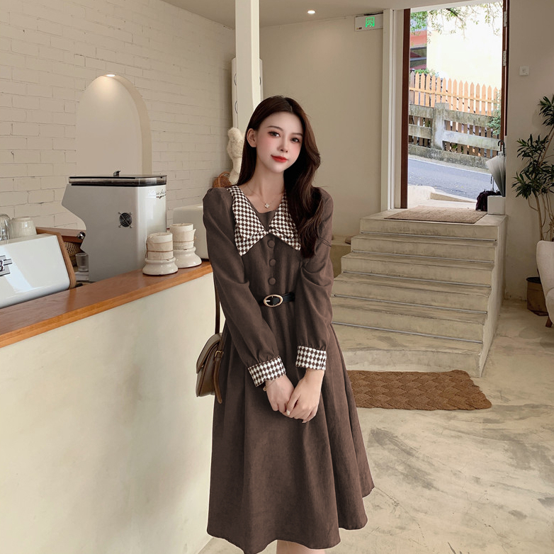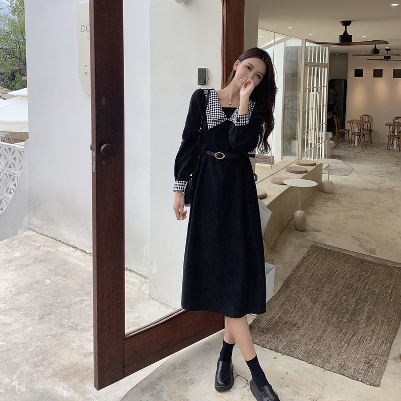 FA55557# 秋冬新款高级感赫本撞色收腰打底连衣裙显瘦领法式时尚气质中长裙 服裝批發女裝批發服飾貨源