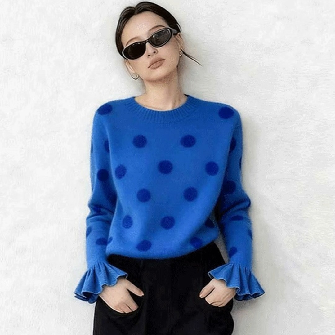 FA55567# -蓝色波点毛衣女款喇叭袖针织衫可外穿超好看上衣 服裝批發女裝批發服飾貨源