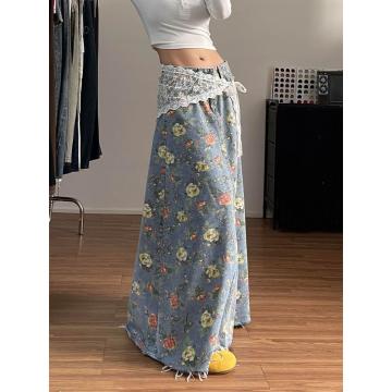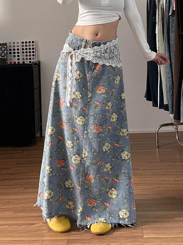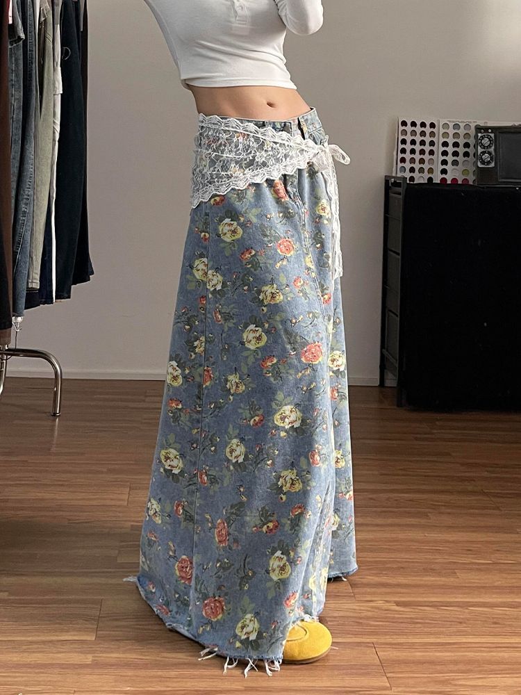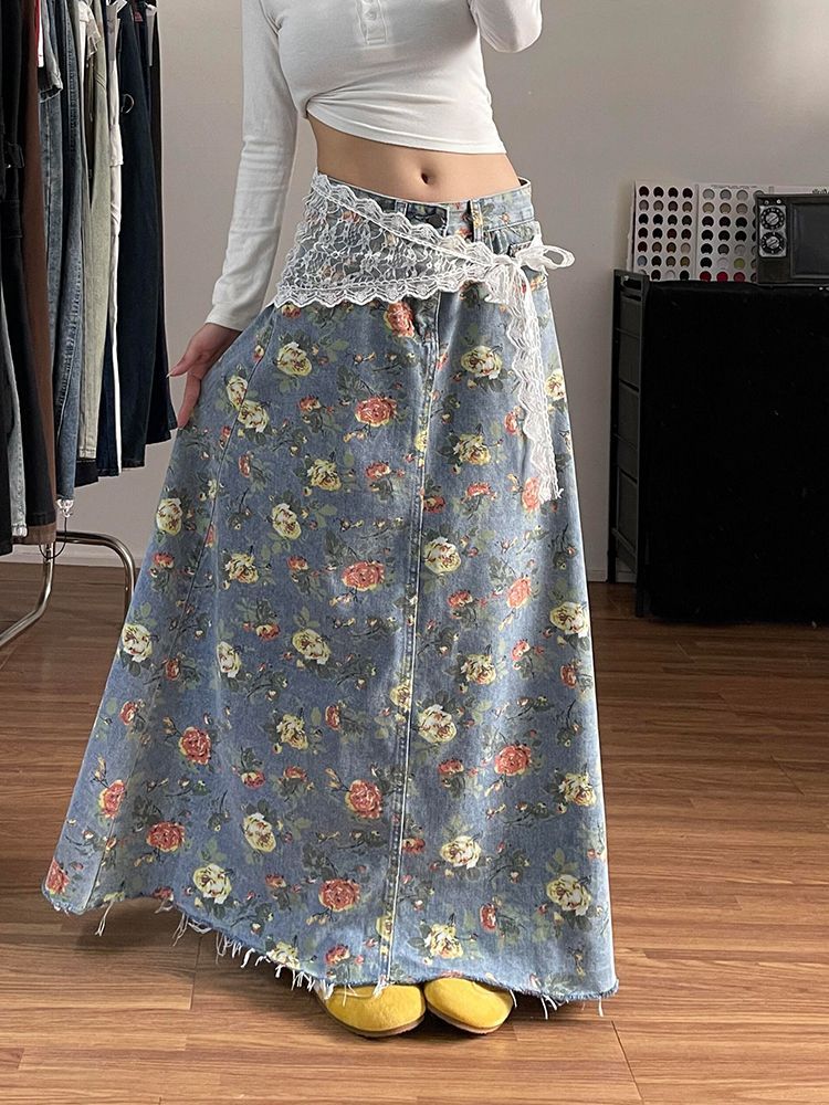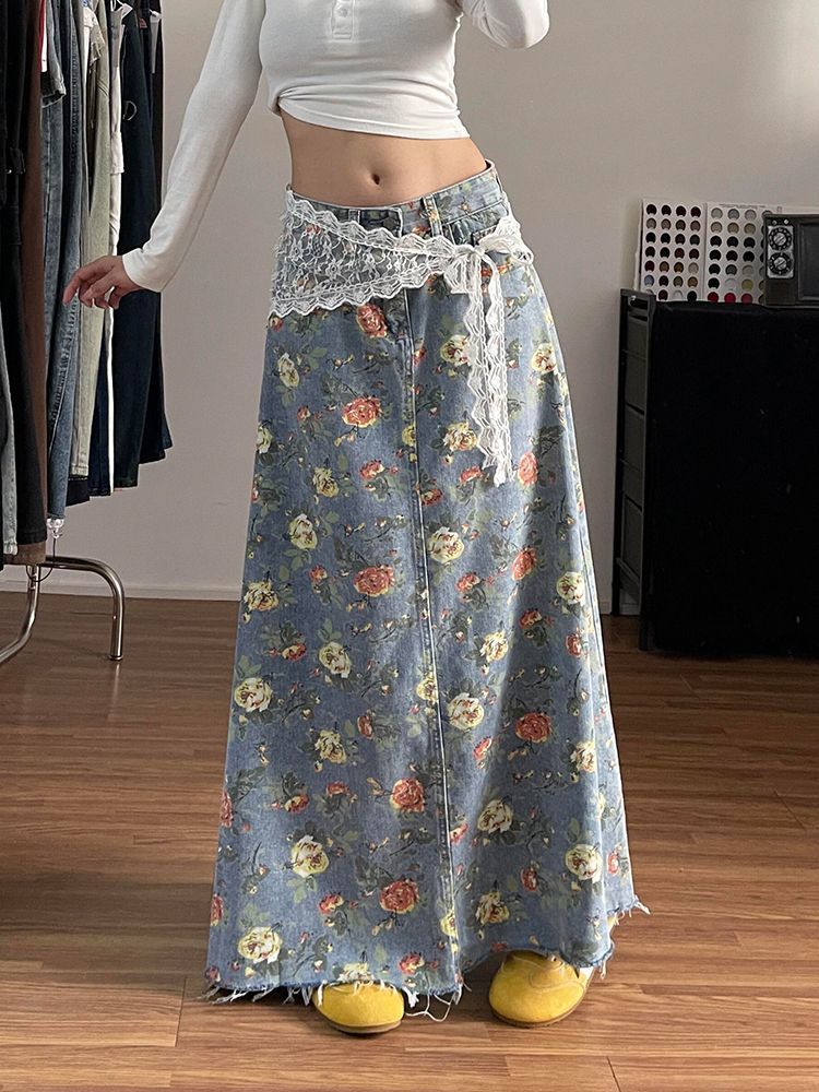 美式高街辣妹设计感满印花朵牛仔半身裙子女时尚洋气百搭显瘦长裙 服裝批發女裝批發服飾貨源
