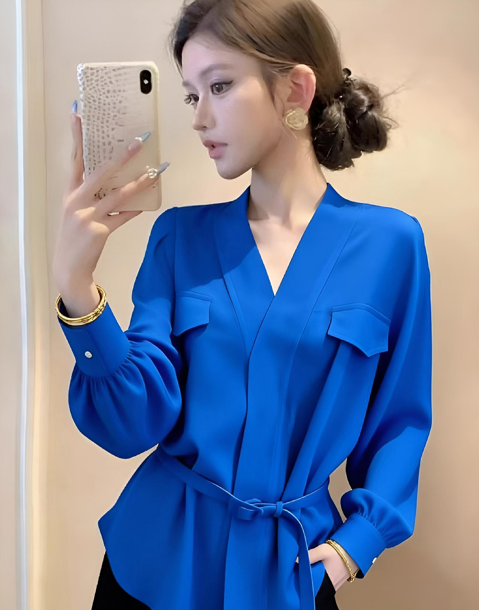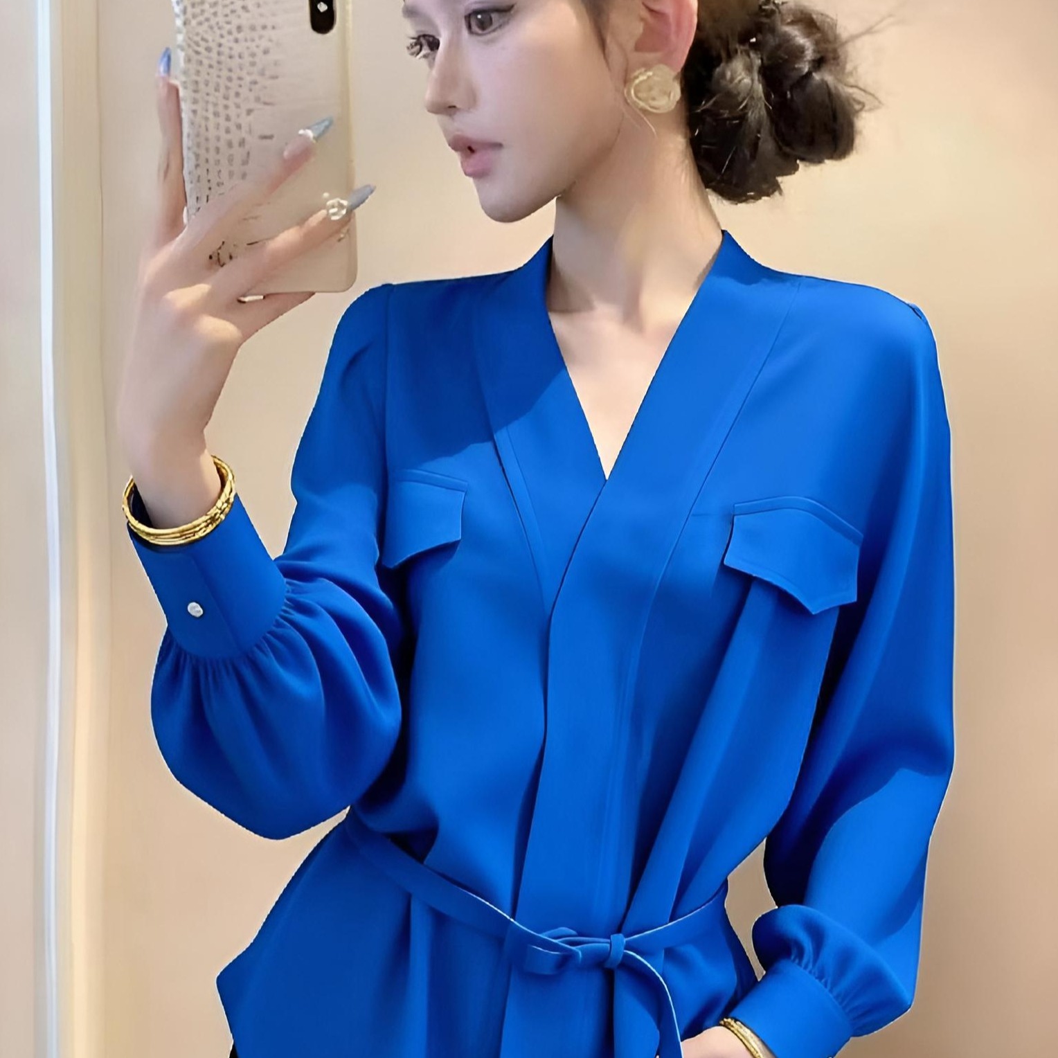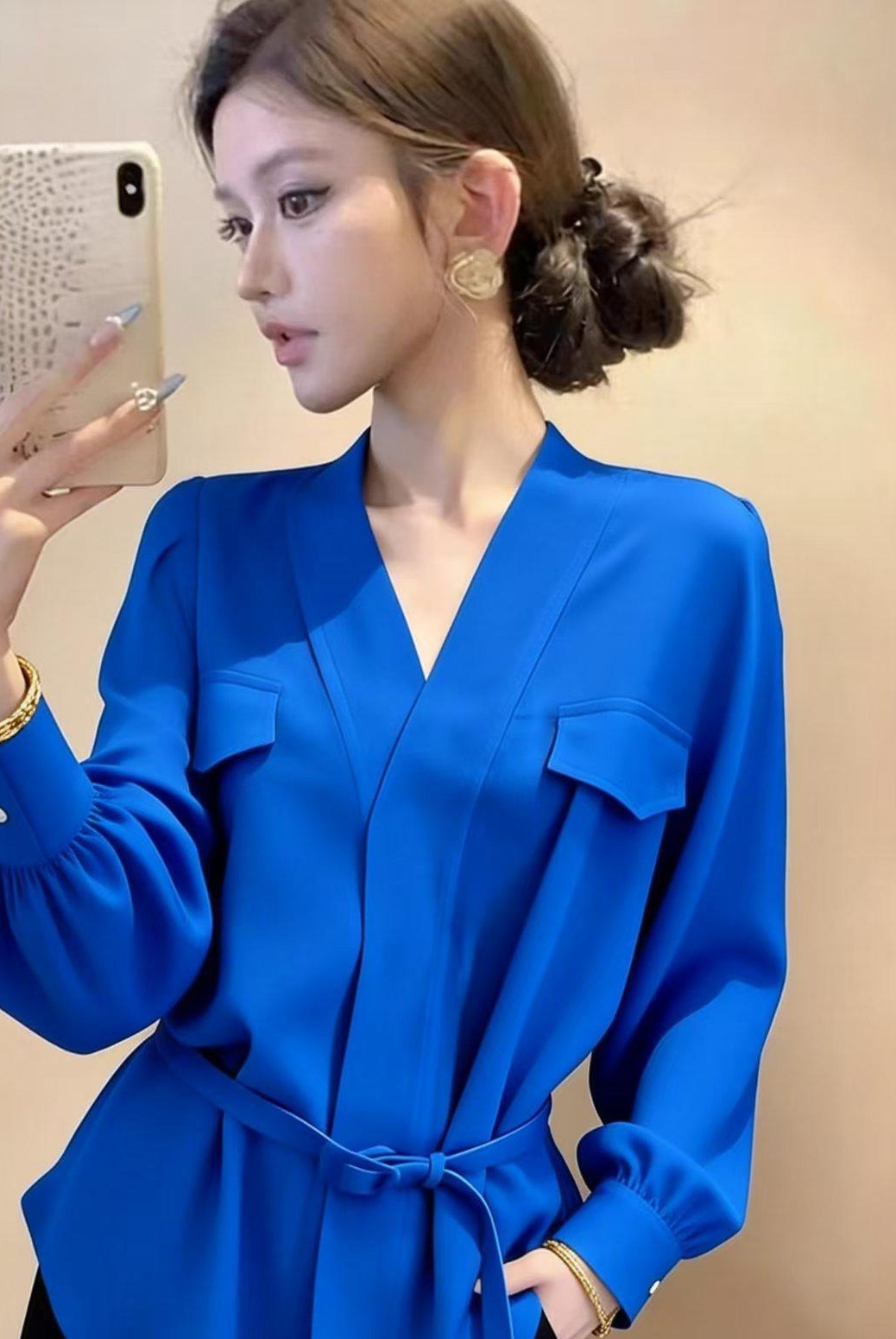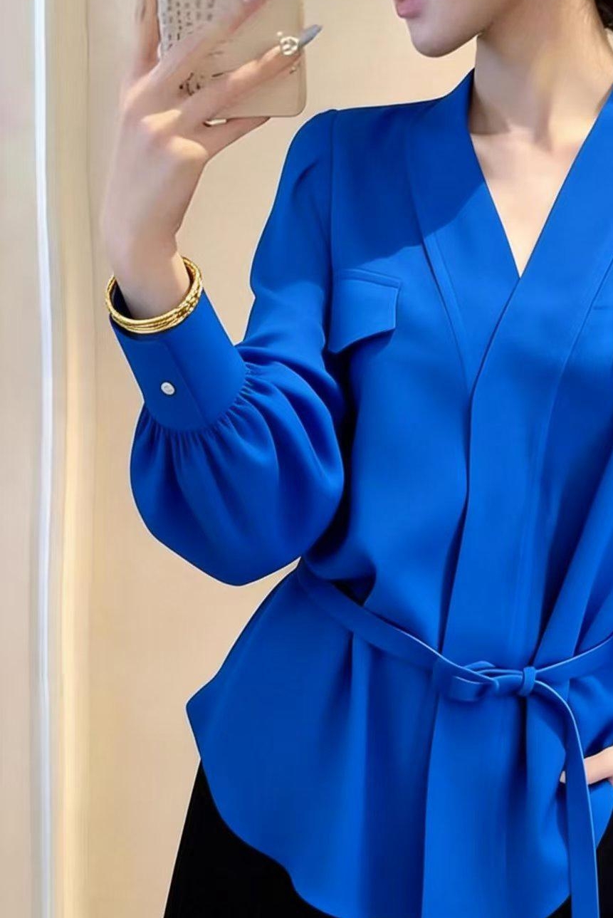 FA56052# 显白蓝色V领洋气百搭长袖上女冬季女装时尚新款气质高级感衬衫 服裝批發女裝批發服飾貨源
