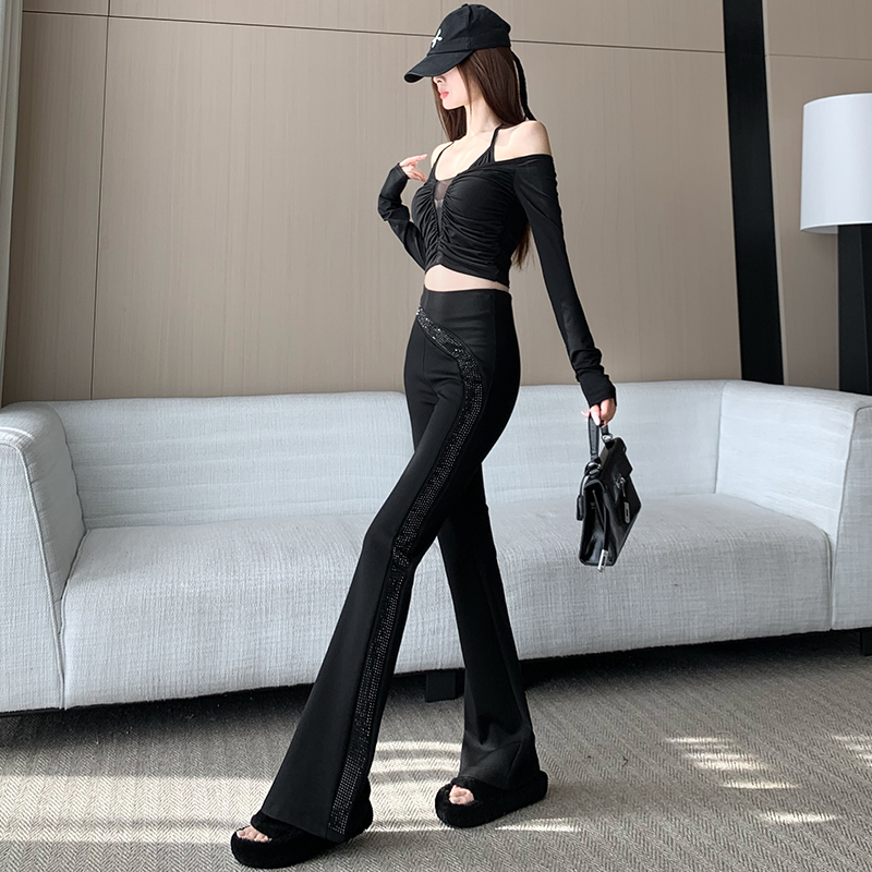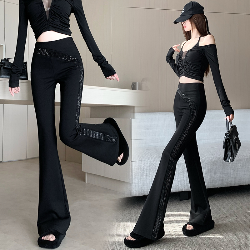 FA56062# 黑色烫钻休闲裤女早春新款流行百搭高腰显瘦时尚高级感微喇裤 服裝批發女裝批發服飾貨源