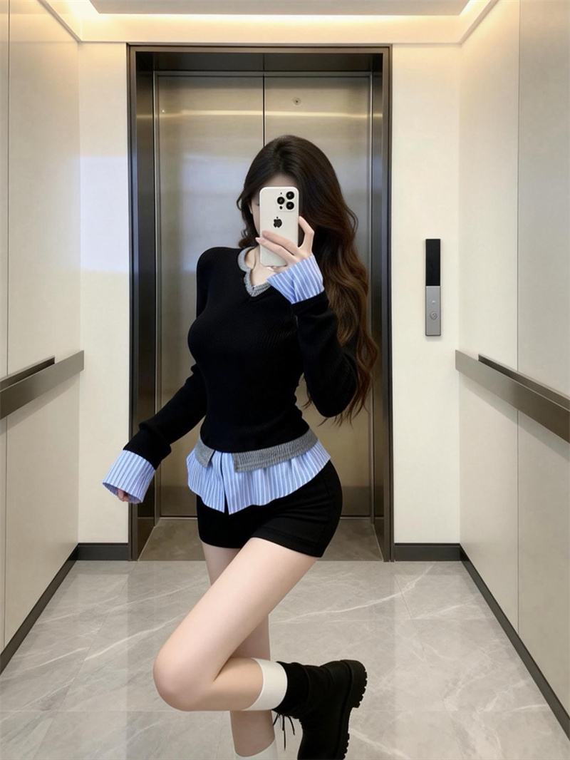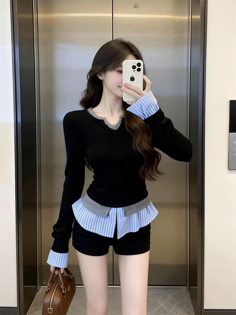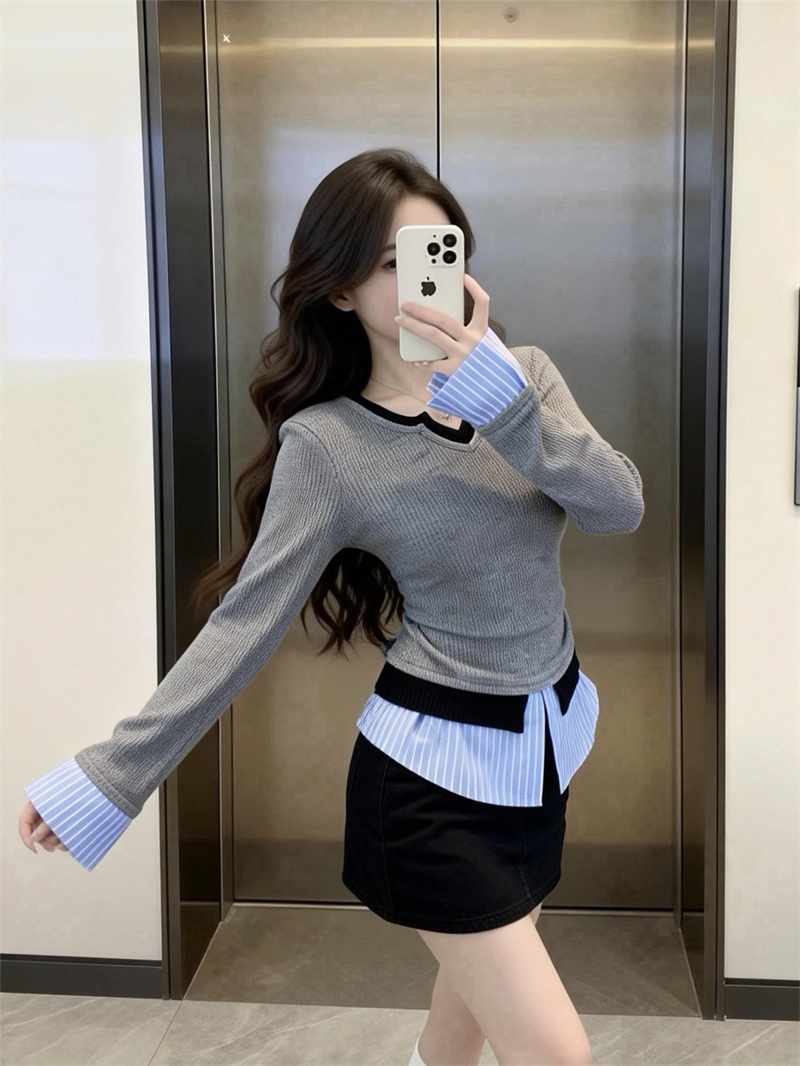 FA56081# 春上新韩版甜辣时尚假两件长袖拼接衬衫女学院风T恤上衣 服裝批發女裝批發服飾貨源