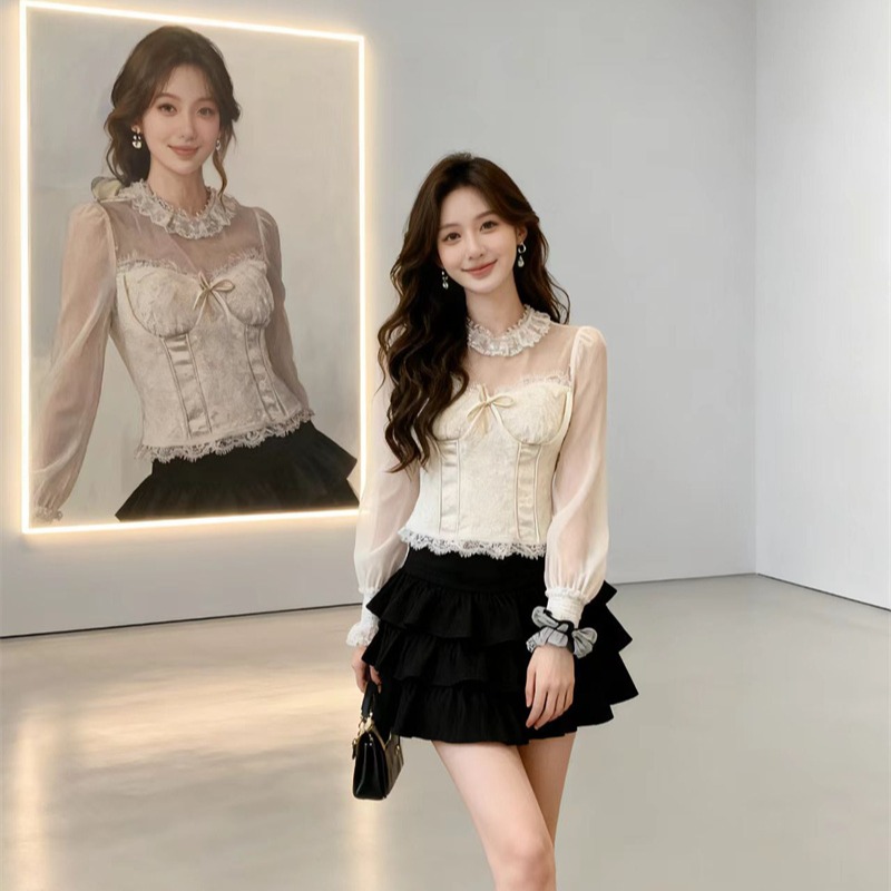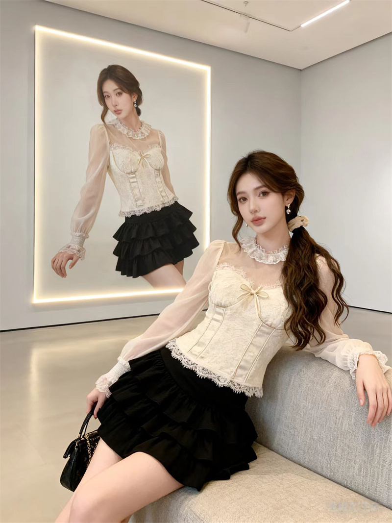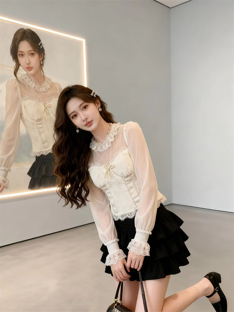 FA56085# 春季法式宫廷风复古网纱蕾丝拼接内搭衬衫女重工精致收腰衬衣 服裝批發女裝批發服飾貨源