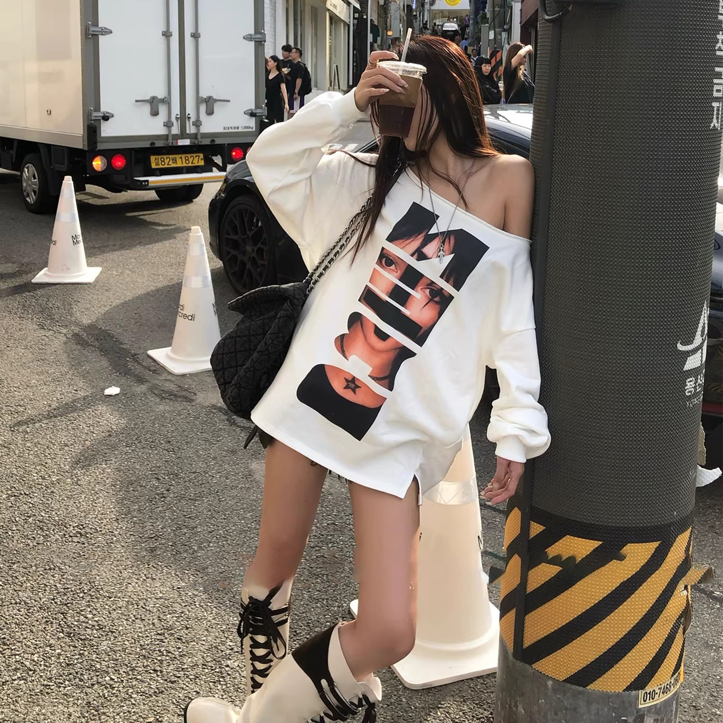 FA56093# 原版质量纯棉大鱼鳞磨破宽松慵懒百搭斜肩卫衣 服裝批發女裝批發服飾貨源