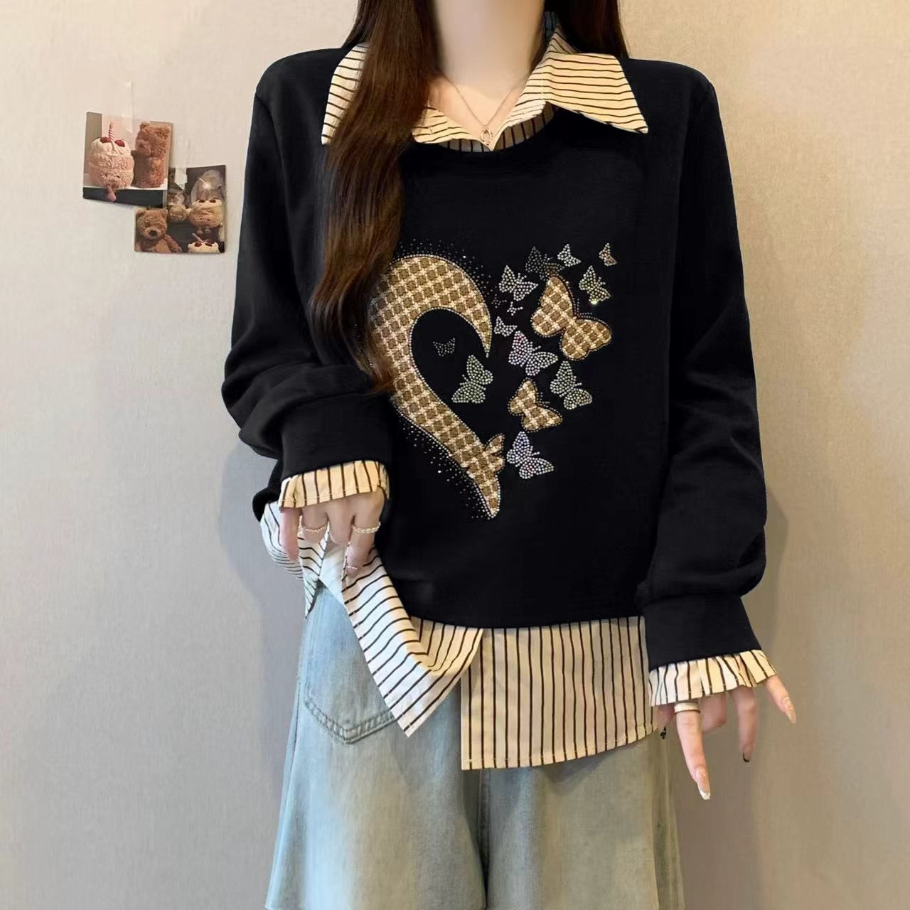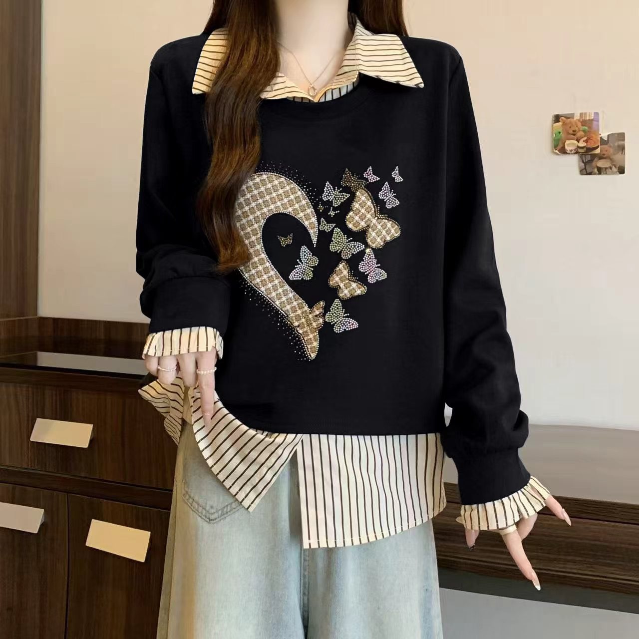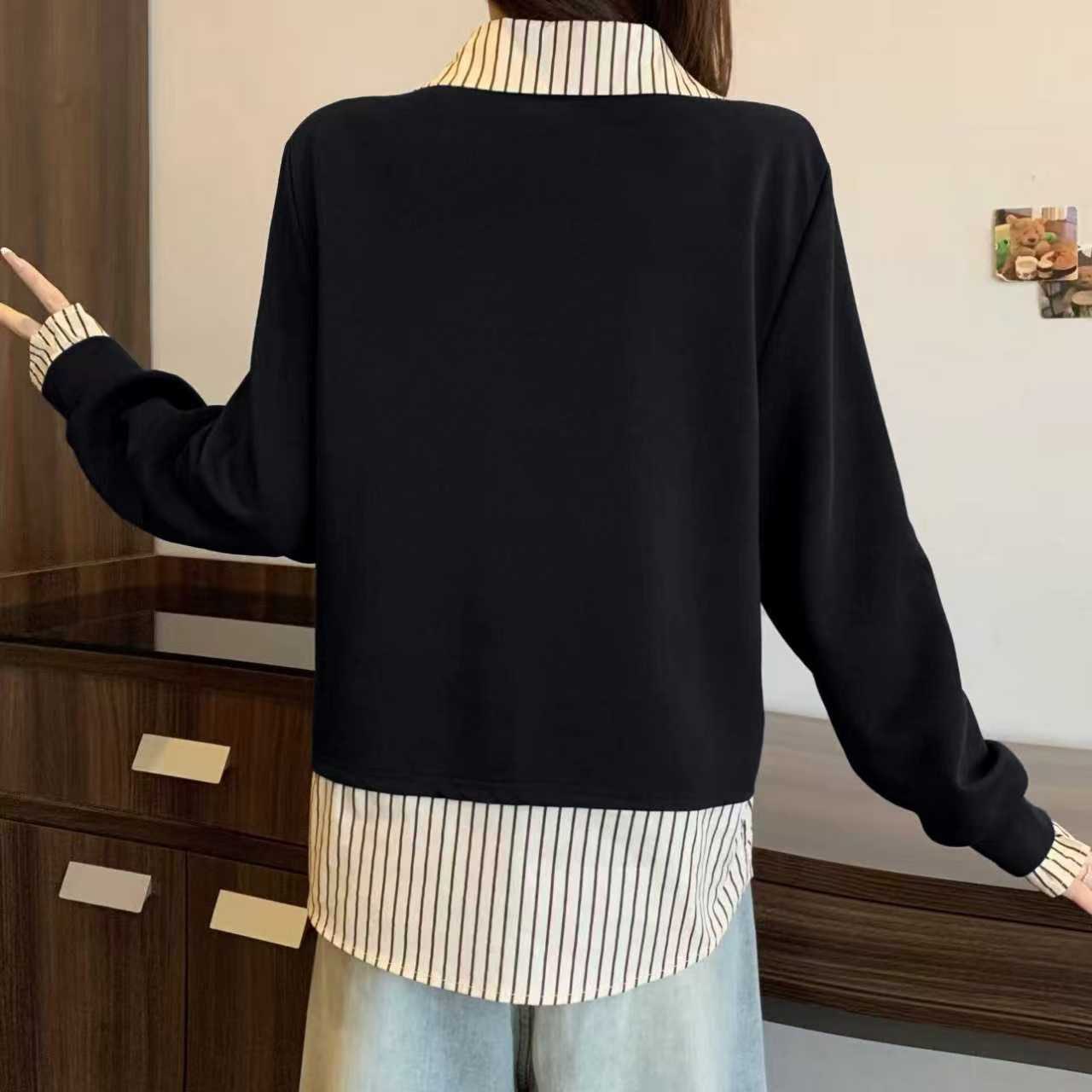 FA56309# 大码秋冬新款时尚高级感假两件重工亮钻减龄显瘦卫衣 服裝批發女裝批發服飾貨源
