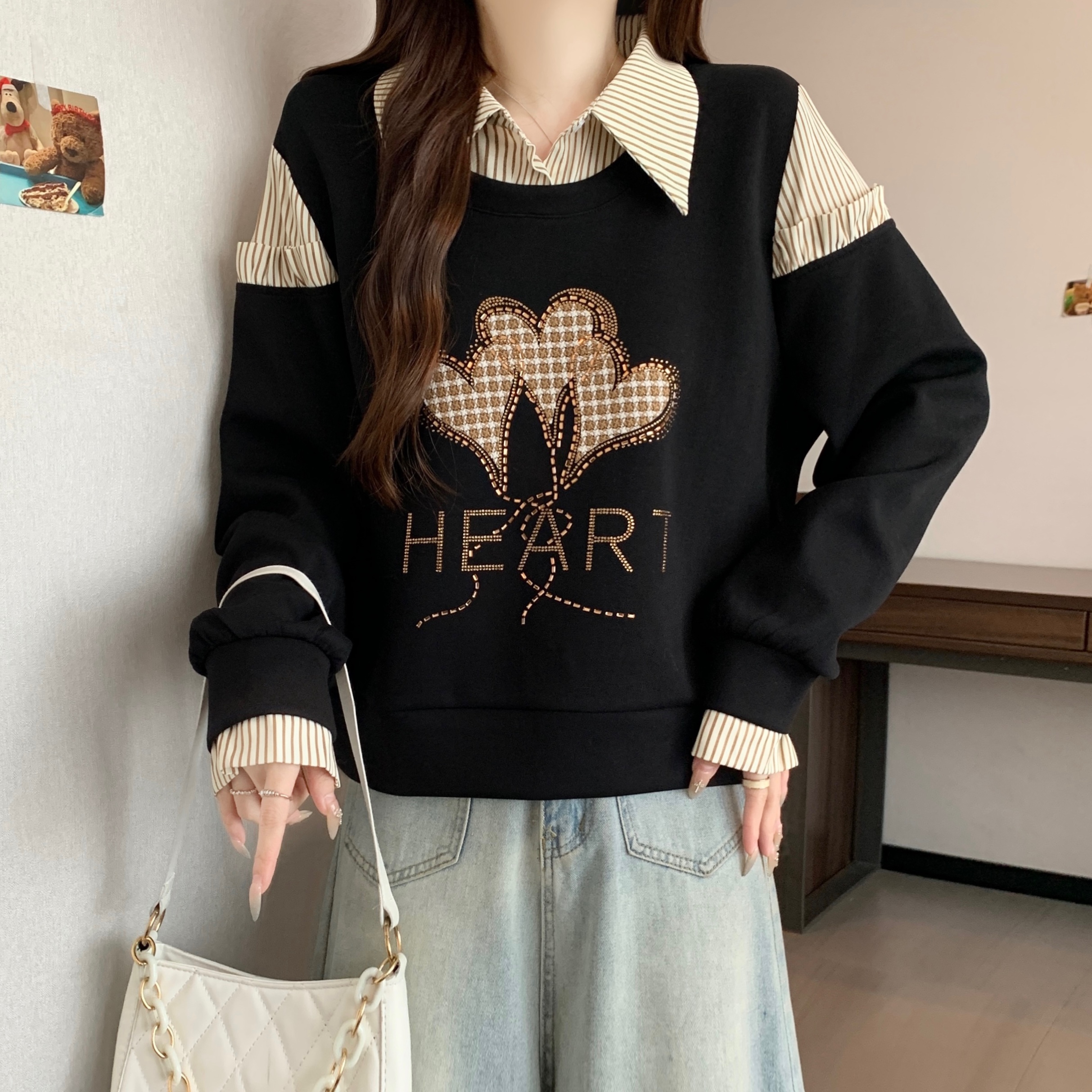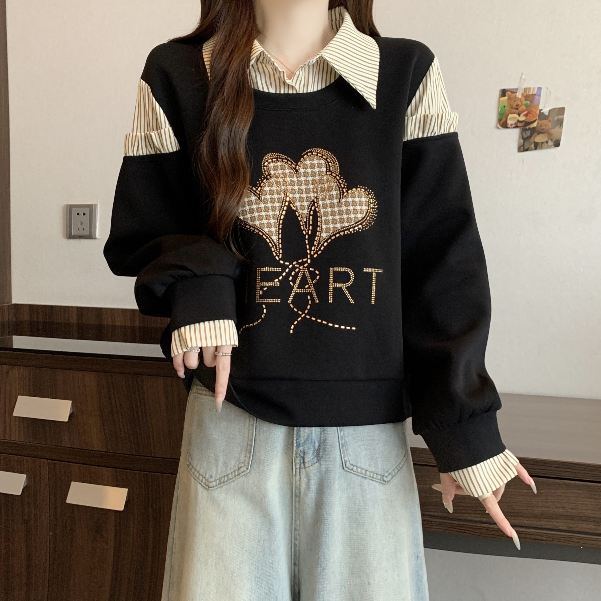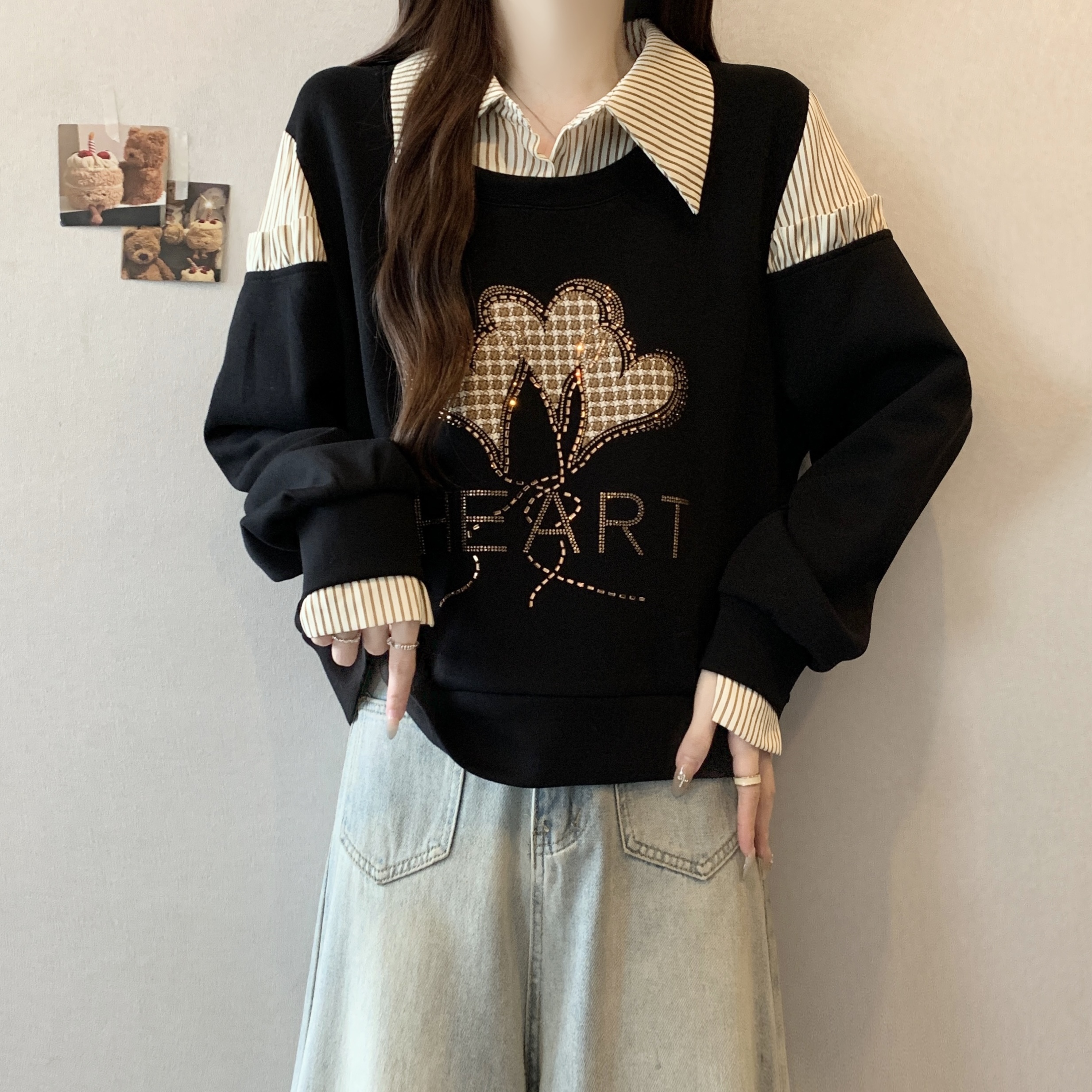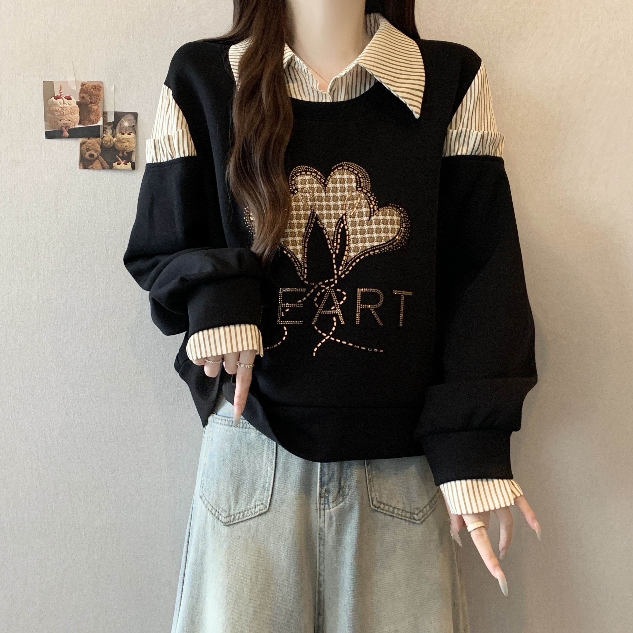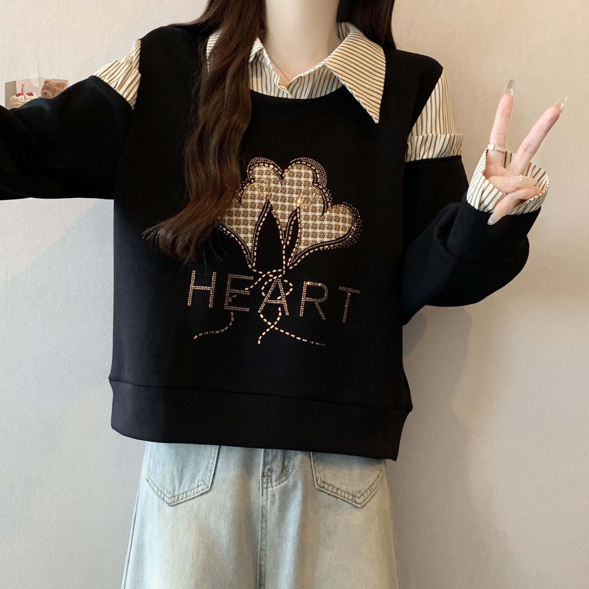 FA56310# 大码新款时尚设计感假两件拼接烫钻爱心显瘦气质百搭长袖卫衣 服裝批發女裝批發服飾貨源