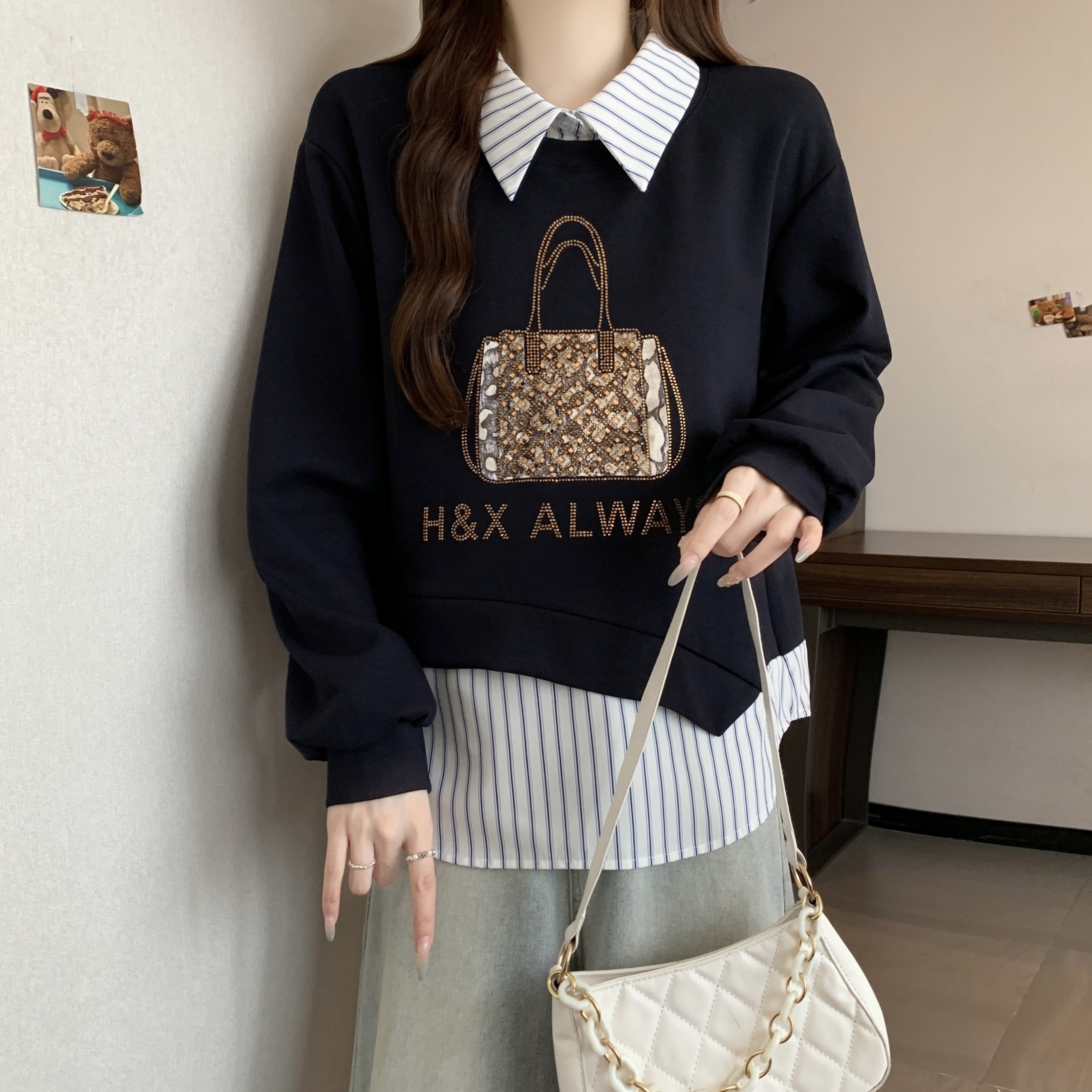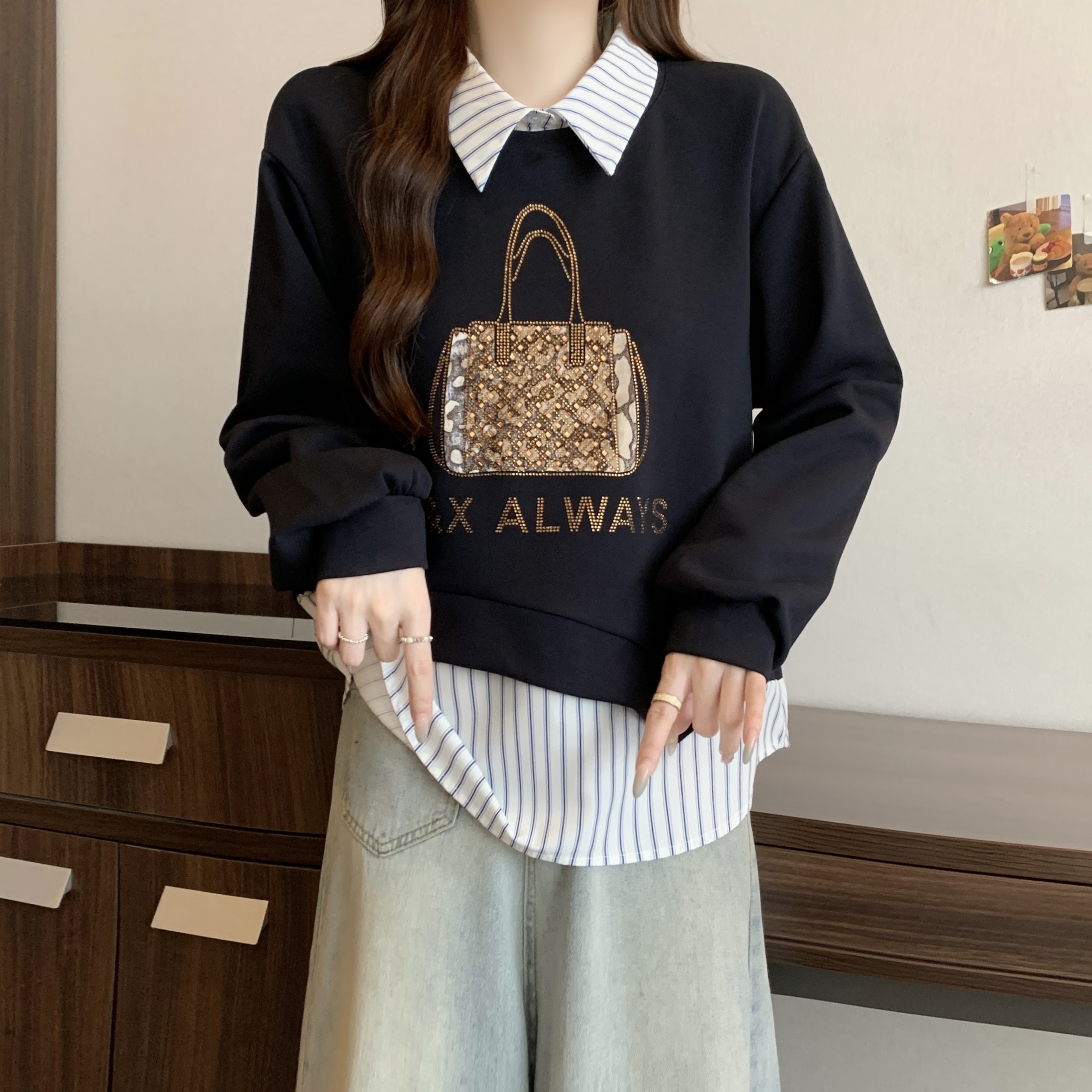 FA56314# 大码时尚新款高级感秋冬女装拼接重工亮钻包包显瘦减龄长袖卫衣 服裝批發女裝批發服飾貨源