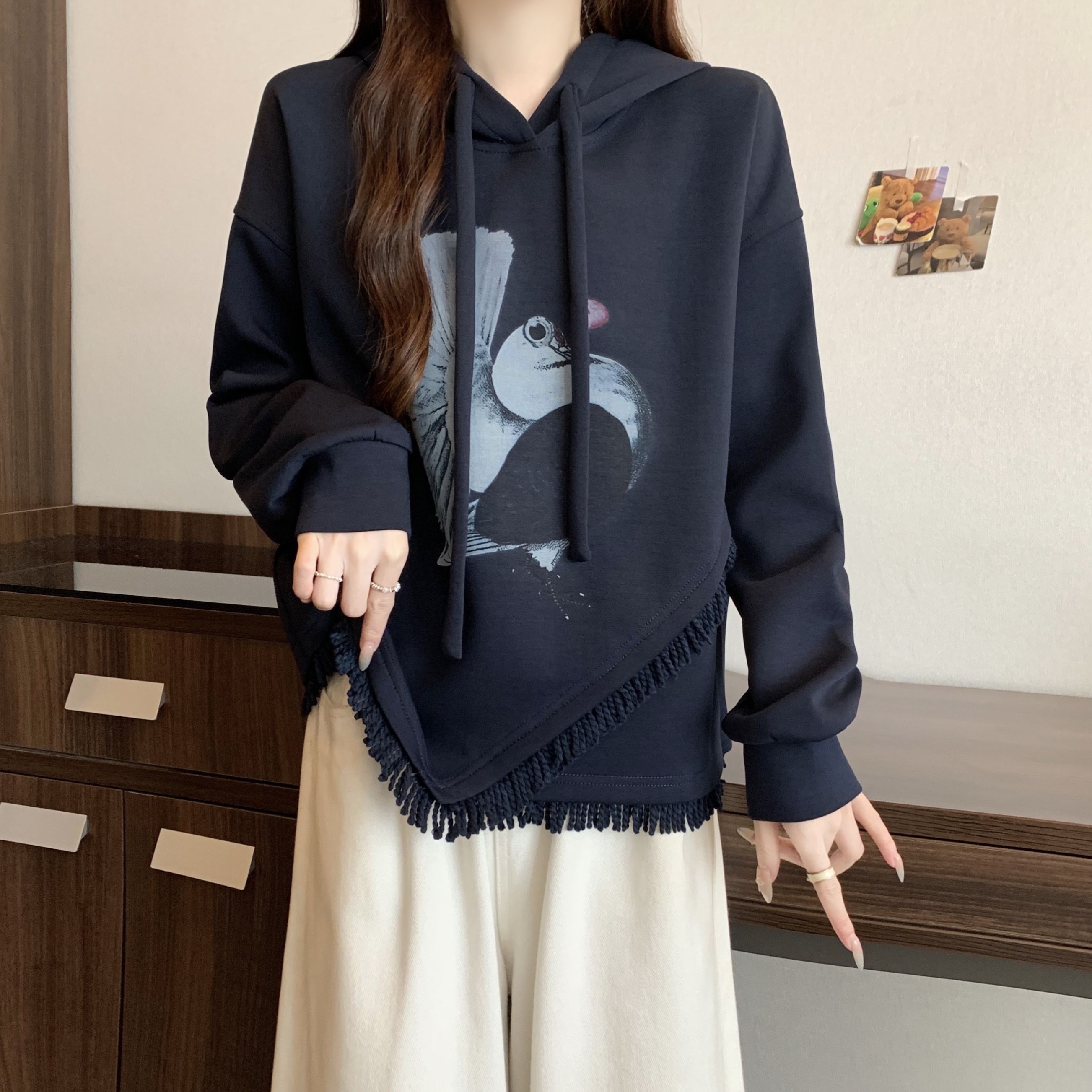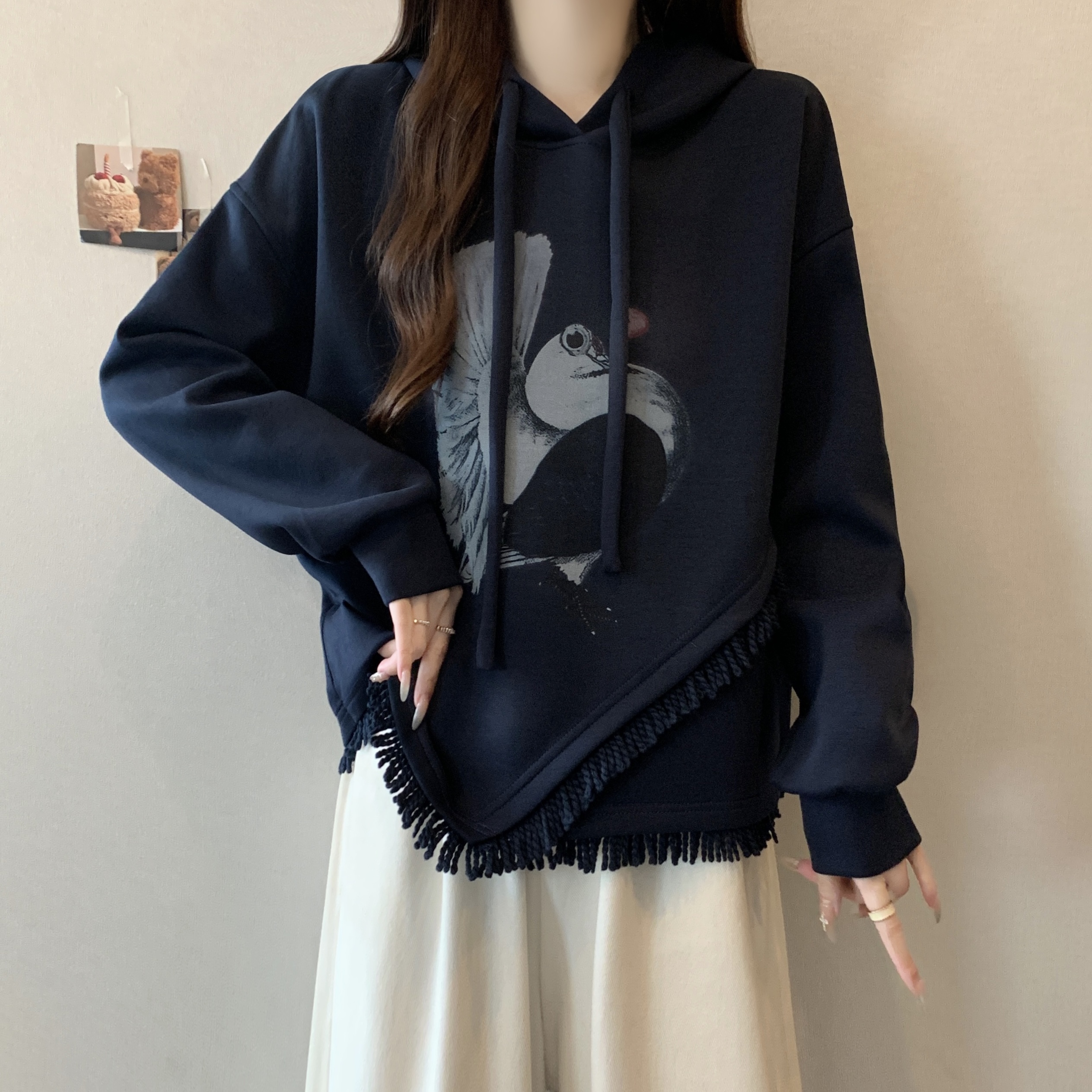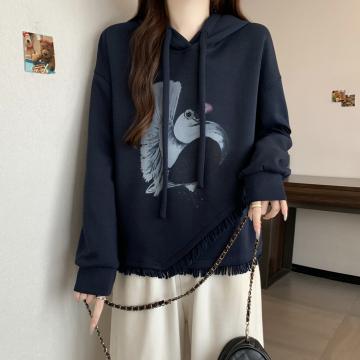 FA56315# 大码女秋冬新款韩版气质高级图案印花连帽流苏长袖上衣卫衣 服裝批發女裝批發服飾貨源