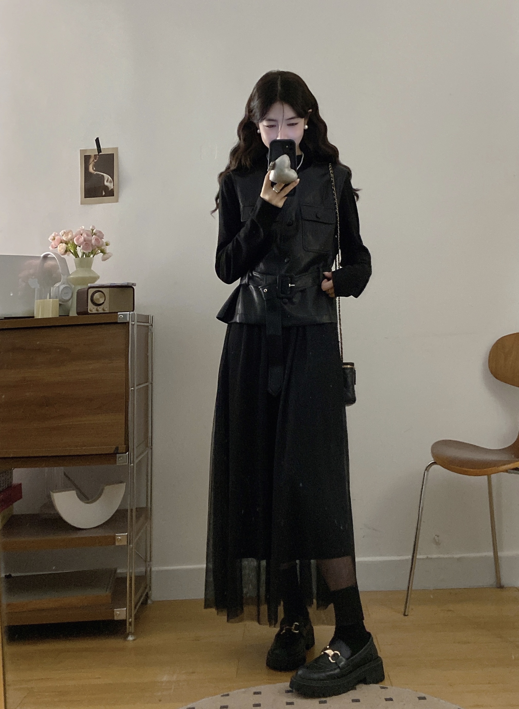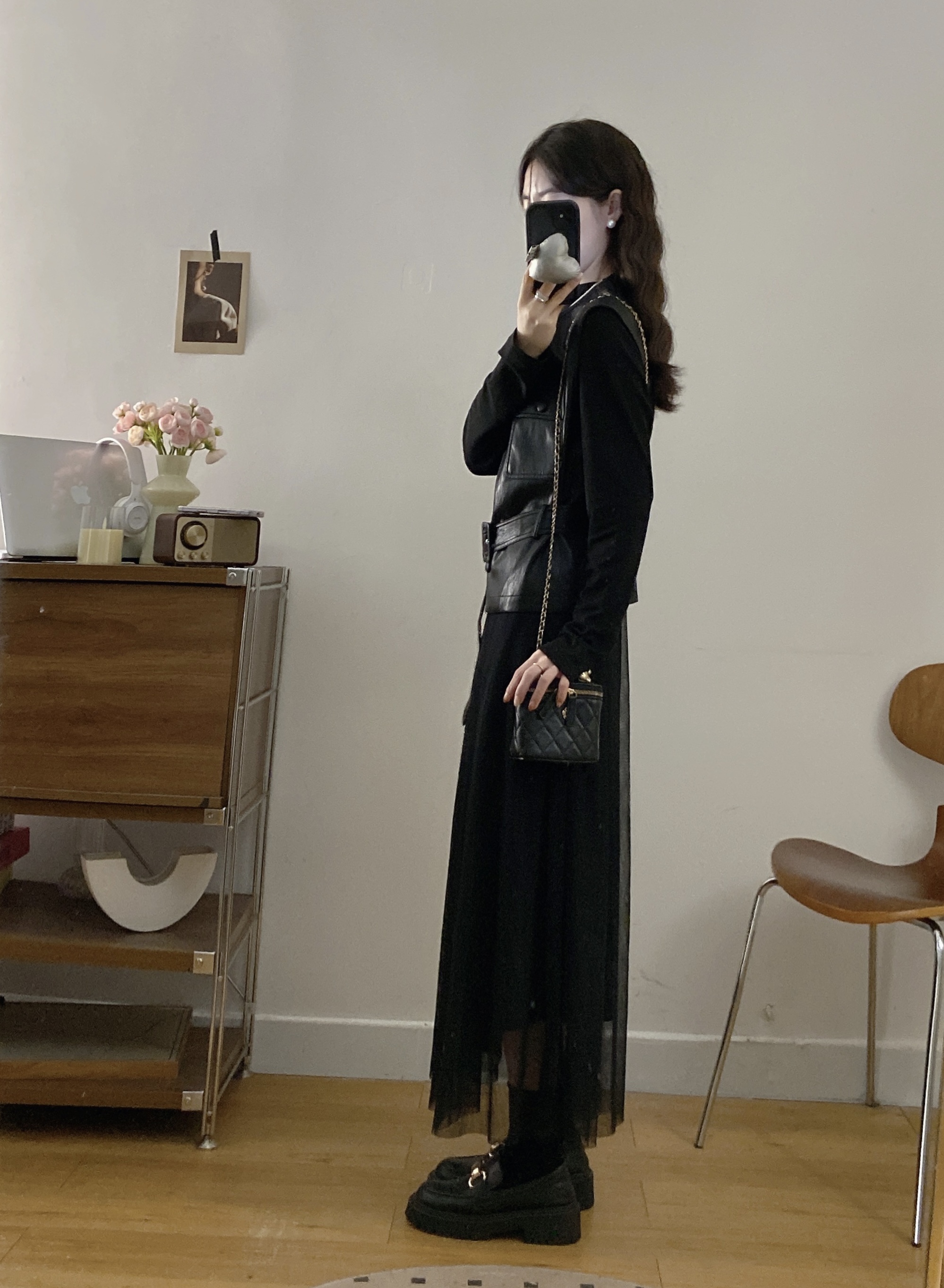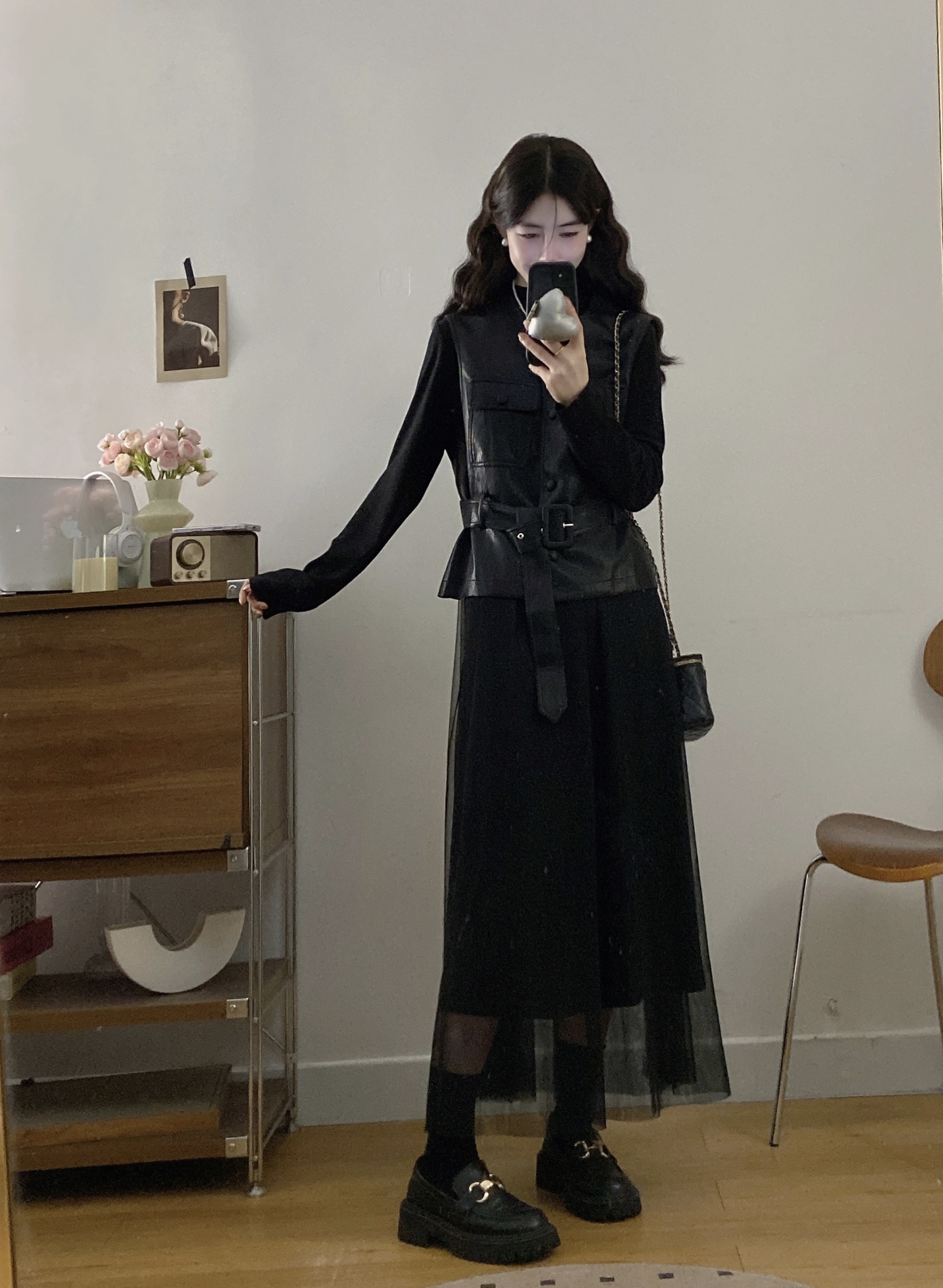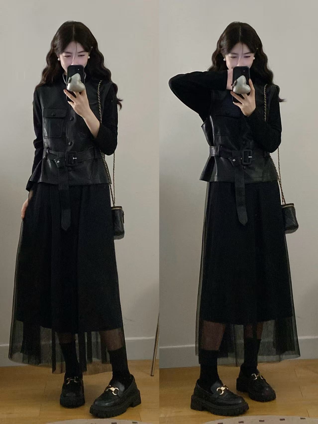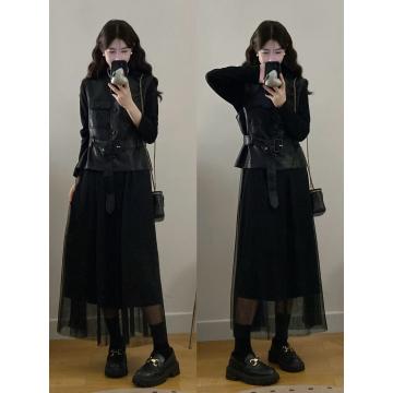 FA56319# 大码女装胖mm秋冬时尚皮马甲收腰显瘦拼接网纱连衣裙两件套 服裝批發女裝批發服飾貨源