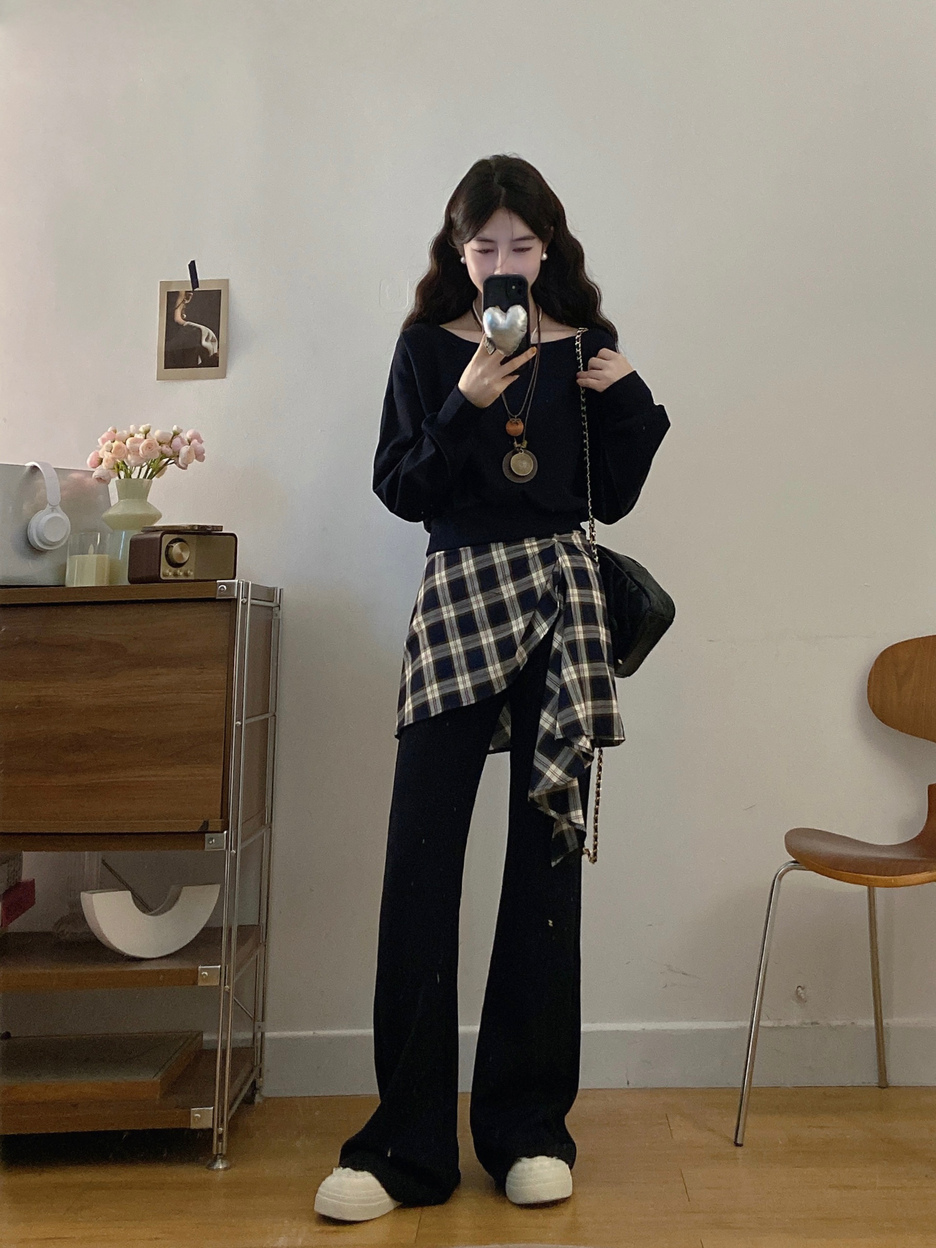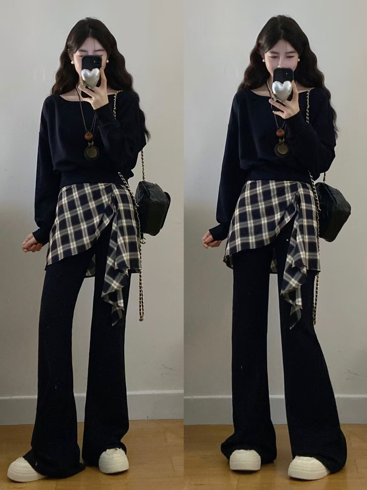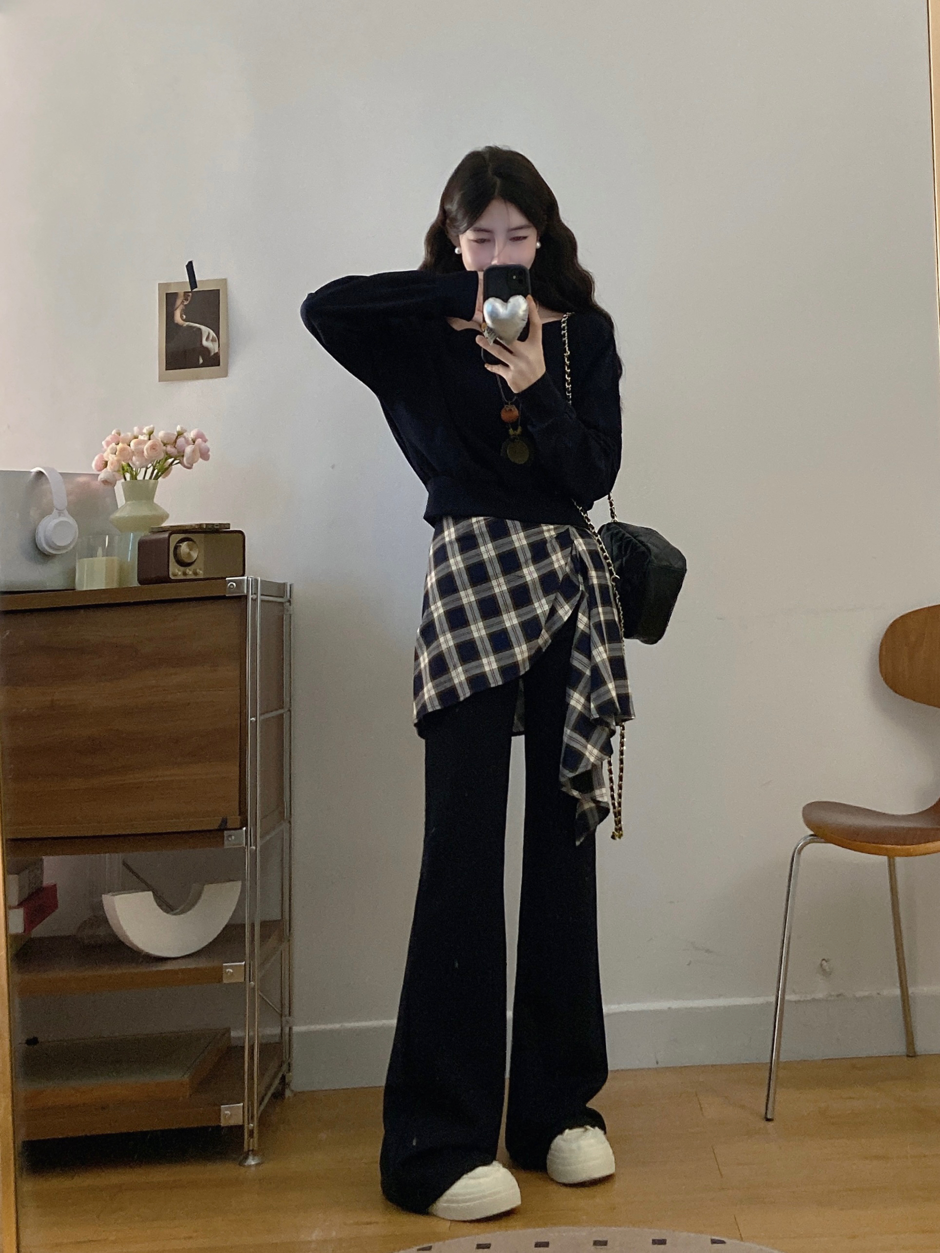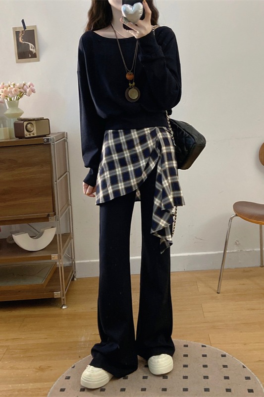 FA56324#大码女装胖mm新款时尚洋气斜肩卫衣格子拼接微喇裤套装 服裝批發女裝批發服飾貨源