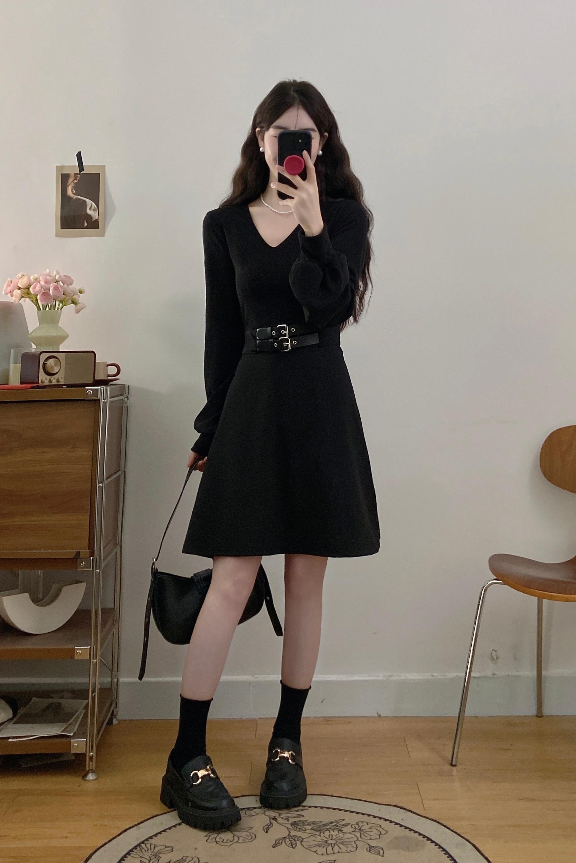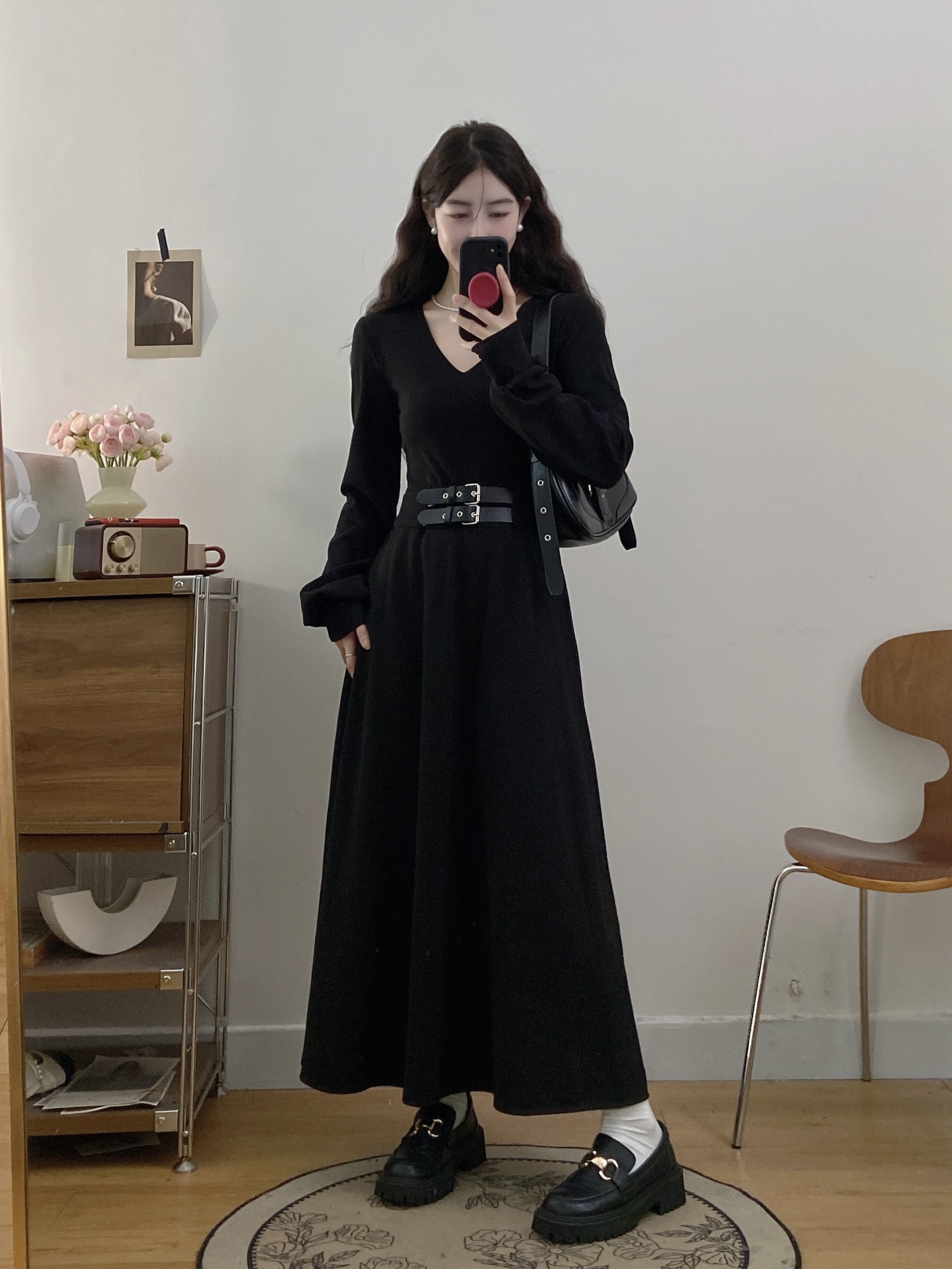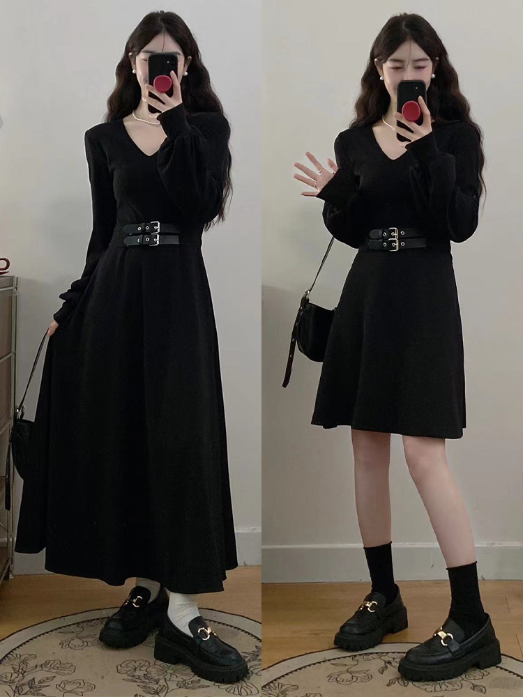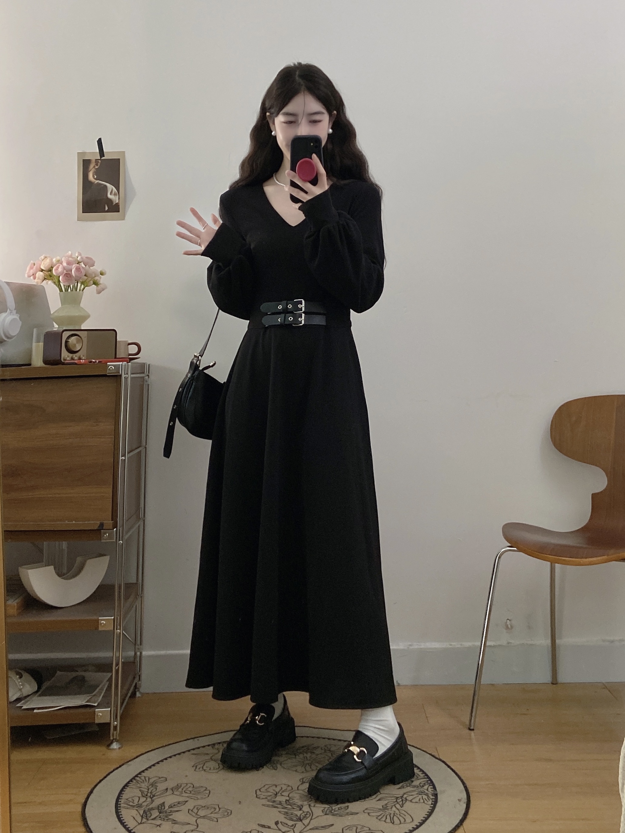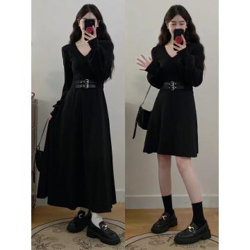 FA56339#大码女装胖mm秋冬显瘦小黑裙收腰V领打底连衣裙 服裝批發女裝批發服飾貨源