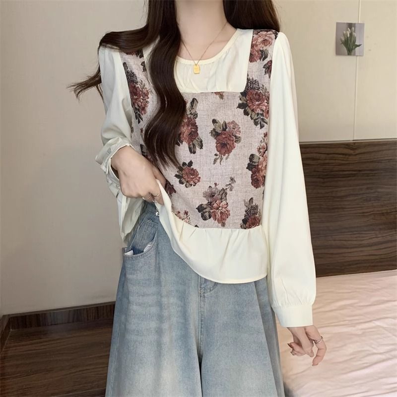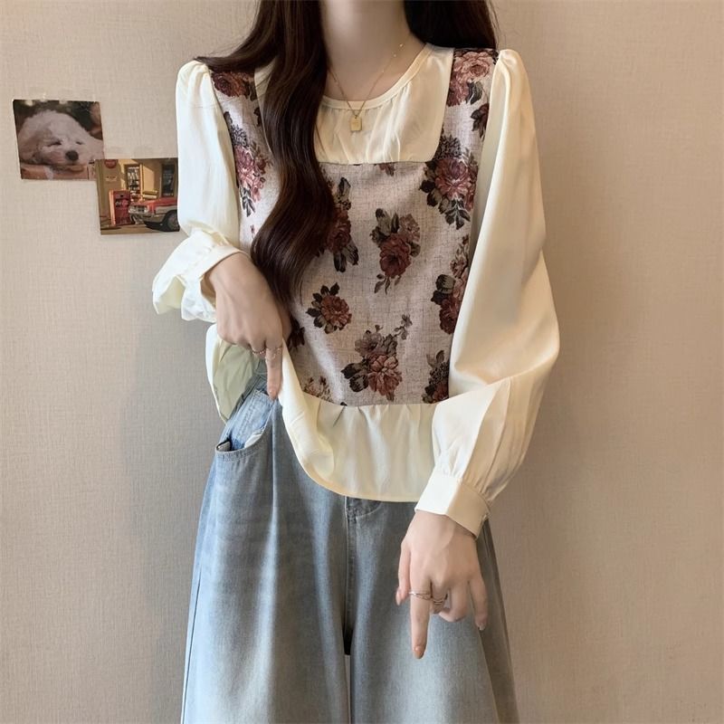 FA56352#新款假两件碎花长袖女春季胖MM遮肚子显瘦减龄上衣 服裝批發女裝批發服飾貨源