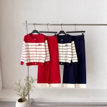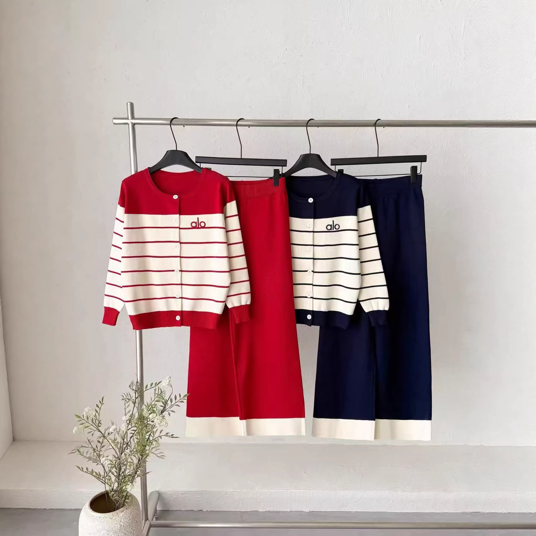 FA56355#跨境新款韩系圆领条纹字母刺绣慵懒高级感针织上衣阔腿裤两件套 服裝批發女裝批發服飾貨源