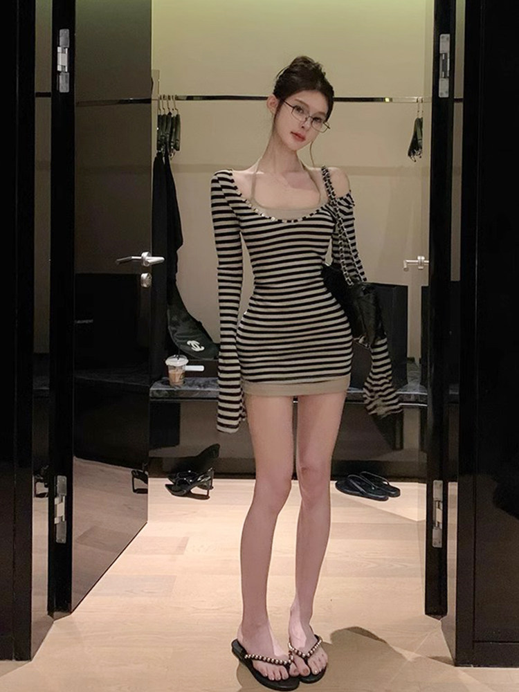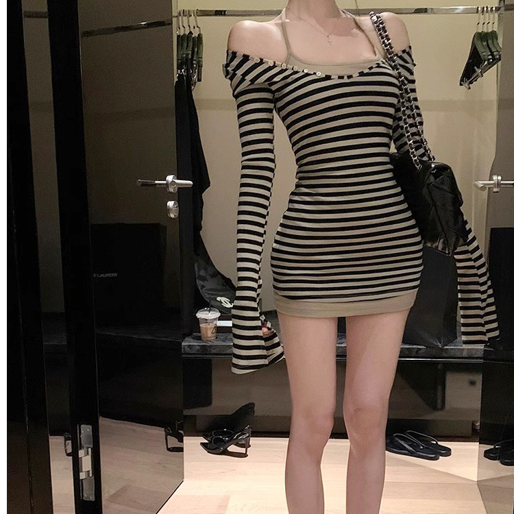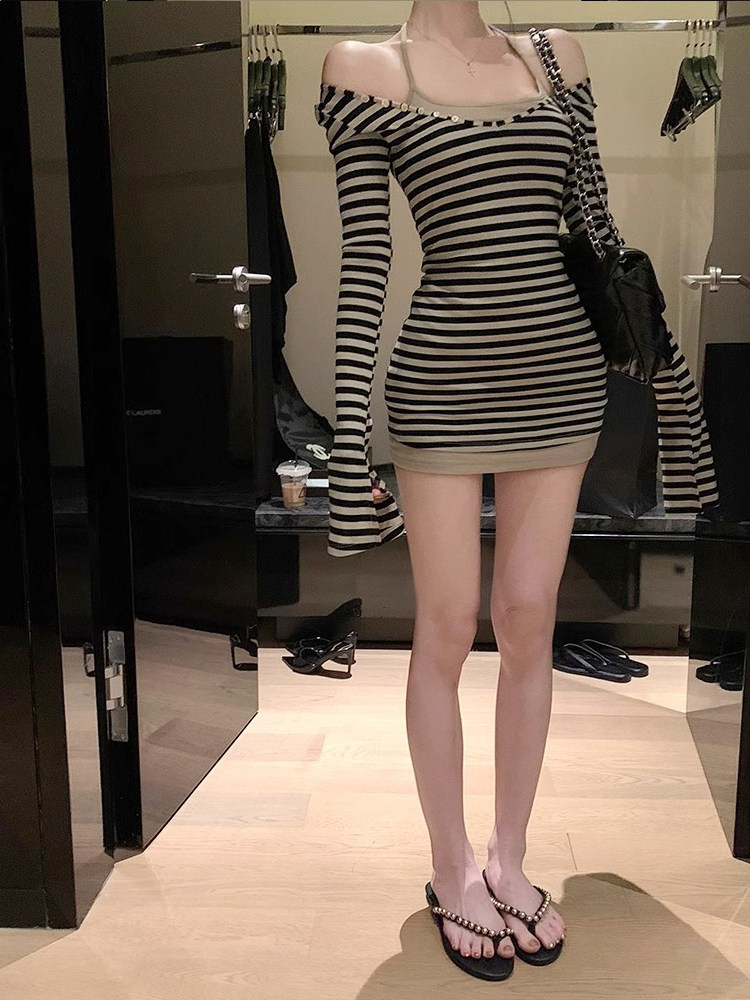 FA56360#早秋u领喇叭袖条纹长袖上衣两件套女韩系纯欲风甜辣妹修身 服裝批發女裝批發服飾貨源