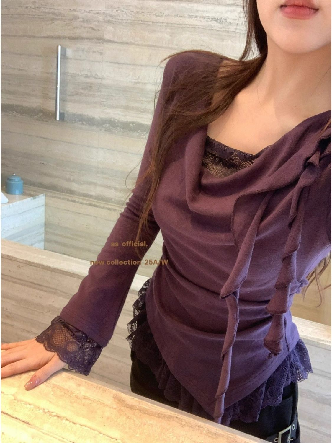 FA56361#大码胖mm纯欲露肩蕾丝边飘带长袖T恤女秋季性感修身显瘦紫色上衣 服裝批發女裝批發服飾貨源