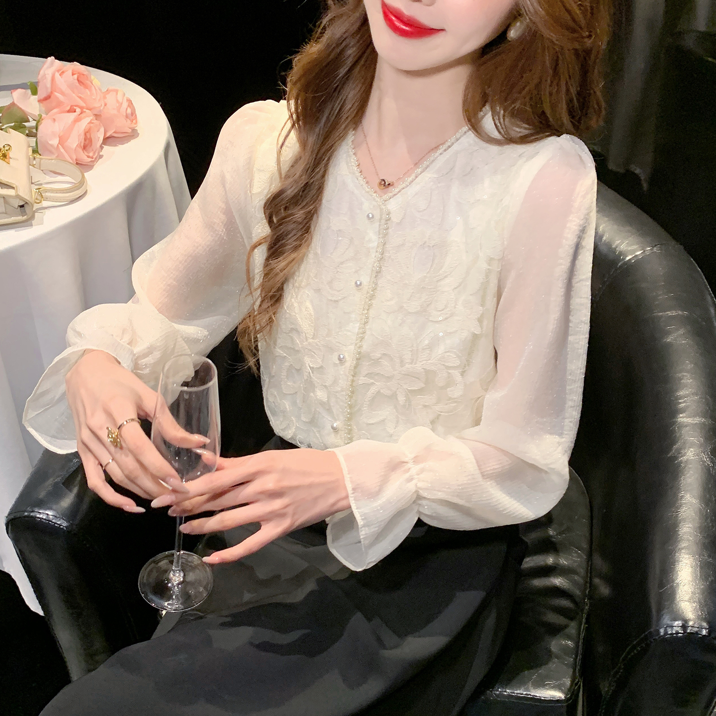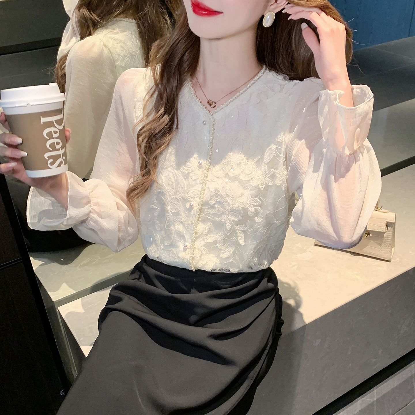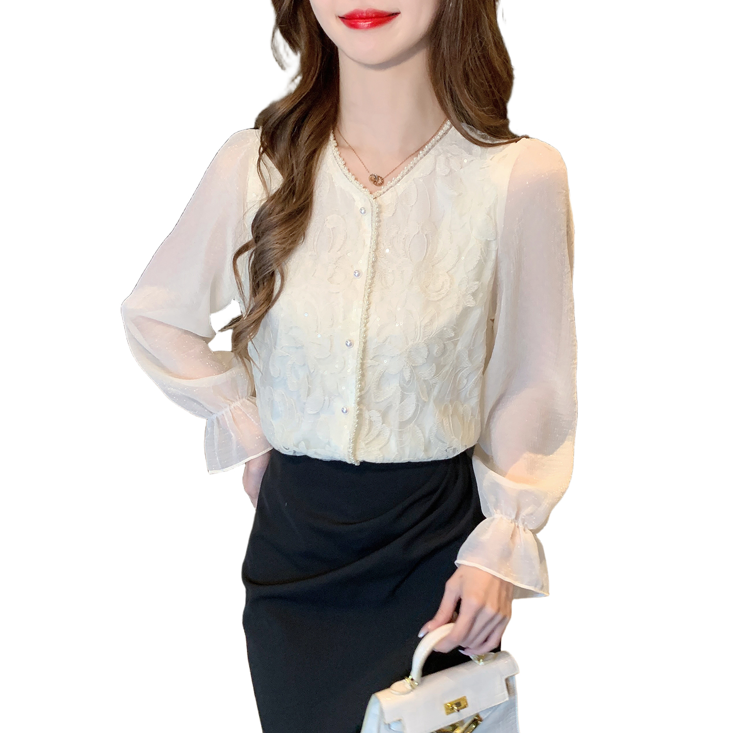 FA56363#春季时尚法式轻熟小众上衣v领蕾丝衫花边衬衫女长袖小衫 服裝批發女裝批發服飾貨源