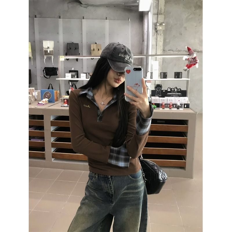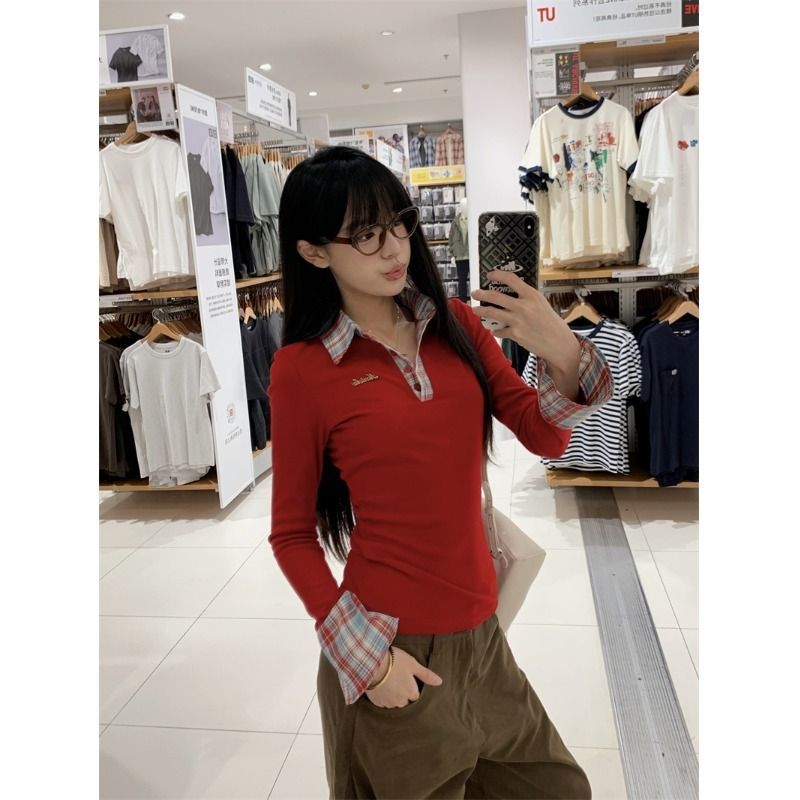 FA56371#设计感polo领长袖女秋假两件格子拼接打底上衣 服裝批發女裝批發服飾貨源