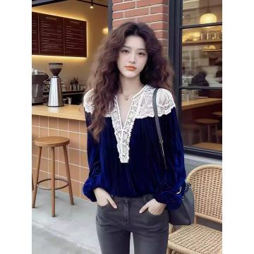 FA56845# 巨好看蓝色蕾丝拼接衬衫女新款设计感高端法式小资丝绒上衣潮 服裝批發女裝批發服飾貨源