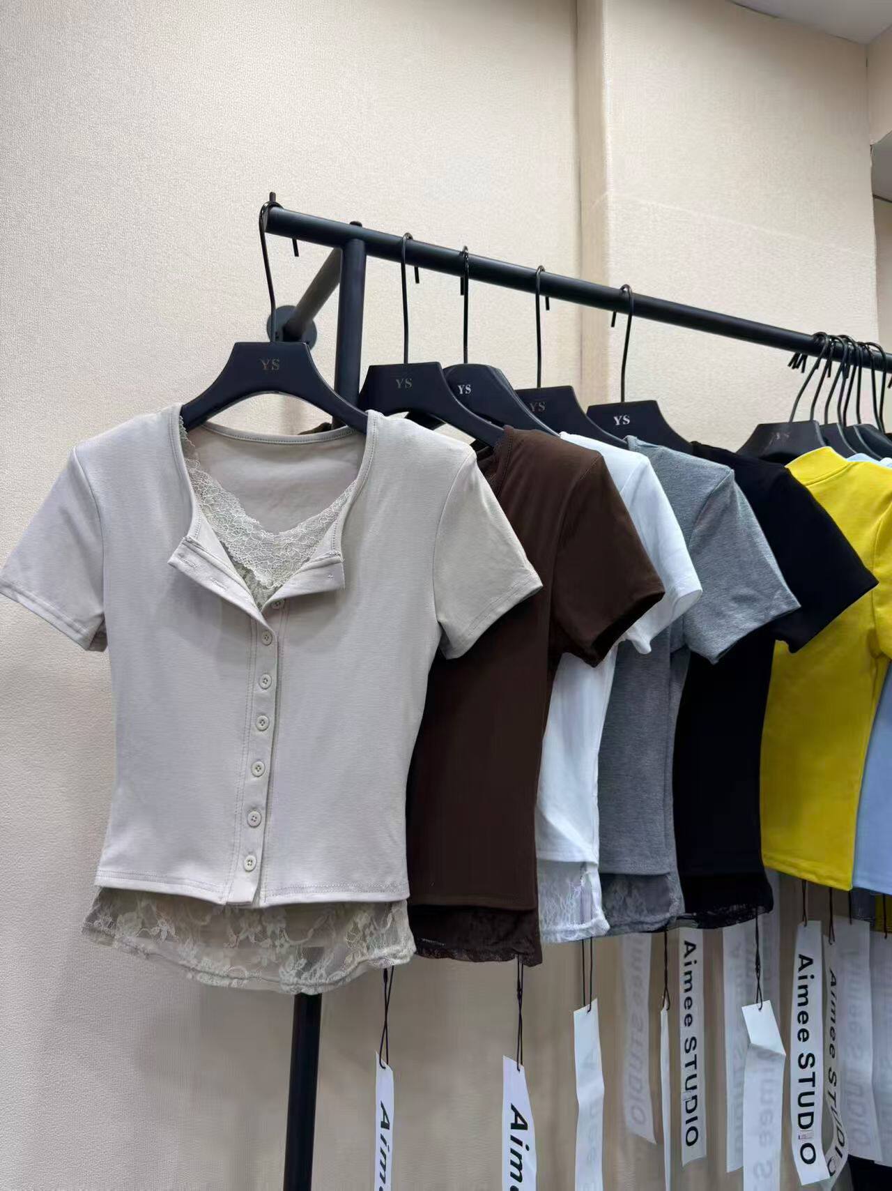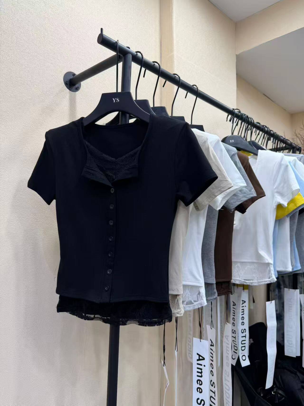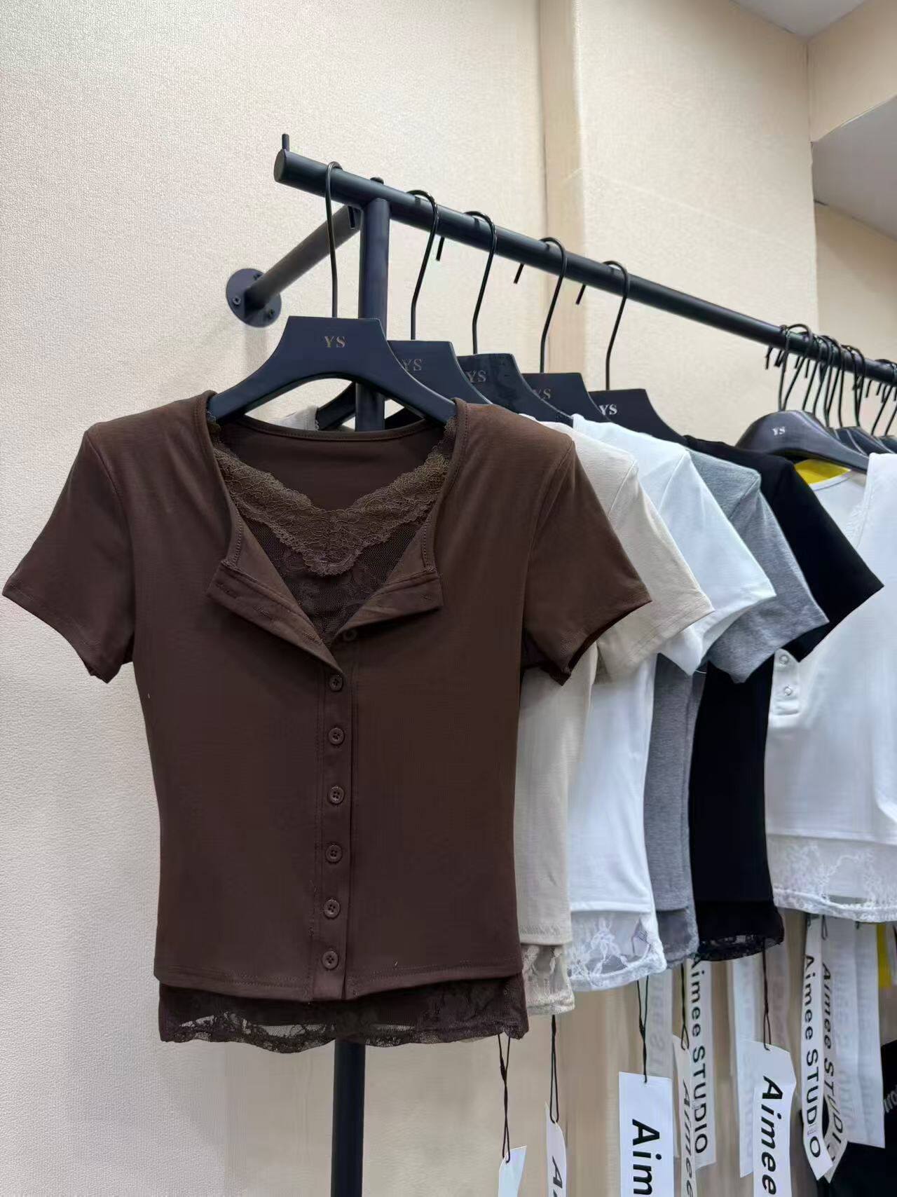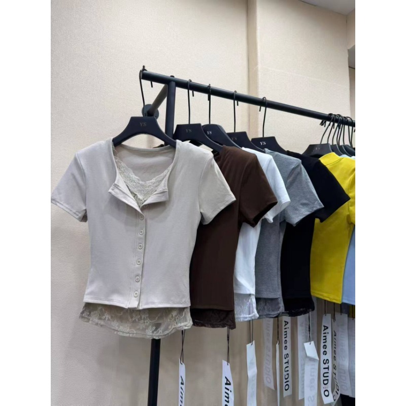 BY10516# 新款春季韩版时尚百搭蕾丝拼接半开领短袖t恤女 服裝批發女裝批發服飾貨源