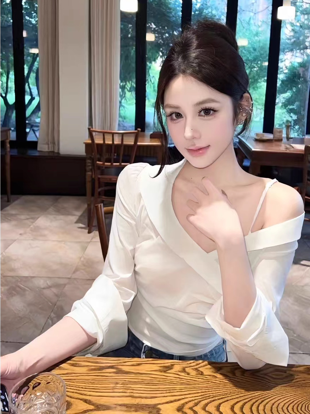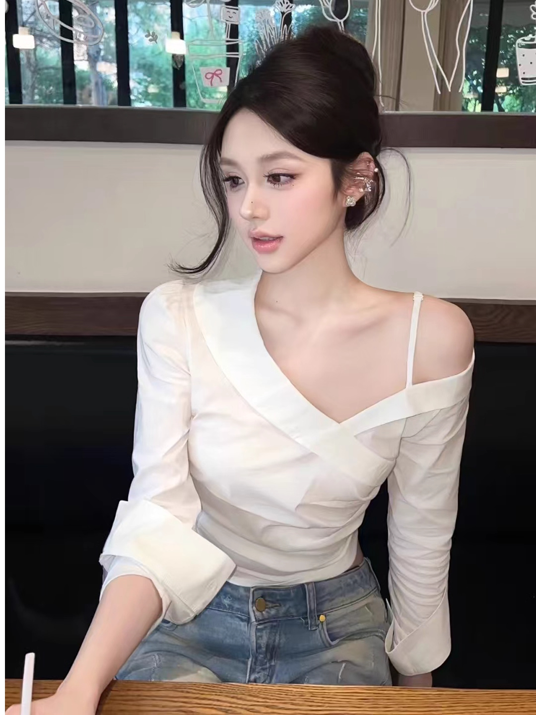 BY10587# 法式温柔风交叉V领露肩衬衫褶皱上衣 服裝批發女裝批發服飾貨源
