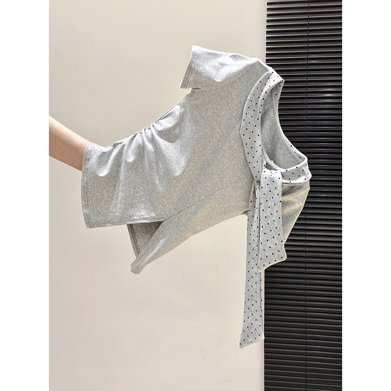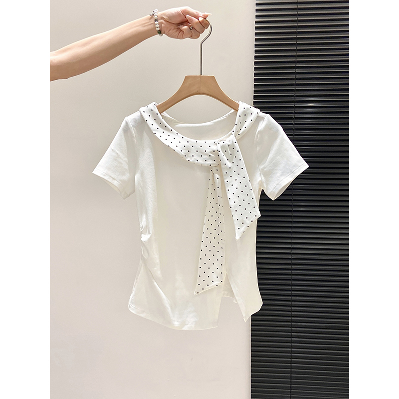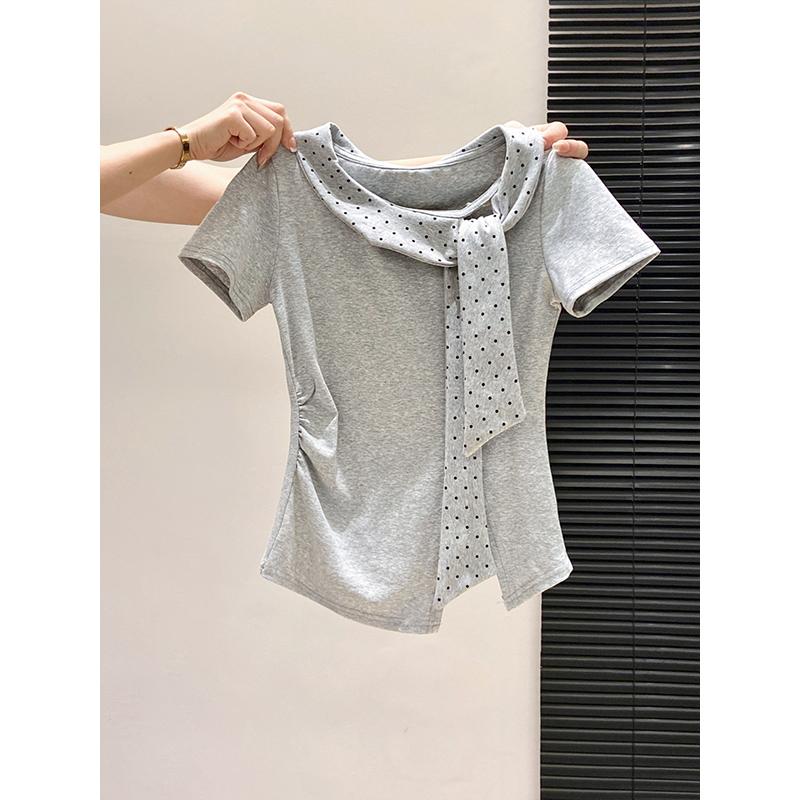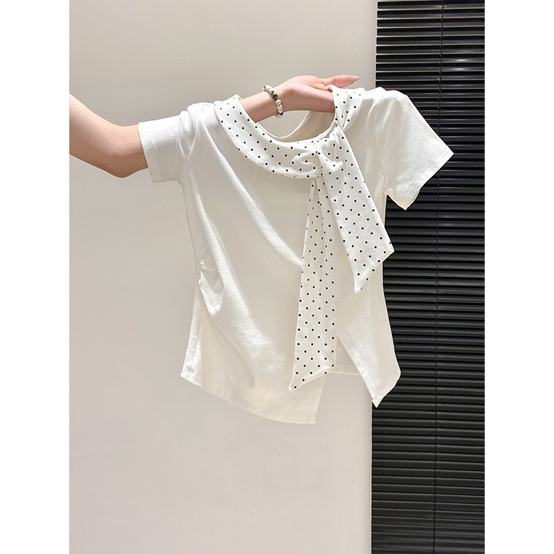 BY10593# 波点系带圆领短袖t恤衫女夏季新款甜美修身显瘦时尚洋气上衣 服裝批發女裝批發服飾貨源