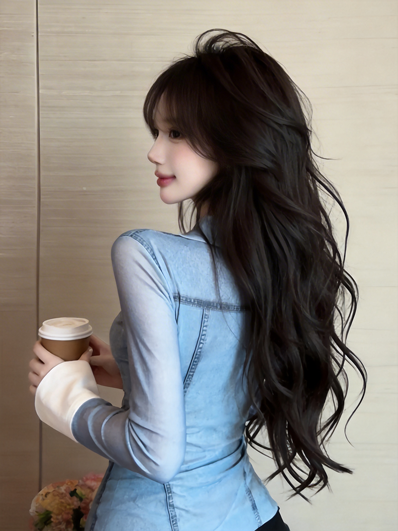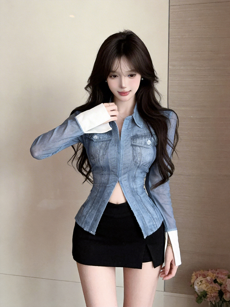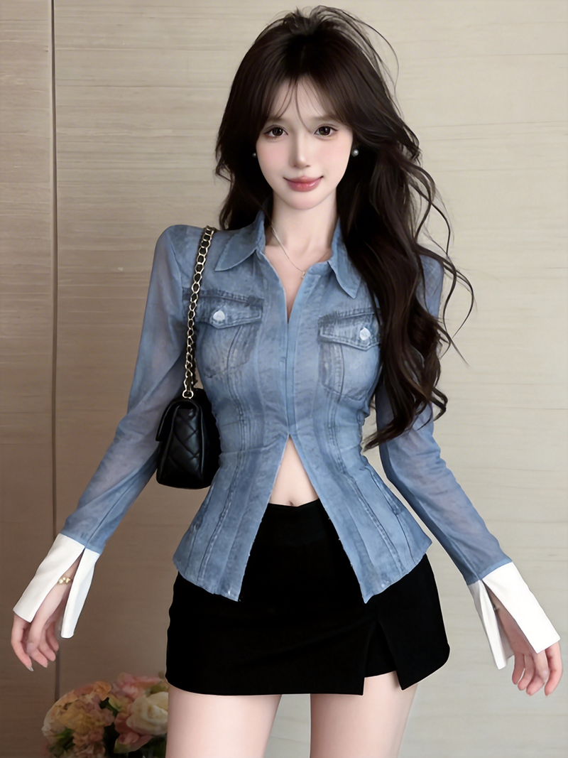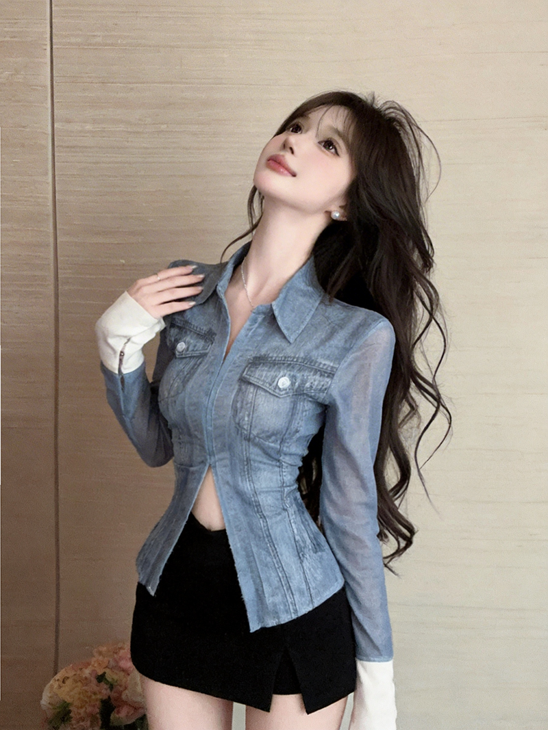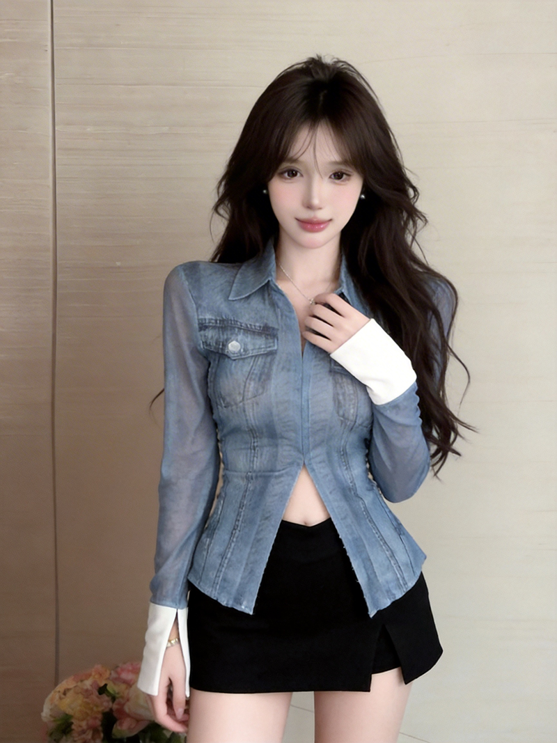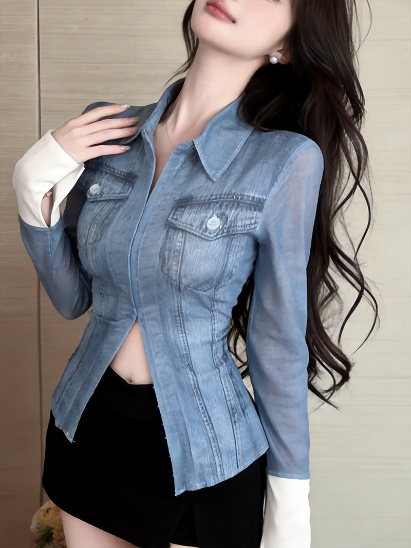 BY10730# 美式复古辣妹性感网纱牛仔色衬衫长袖修身百搭打底上衣 服裝批發女裝批發服飾貨源