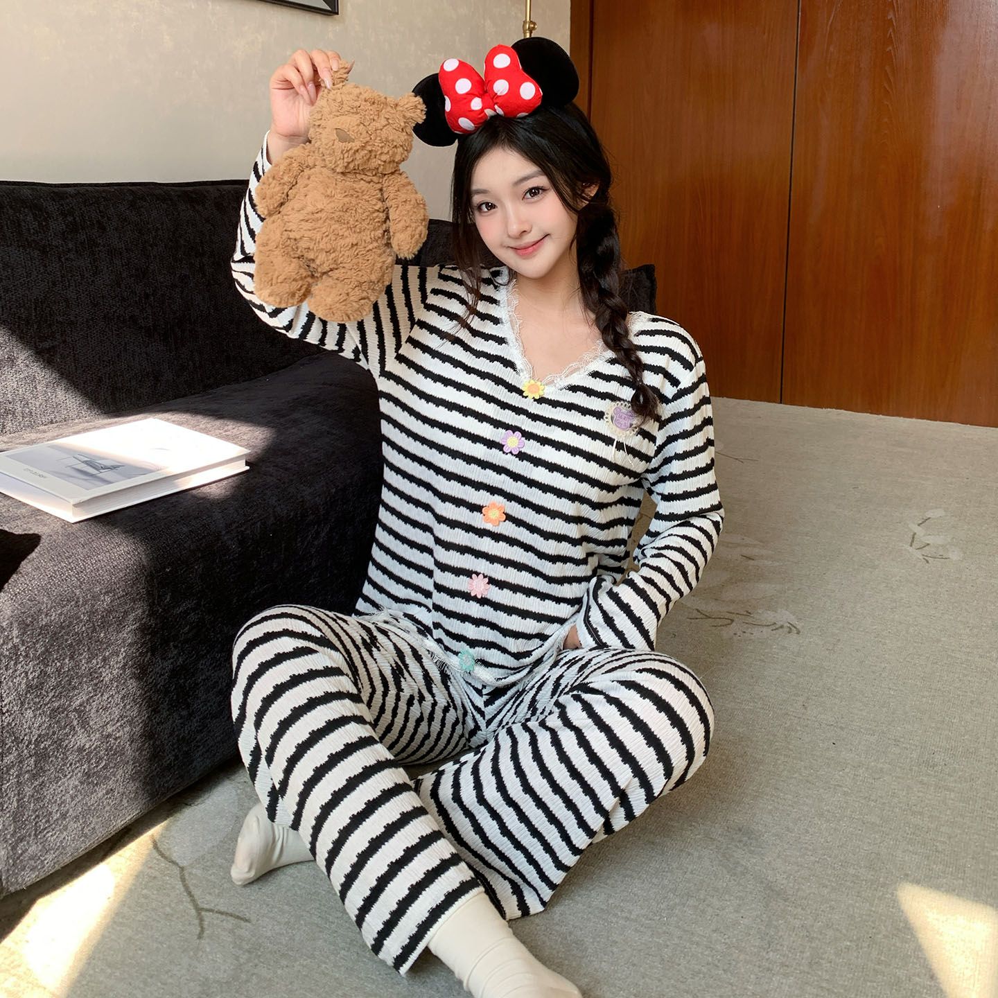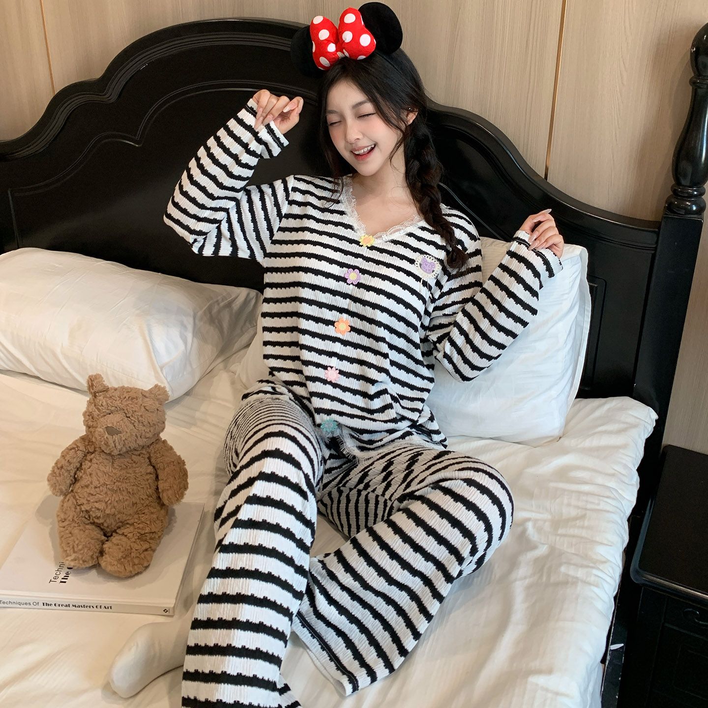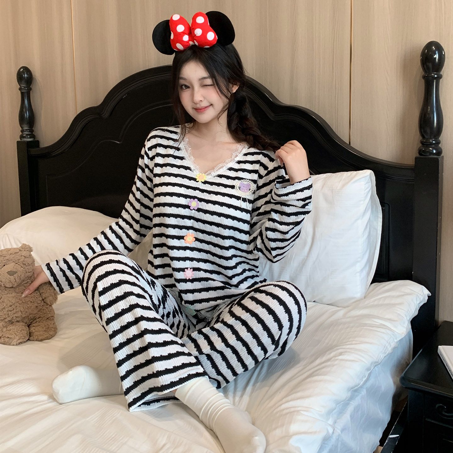BY10757# 新款带胸垫睡衣女色织甜美条纹蕾丝花边家居服 服裝批發女裝批發服飾貨源
