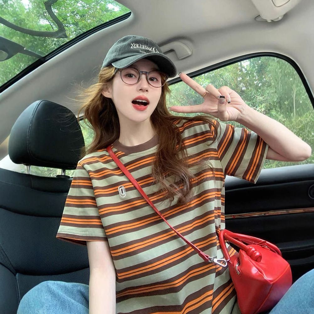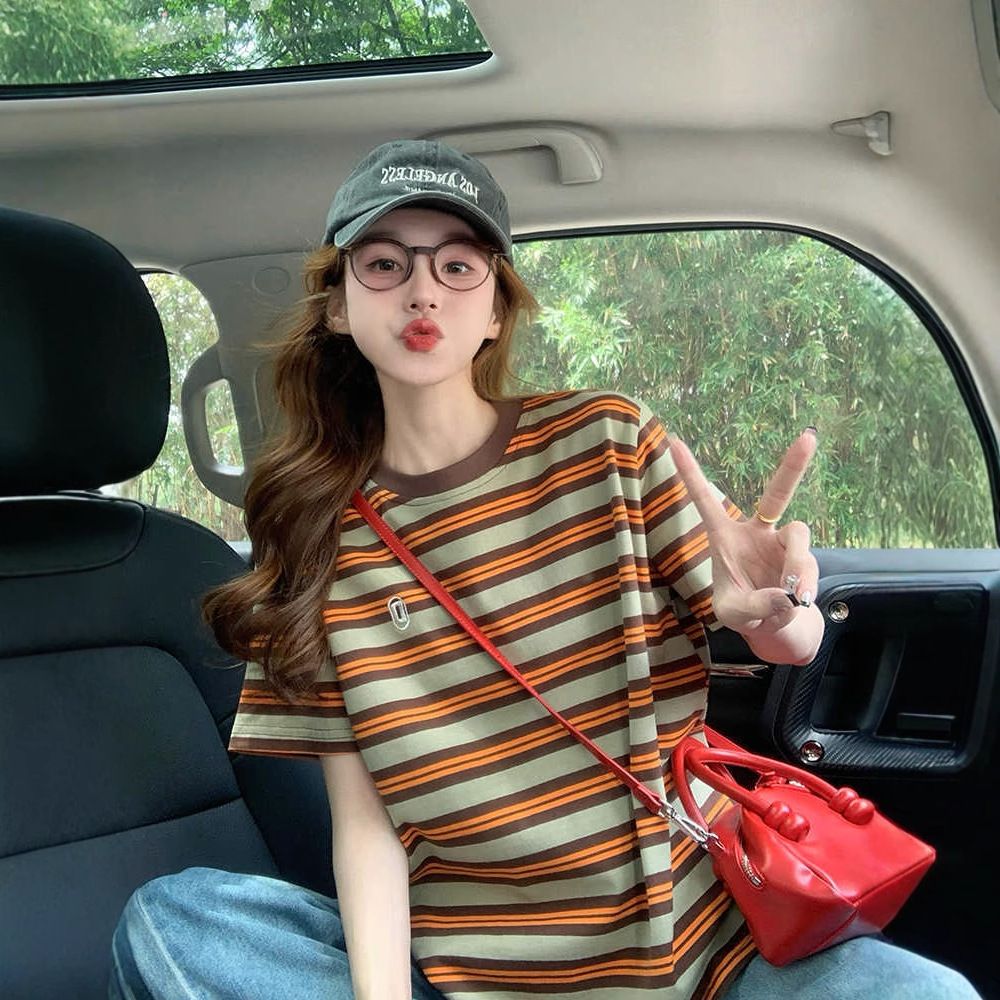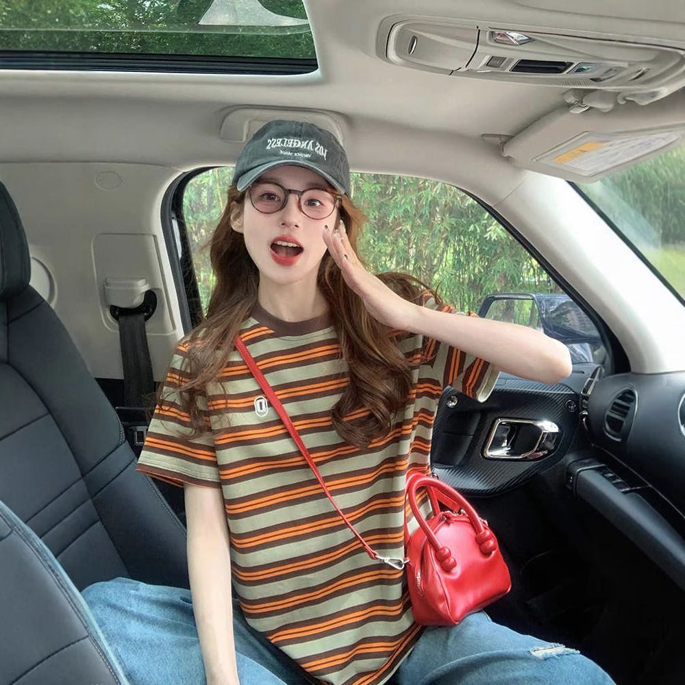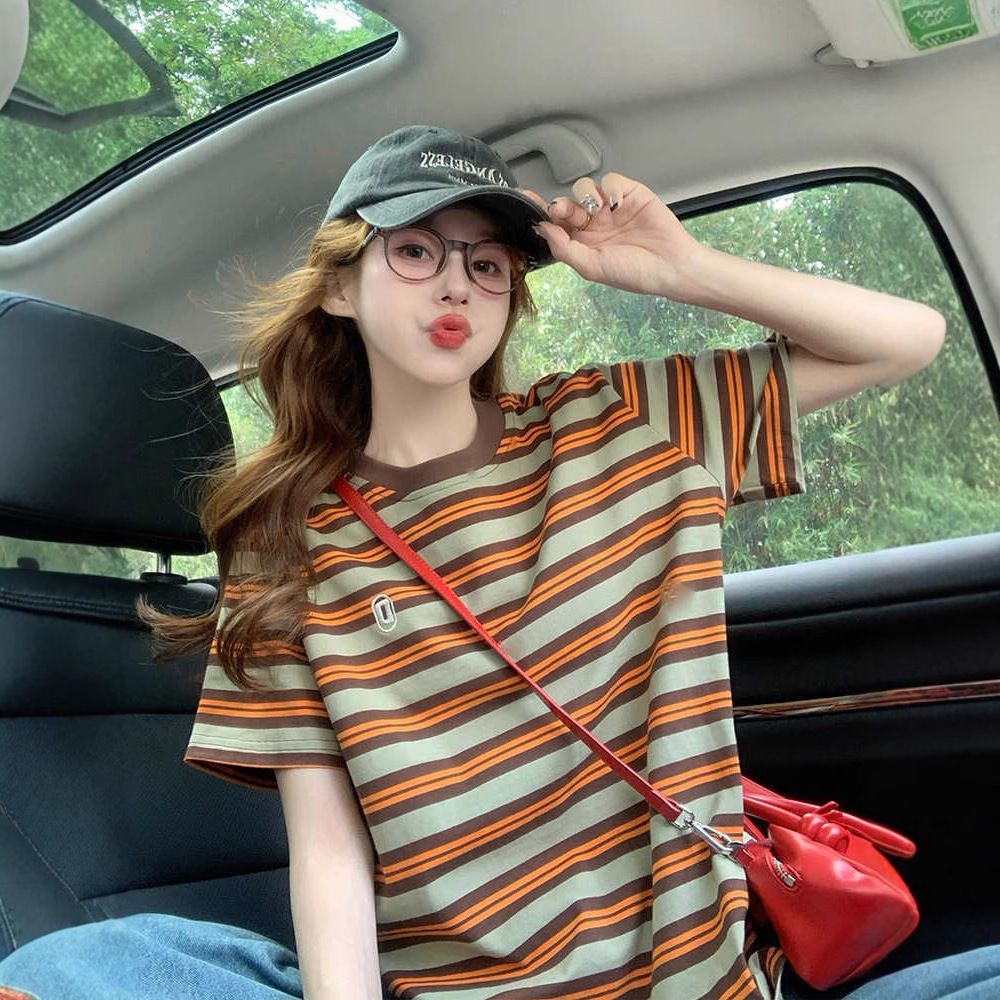 BY10782# 后包领撞色条纹宽松T恤女oversize卡通洋气中长款上衣 服裝批發女裝批發服飾貨源