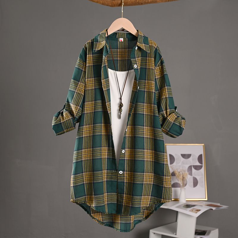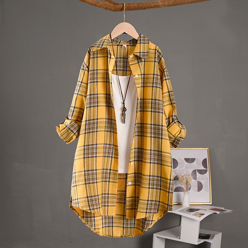 BY10793# 韩版外贸格子衬衫女薄款外套防晒衣宽松棉麻上衣外套中长款衬衣 服裝批發女裝批發服飾貨源