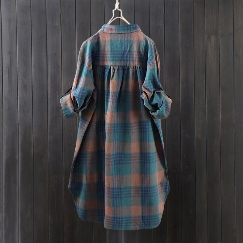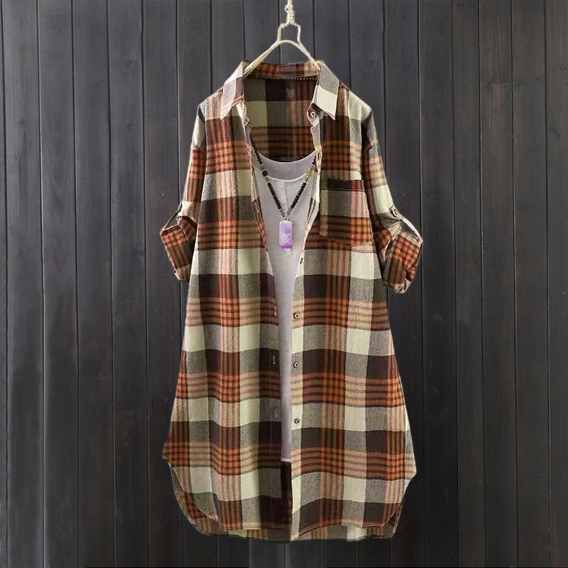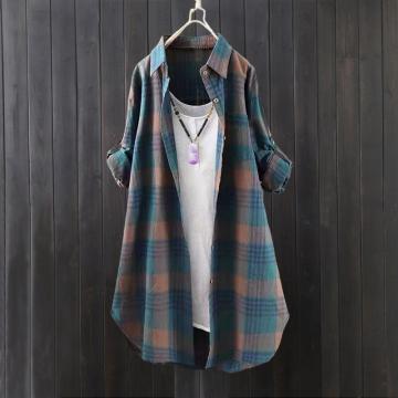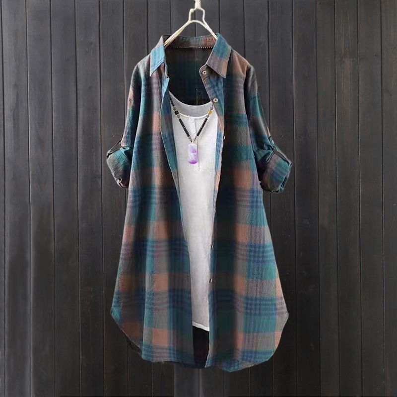 BY10796# 韩版棉麻格子衬衫女款薄外套宽松开衫中长款速卖通长袖衬衣 服裝批發女裝批發服飾貨源