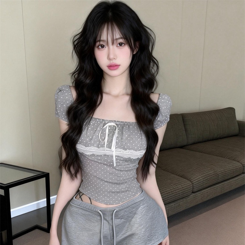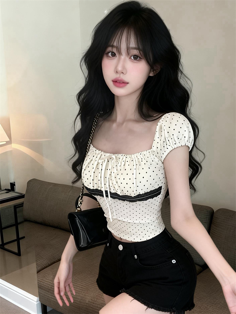 BY10813# 少女心波点方领蝴蝶结蕾丝拼接短袖T恤女修身显瘦上衣小衫 服裝批發女裝批發服飾貨源