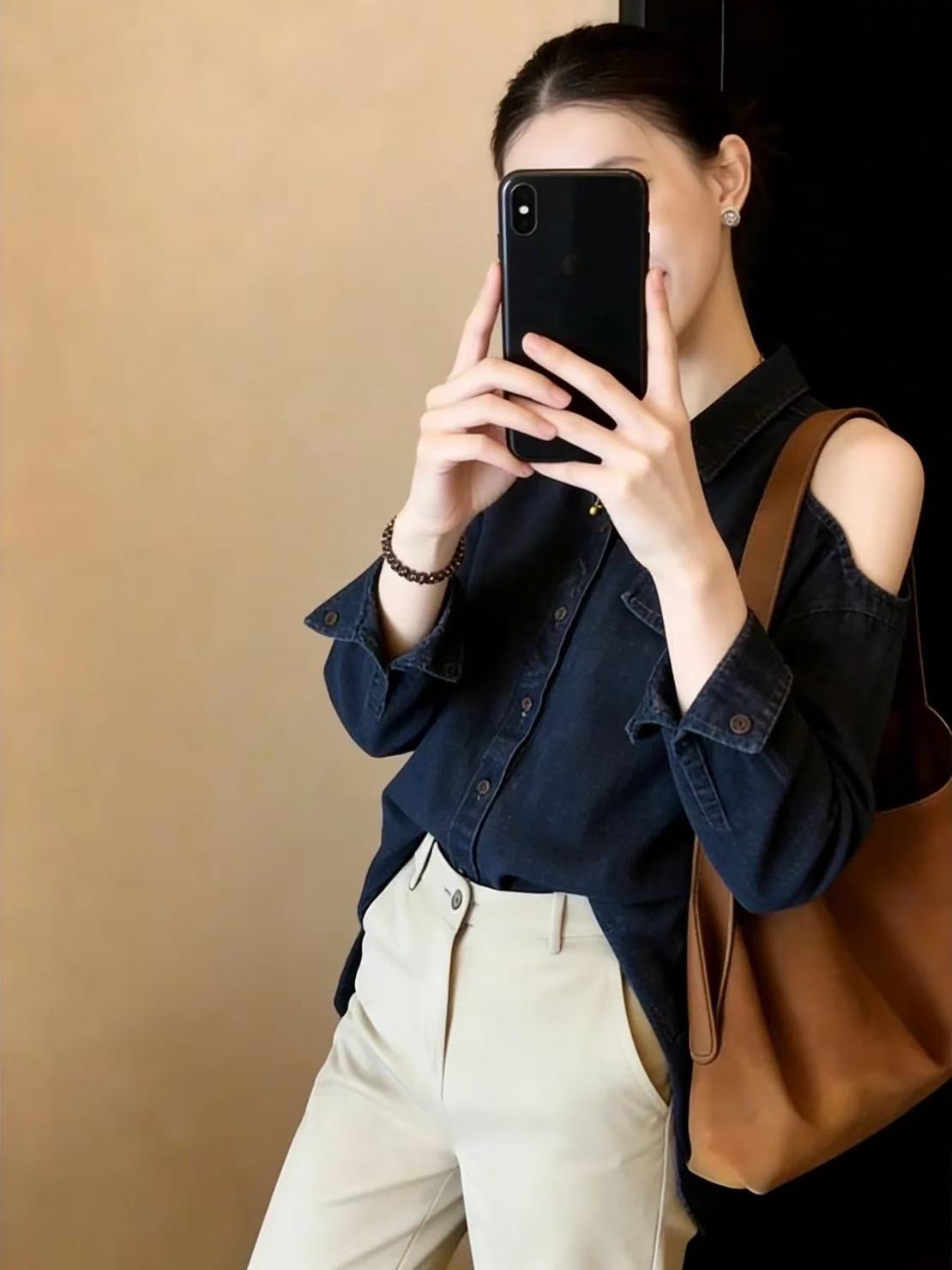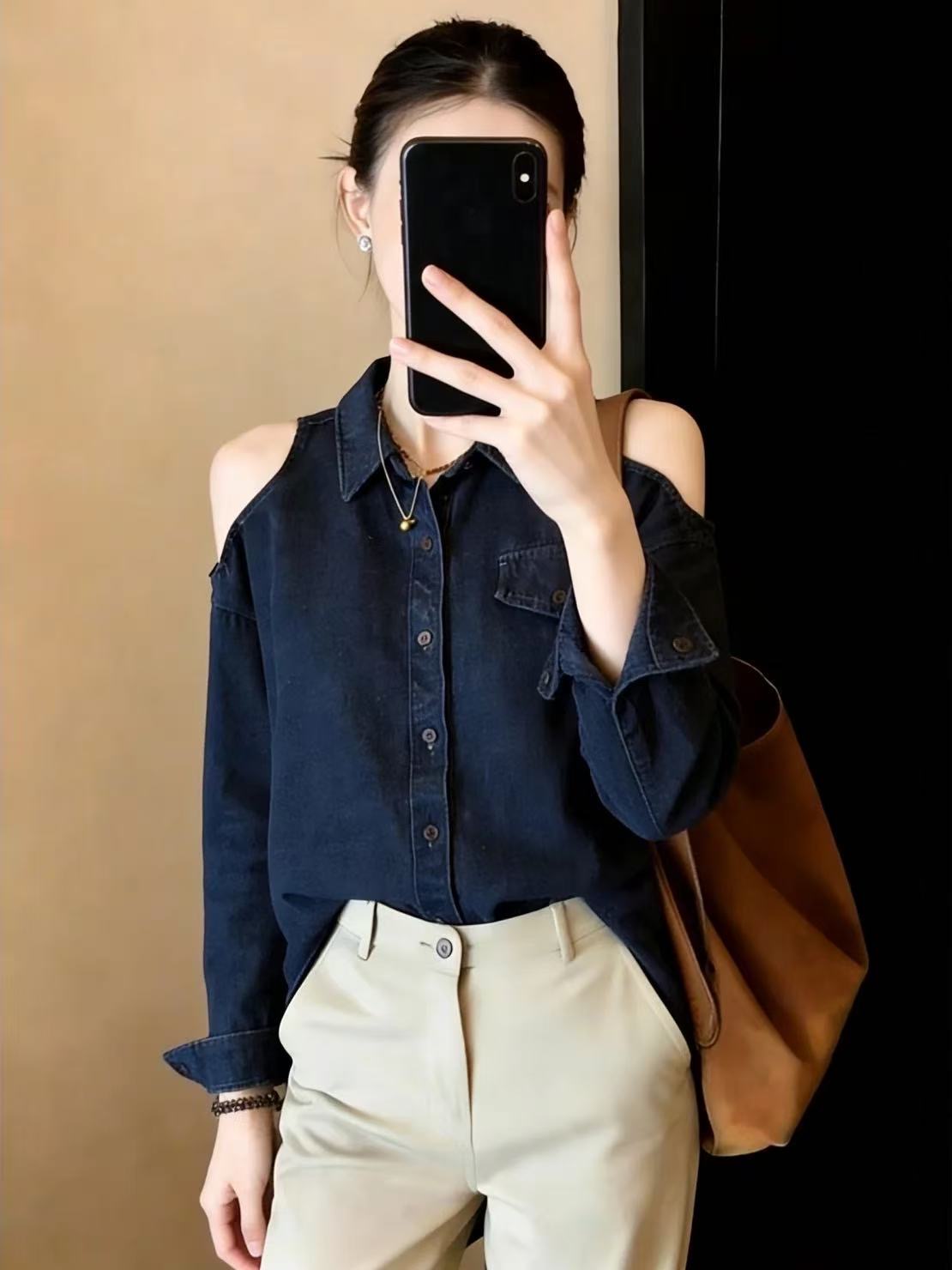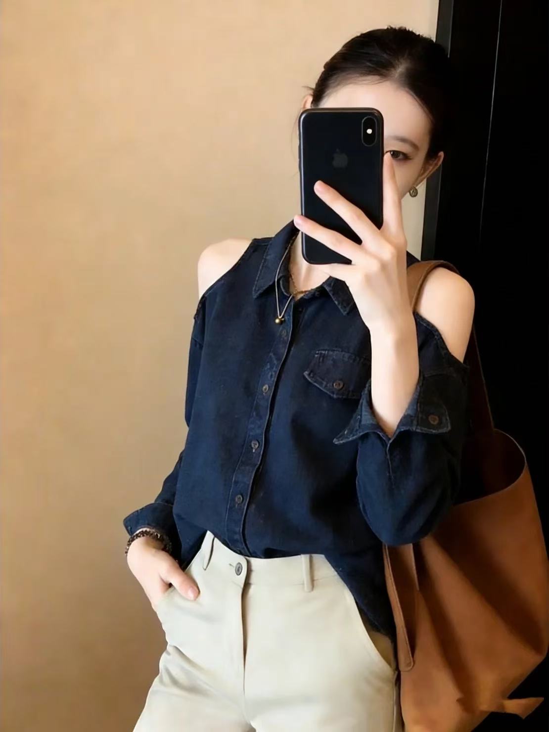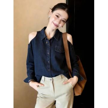 Home > 长袖雪纺衫、衬衫、上衣 > BY10829# 两边露肩牛仔长袖衬衫女新款春季大码胖mm轻奢高级感洋气上衣 服裝批發女裝批發服飾貨源