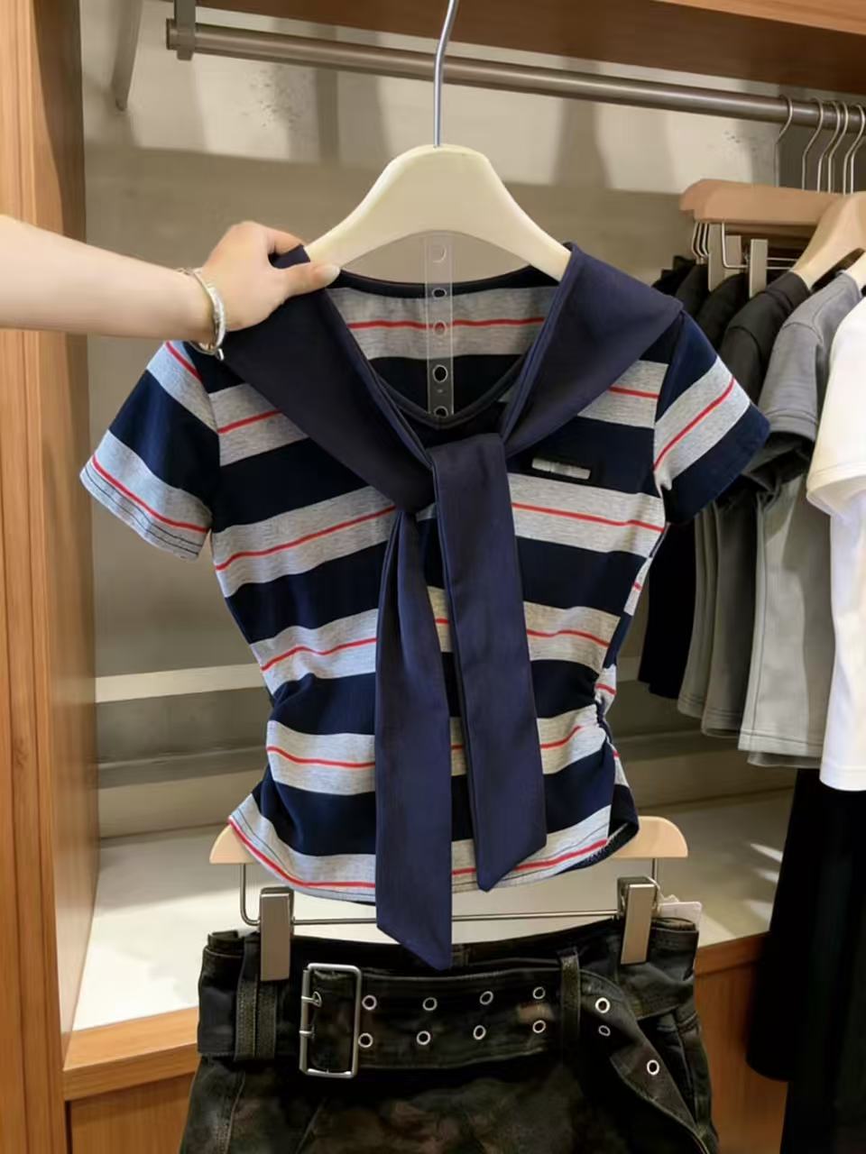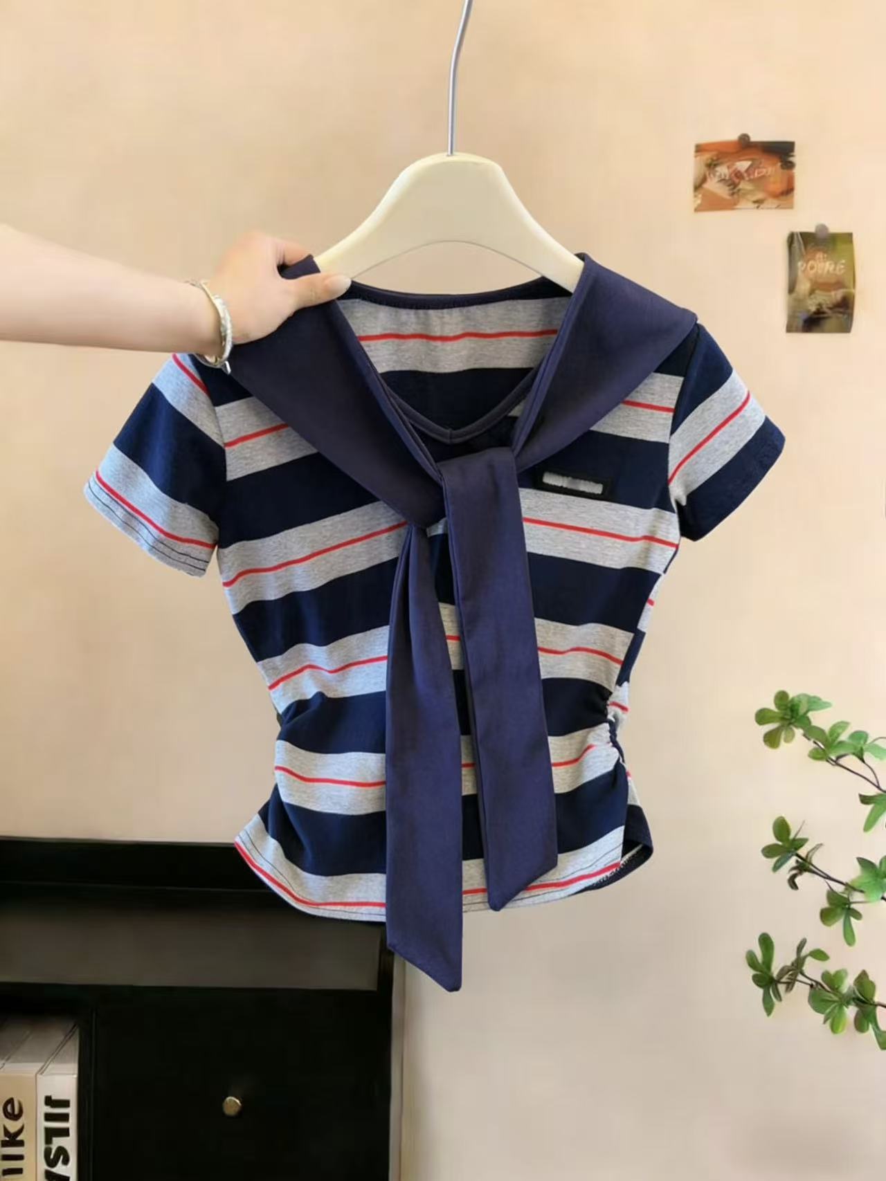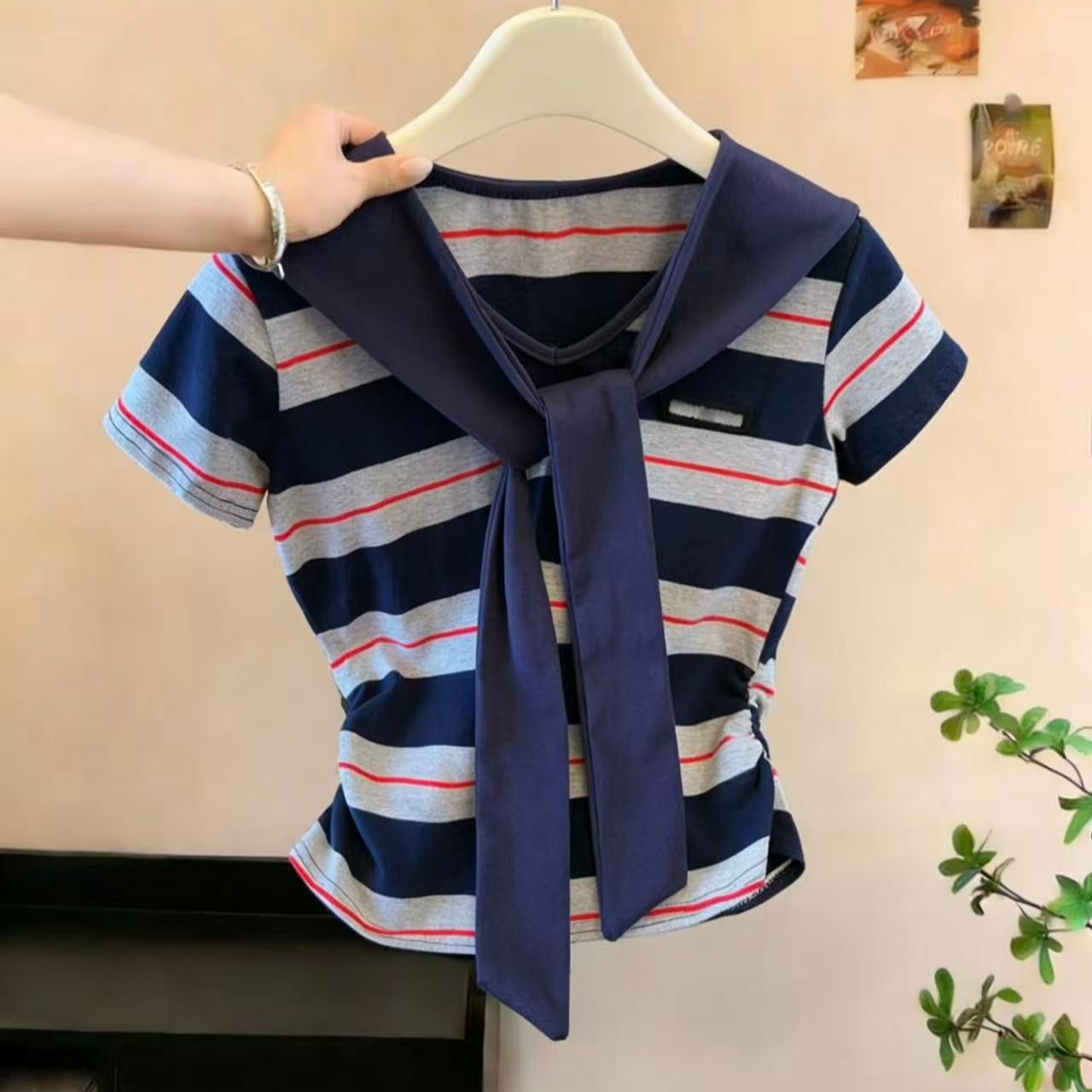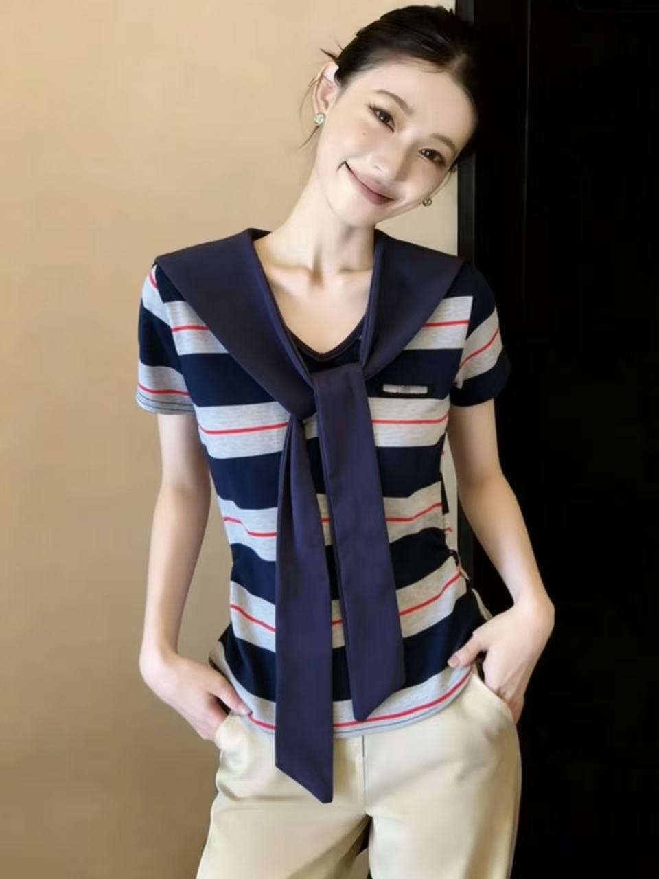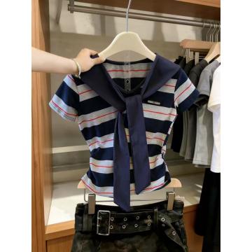 BY10837# 学院风条纹撞色海军领披肩假两件短袖T恤女设计感小个子上衣 服裝批發女裝批發服飾貨源