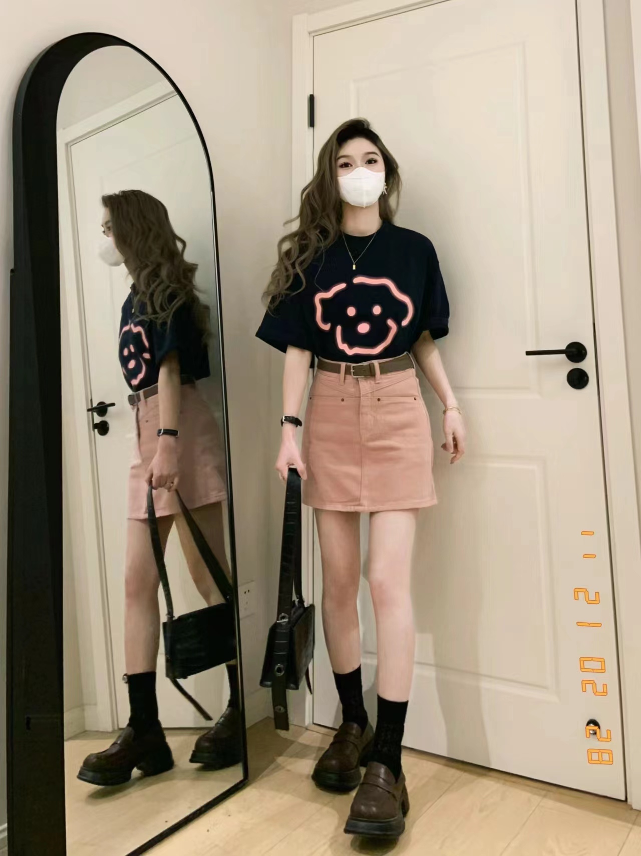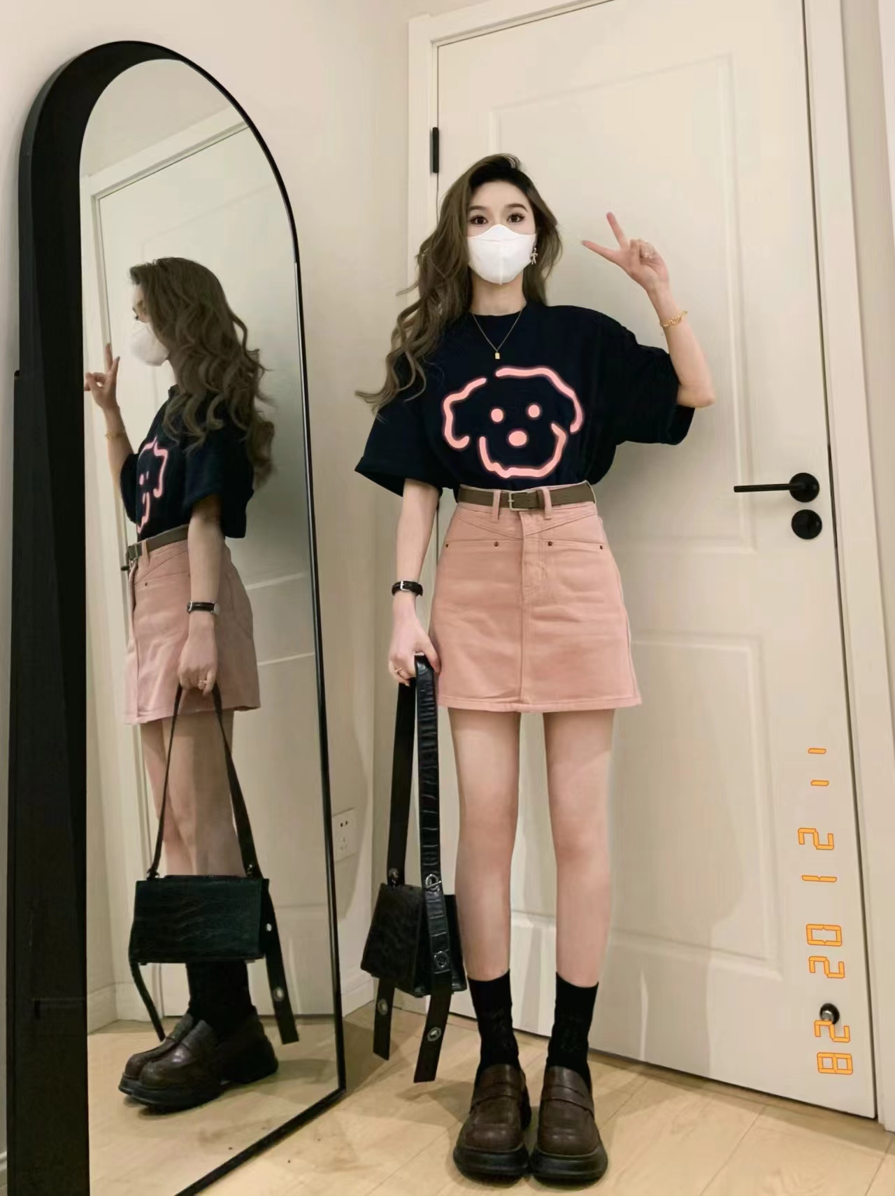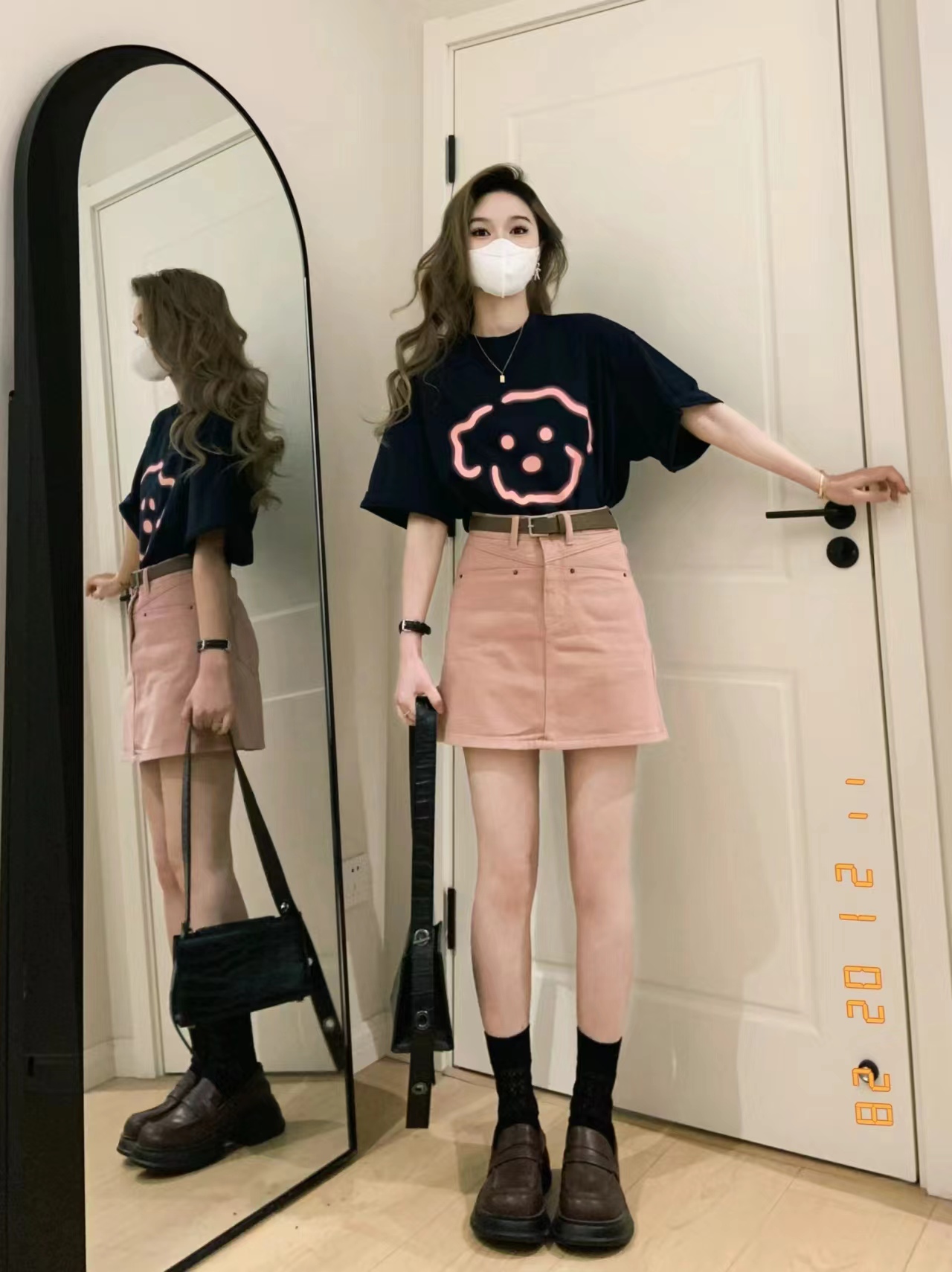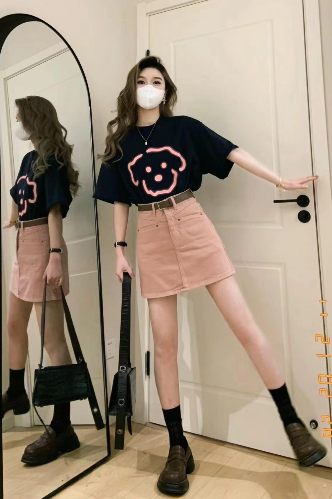 BY10867# 夏季短袖t恤女粉色高腰牛仔半身裙两件套装韩版甜辣港风奶系穿搭 服裝批發女裝批發服飾貨源