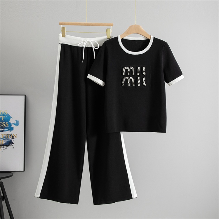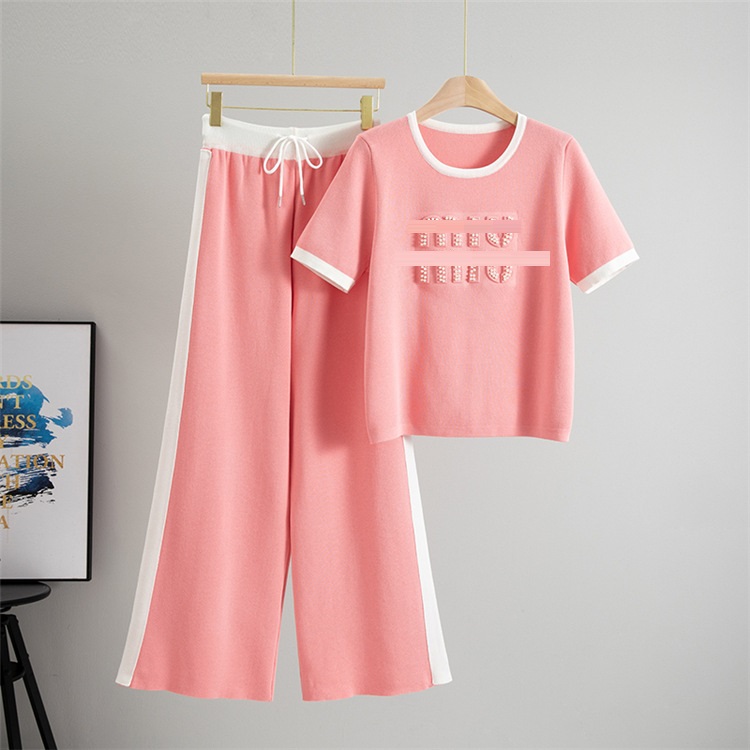 Home > 韩版套装 > BY10938# 跨境名媛气质夏季新款女套装短袖时尚钉珠针织衫上衣+高腰休闲长 服裝批發女裝批發服飾貨源