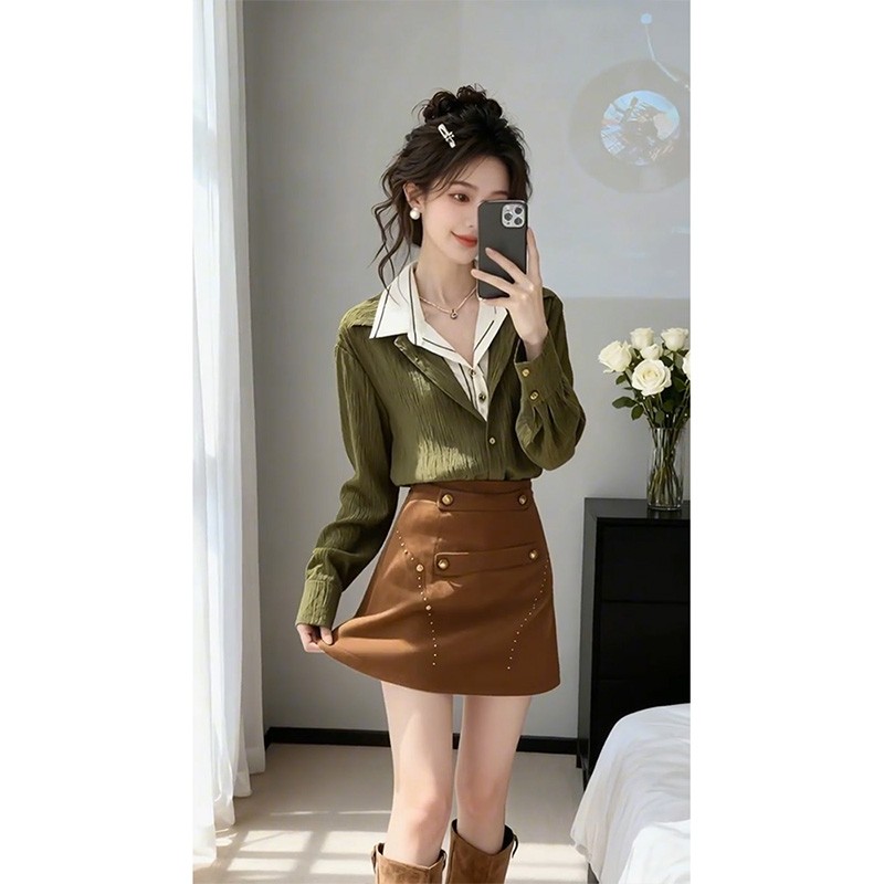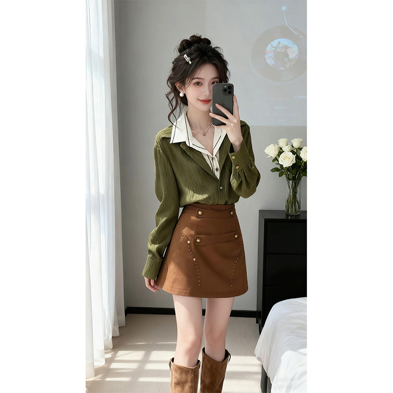 法式轻熟风绿色假两件长袖衬衫上衣高腰显瘦半身裙套装 服裝批發女裝批發服飾貨源