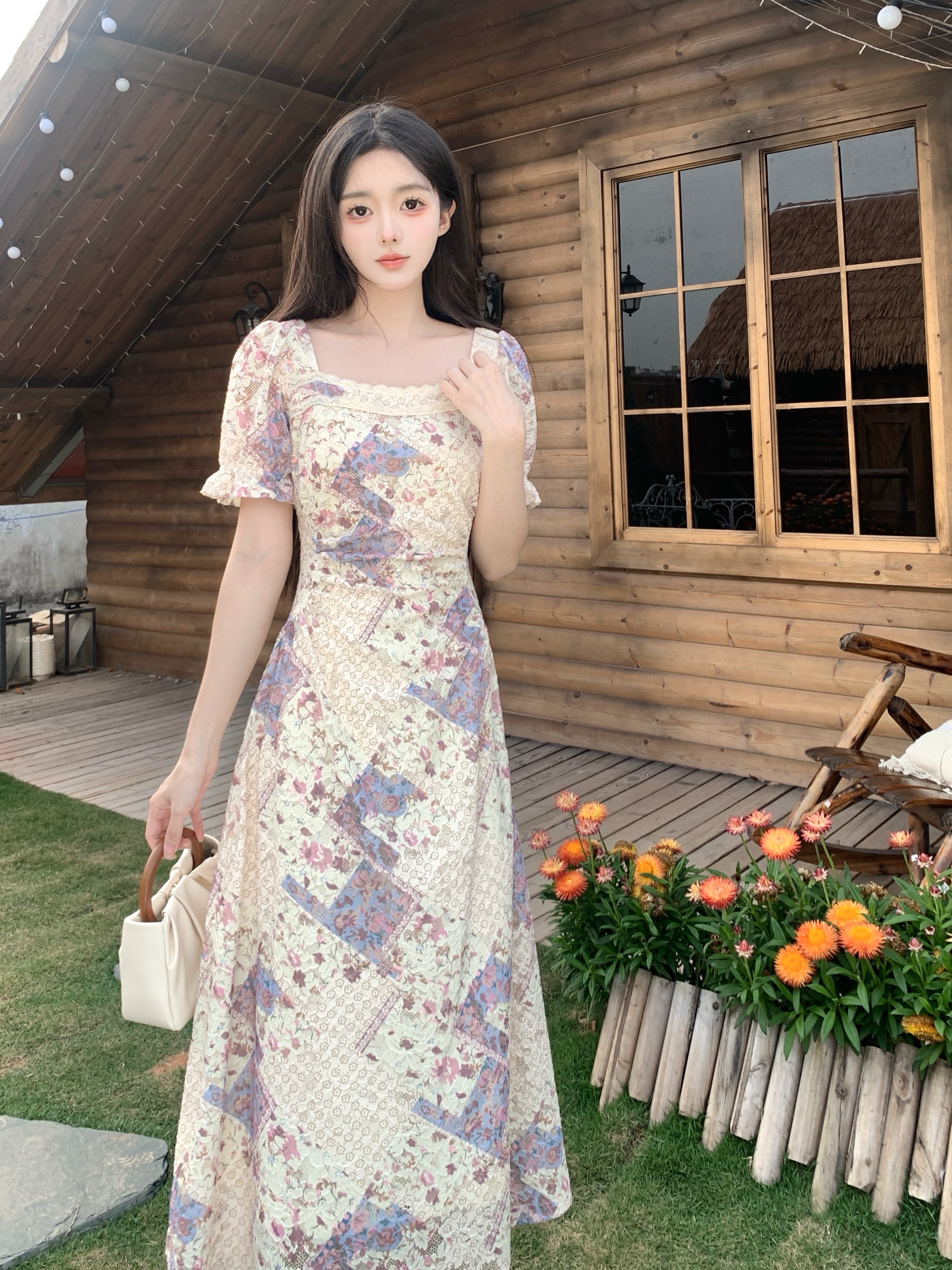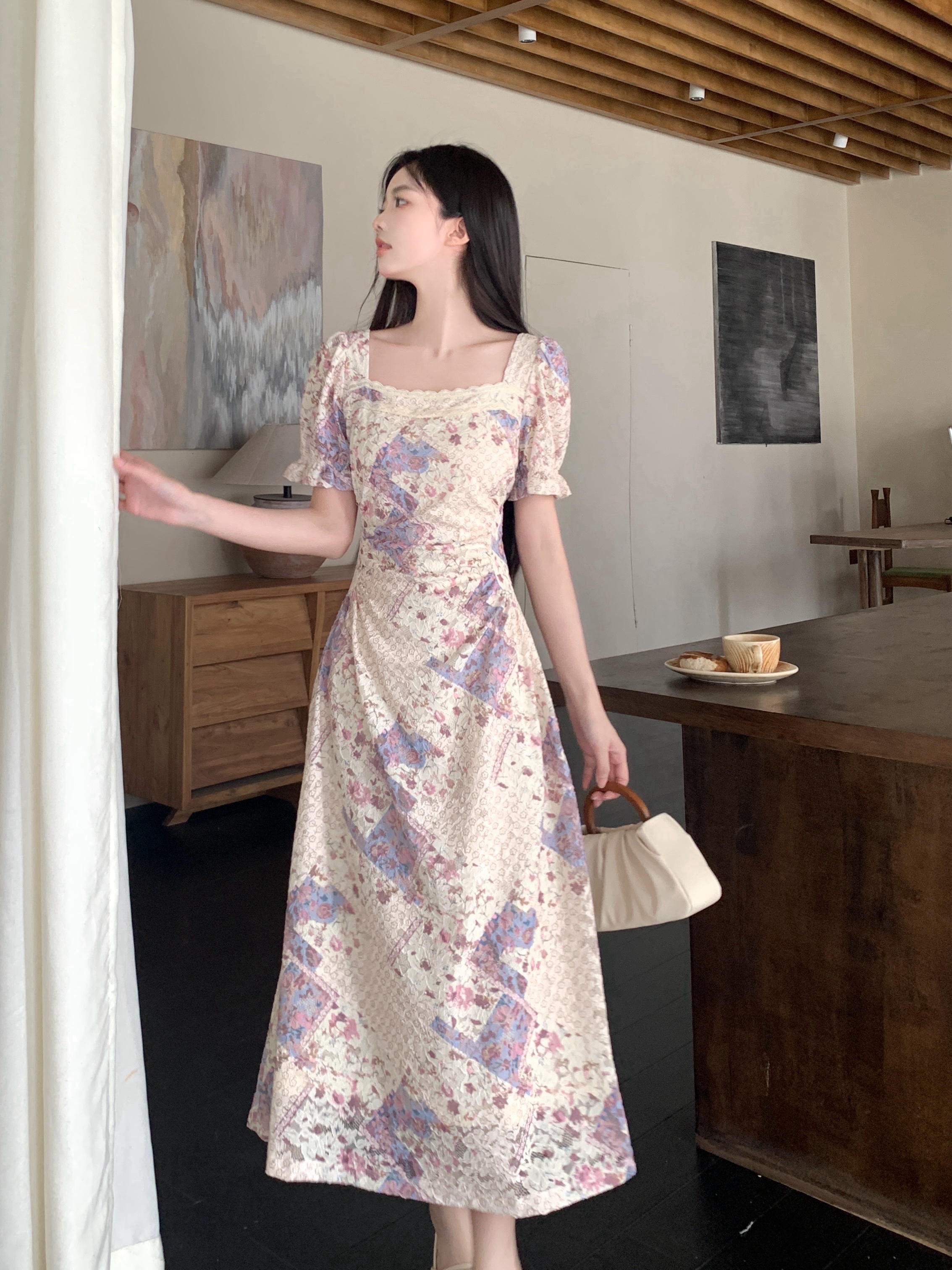 大码女装碎花蕾丝收腰连衣裙夏法式高级感轻奢长裙 服裝批發女裝批發服飾貨源